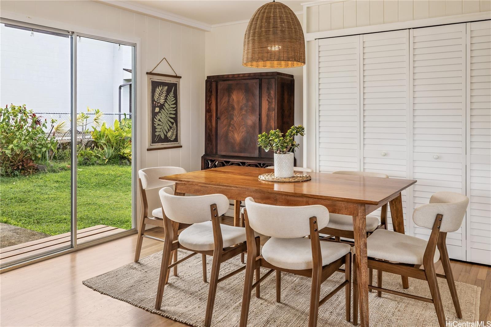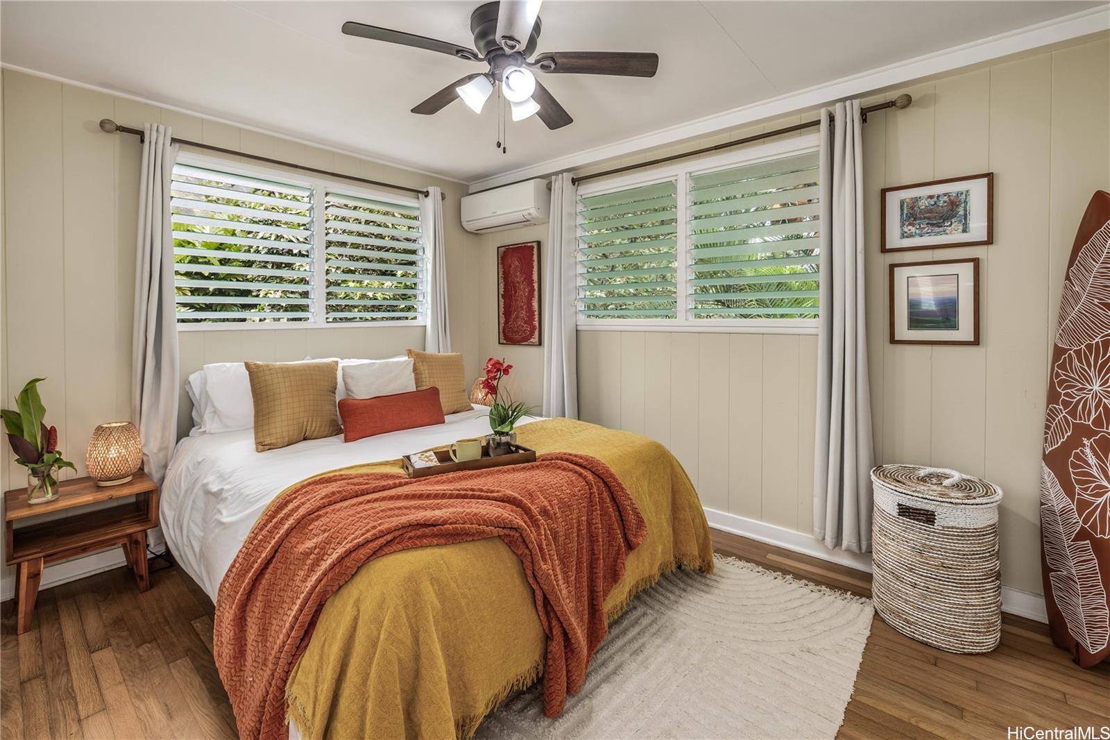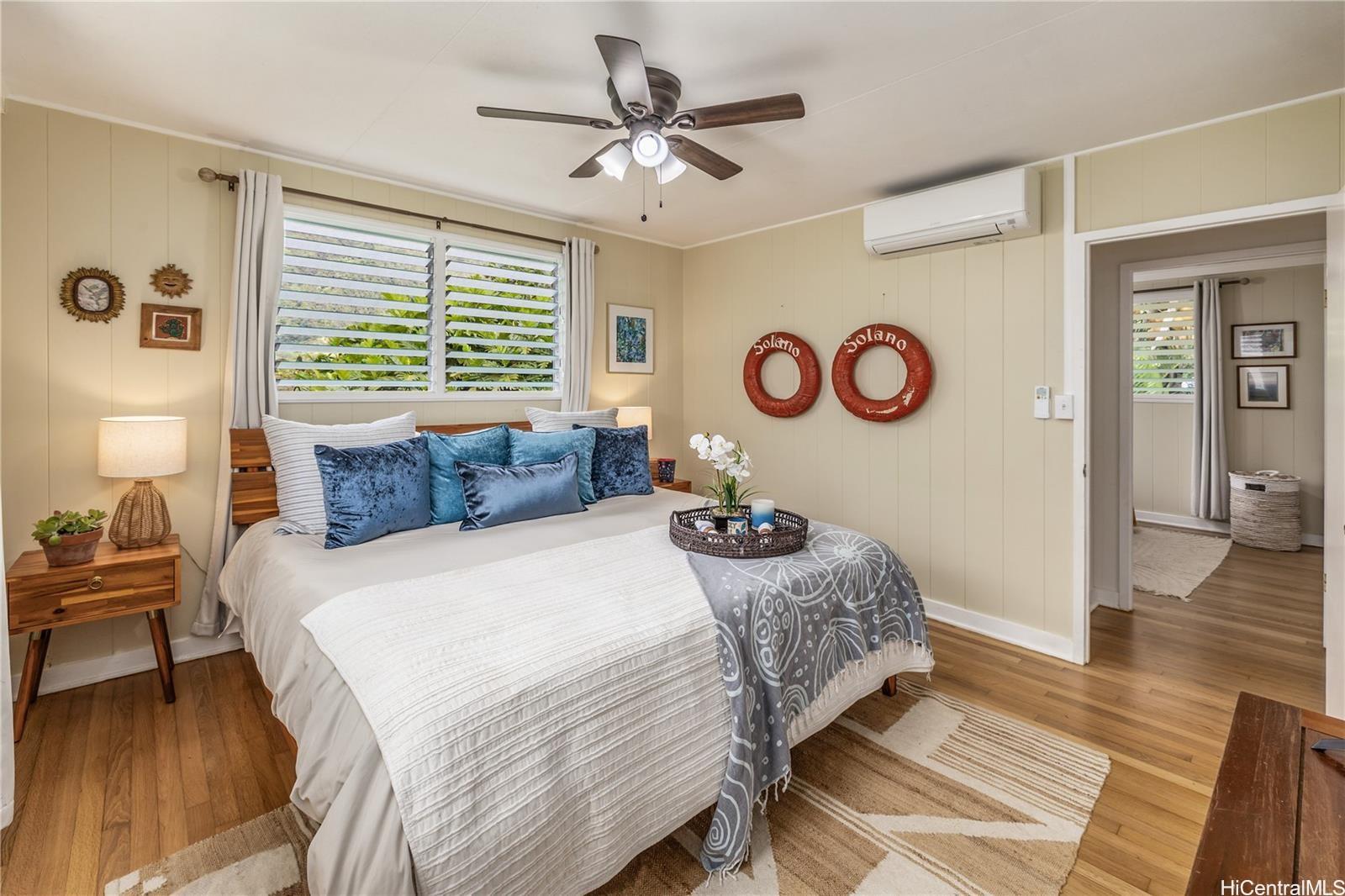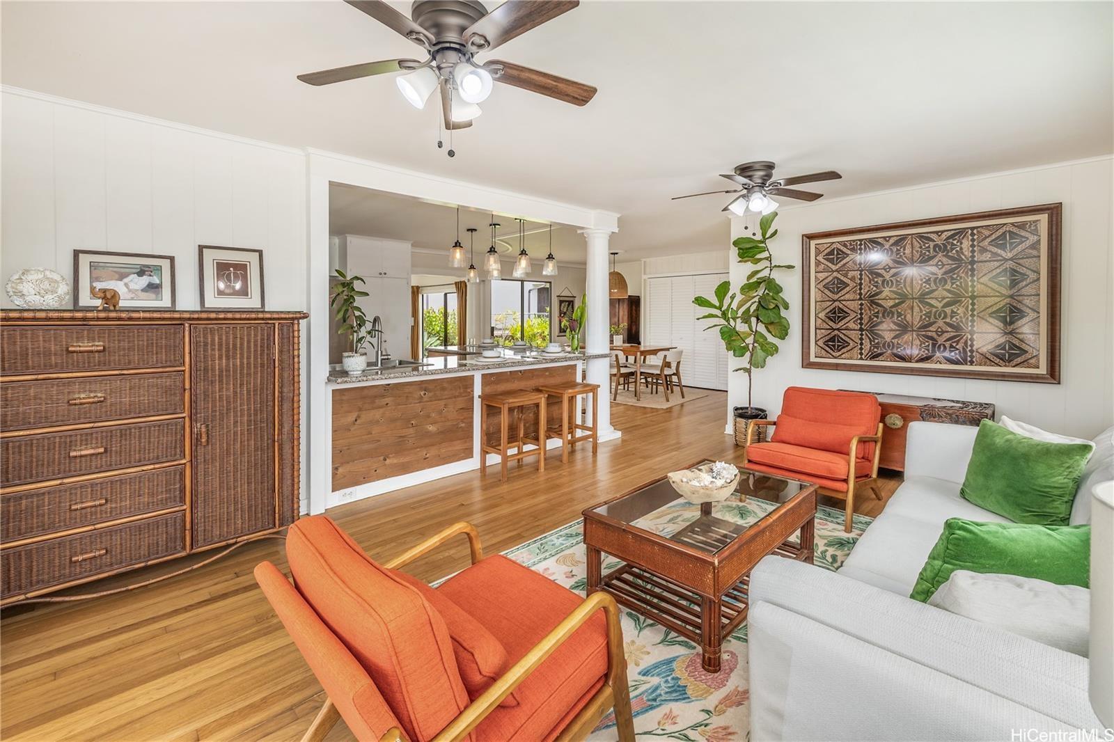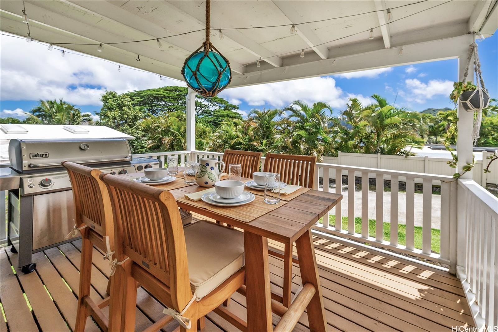 Gorgeous Ko`olau mountain views from this double sized property! The expansive, fenced, lush backyard features fruiting avocado and ulu trees. Two lots, which were purchased separately, were recently combined, creating one TMK. The wonderful front covered lanai opens to the living room and kitchen, perfect for indoor/outdoor living. The kitchen, in the heart of the home, offers expansive countertop seating for 5, a separate dining area, and views into the living room. The entertainment room is just off the kitchen area with large windows and a sliding door to the vibrant backyard. The main primary bedroom suite is on the top floor with incredible views of the striking mountains from the large windows, a high ceiling, split AC, ceiling fan, and en-suite bath. The main level features hardwood floors, great breezes, a second primary bedroom suite with an en-suite bath and walk-in closet, and two other bedrooms, all of which have split AC, hardwood floors, and ceiling fans. This wonderful home is conveniently located close to Kaneohe town, Kailua beaches, a dog park, Windward Mall, Le Jardin Academy, freeway access, and beautiful Ho`omaluhia Botanical Gardens. A must-see home!