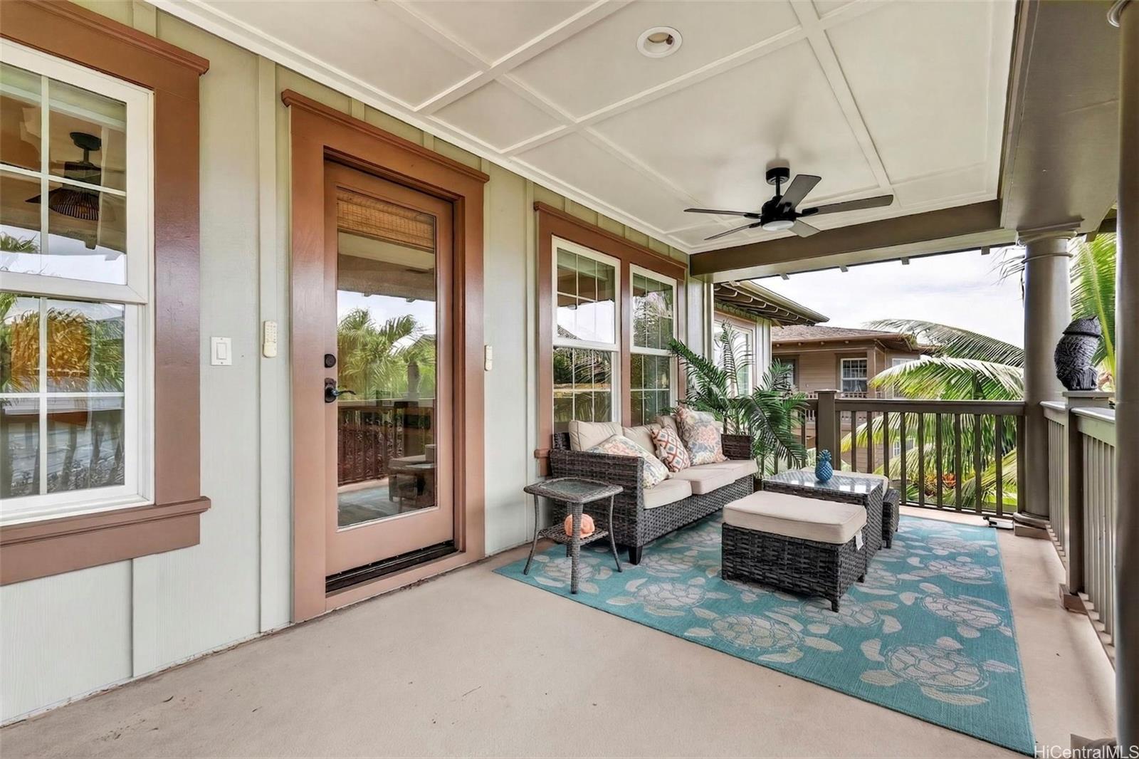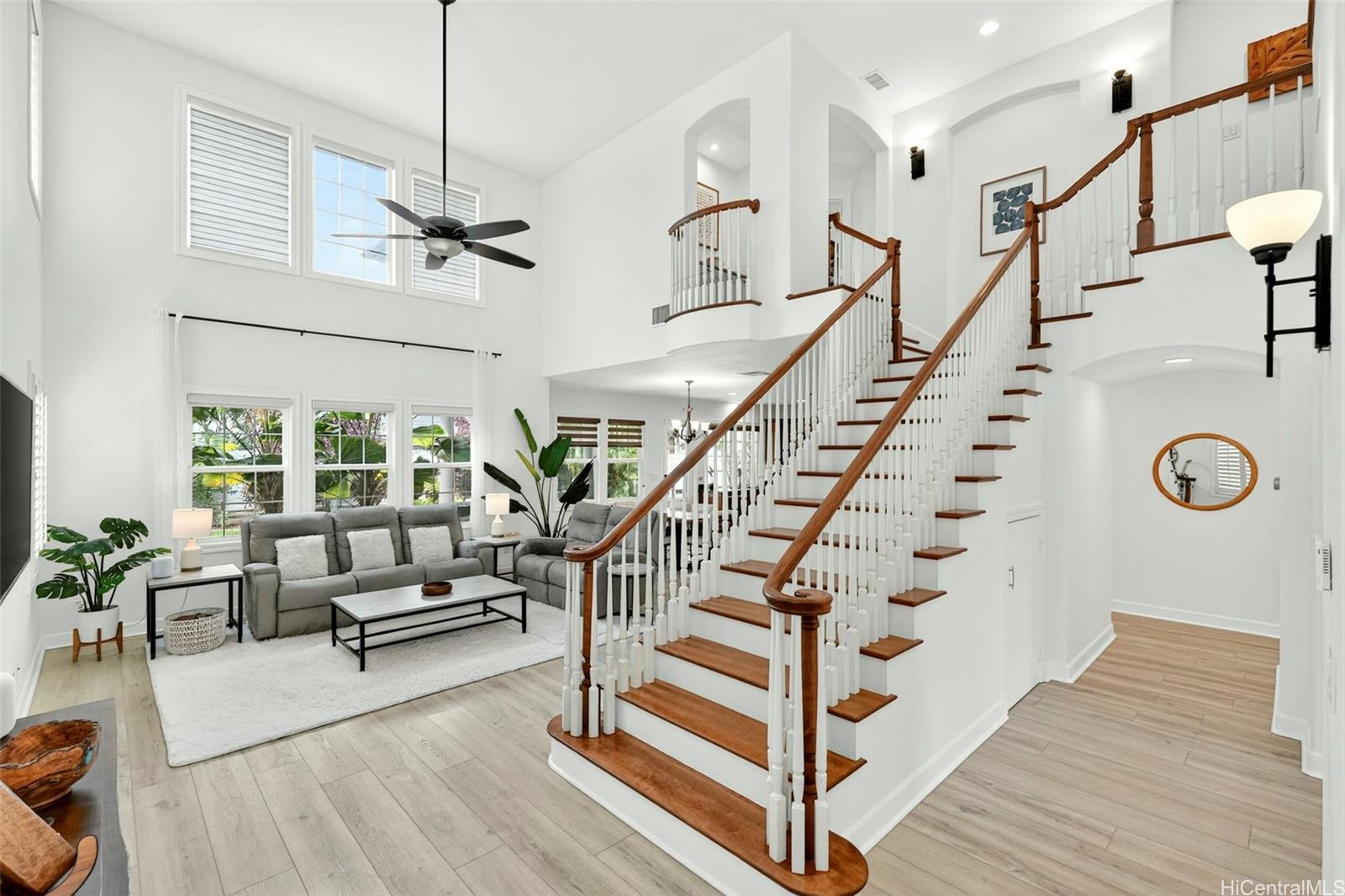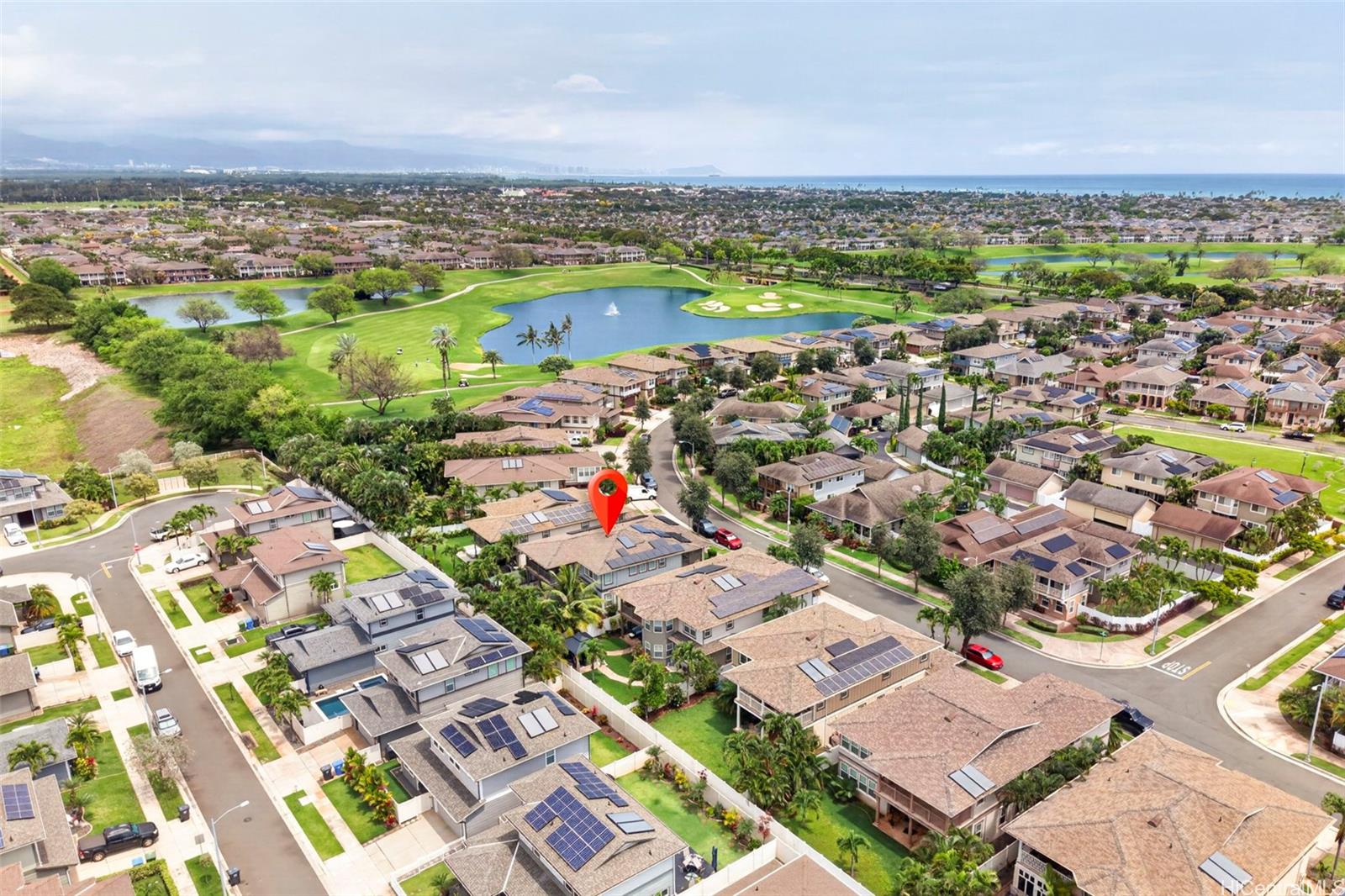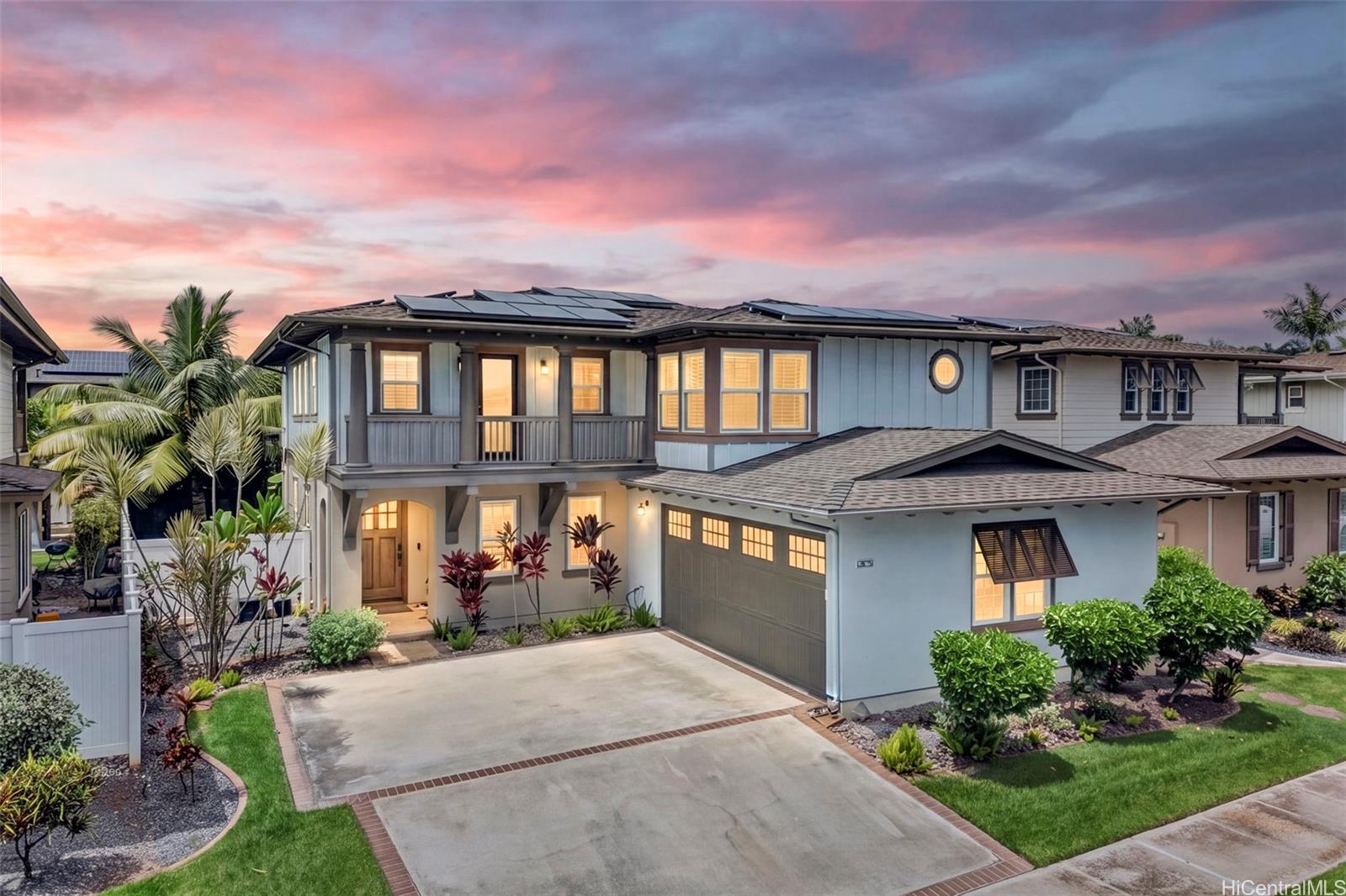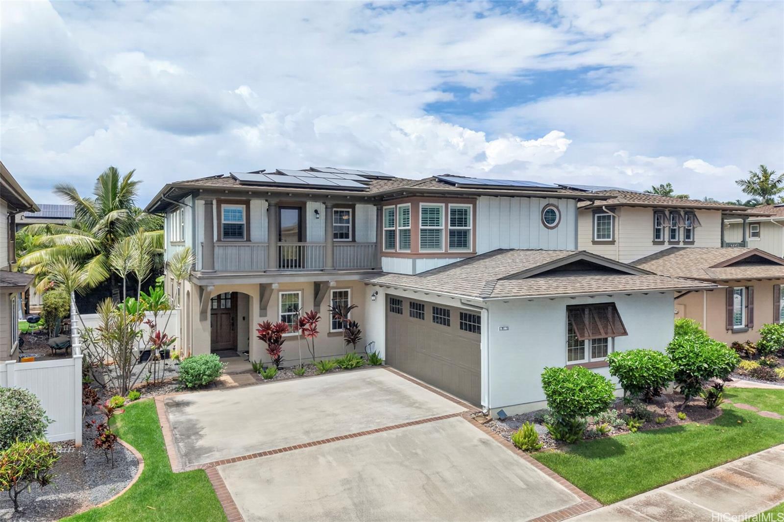 Discover this pristine 60.10 model in Ka Makana at Hoakalei. Upon entry you’re welcomed by a grand staircase and soaring ceilings in the living area allowing abundant natural light to fill the space. The main level features an open concept kitchen, dining and living area along with a bedroom complete with an ensuite full bath, a versatile bonus room ideal for an office and a half bath for guests. Upstairs, the spacious primary suite is thoughtfully separated from the guest bedrooms and features a tray ceiling that enhances the airy feel. The primary bathroom offers dual vanities, a soaking tub, walk-in shower and two closets. Two additional bedrooms and a full hallway bathroom complete the upper level. This home is equipped with high-end Viking appliances including a Sub-Zero refrigerator, 32 owned photovoltaic panels on net metering and two Tesla batteries to keep electricity costs low. Monthly dues include cable, internet and phone, plus access to the swim club, fitness center, pickleball courts, and lush green spaces. Conveniently located near Hoakalei Country Club, Wai Kai, and Ka Makana Ali’i Mall, dining, shopping and more are just minutes away!