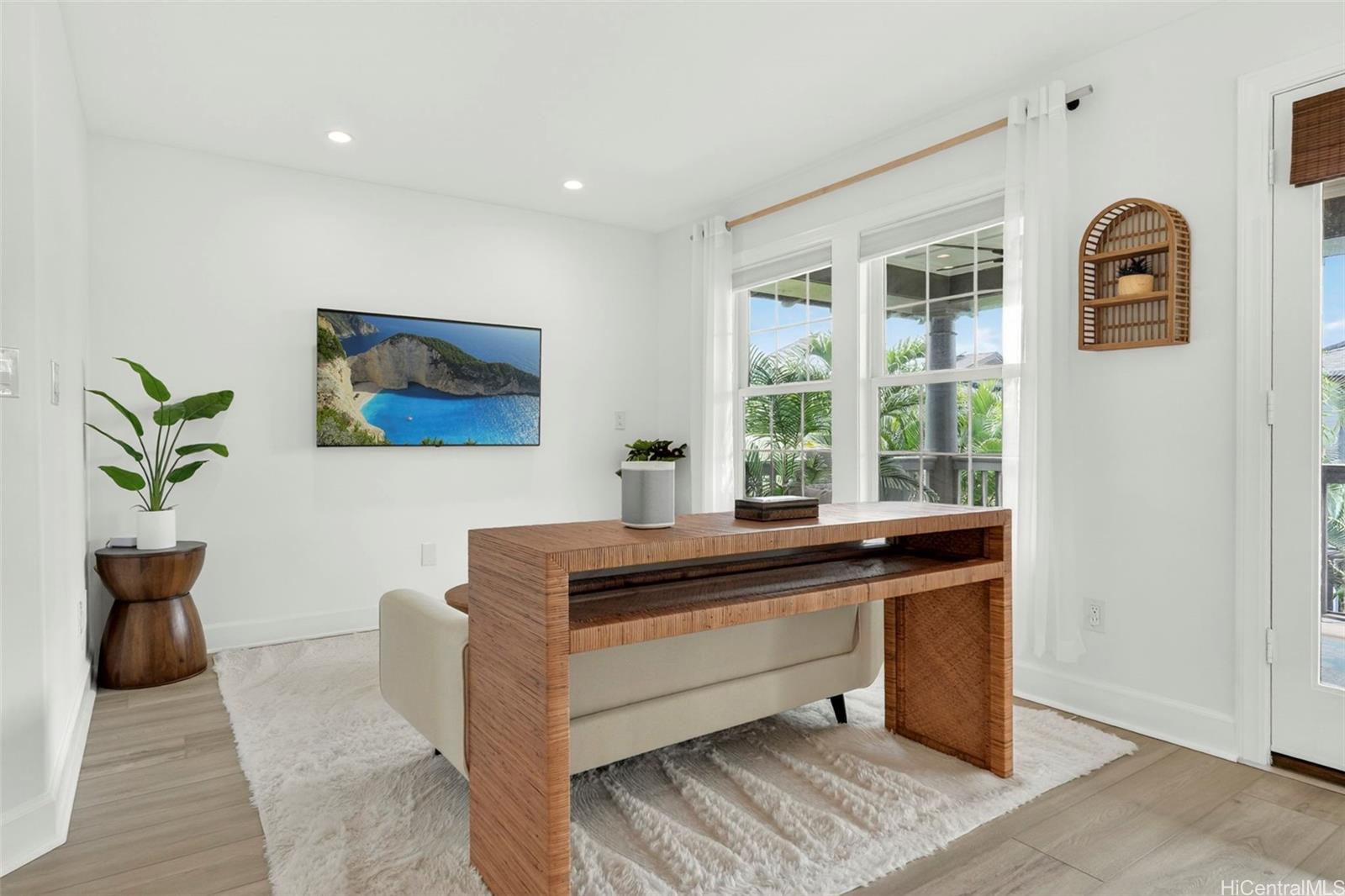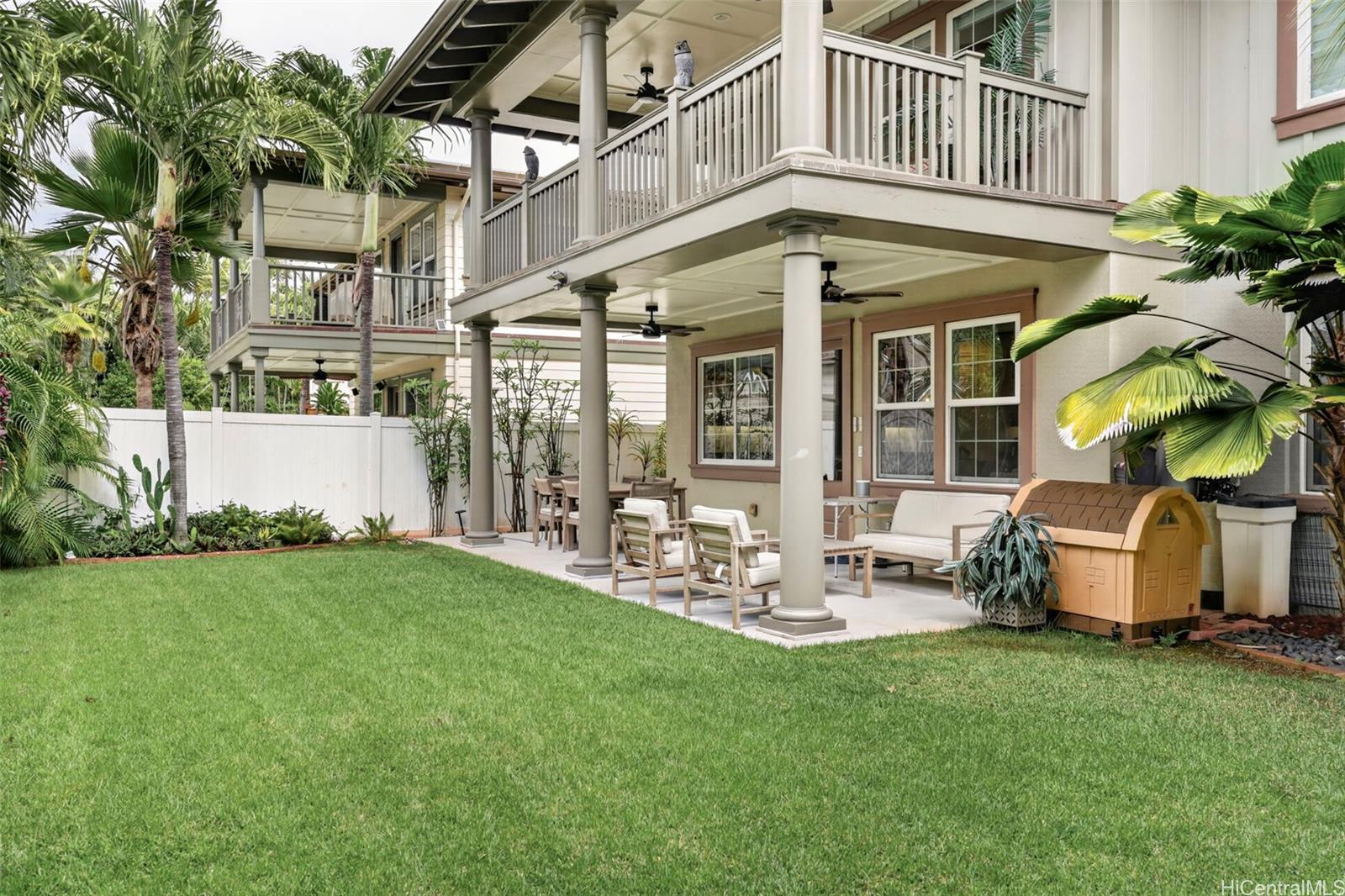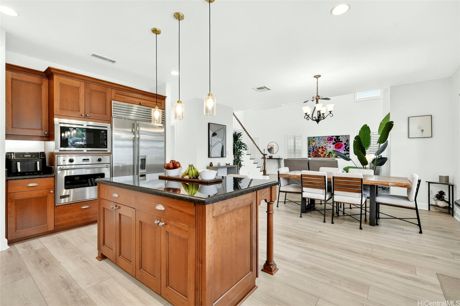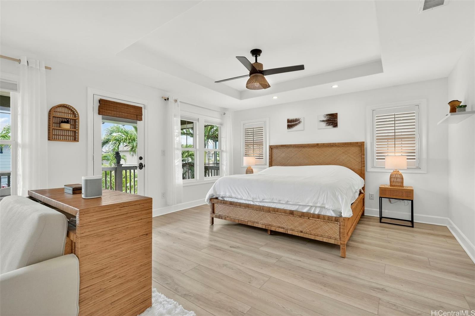 Discover this pristine 60.10 model in Ka Makana at Hoakalei. Upon entry you’re welcomed by a grand staircase and soaring ceilings in the living area allowing abundant natural light to fill the space. The main level features an open concept kitchen, dining and living area along with a bedroom complete with an ensuite full bath, a versatile bonus room ideal for an office and a half bath for guests. Upstairs, the spacious primary suite is thoughtfully separated from the guest bedrooms and features a tray ceiling that enhances the airy feel. The primary bathroom offers dual vanities, a soaking tub, walk-in shower and two closets. Two additional bedrooms and a full hallway bathroom complete the upper level. This home is equipped with high-end Viking appliances including a Sub-Zero refrigerator, 32 owned photovoltaic panels on net metering and two Tesla batteries to keep electricity costs low. Monthly dues include cable, internet and phone, plus access to the swim club, fitness center, pickleball courts, and lush green spaces. Conveniently located near Hoakalei Country Club, Wai Kai, and Ka Makana Ali’i Mall, dining, shopping and more are just minutes away!