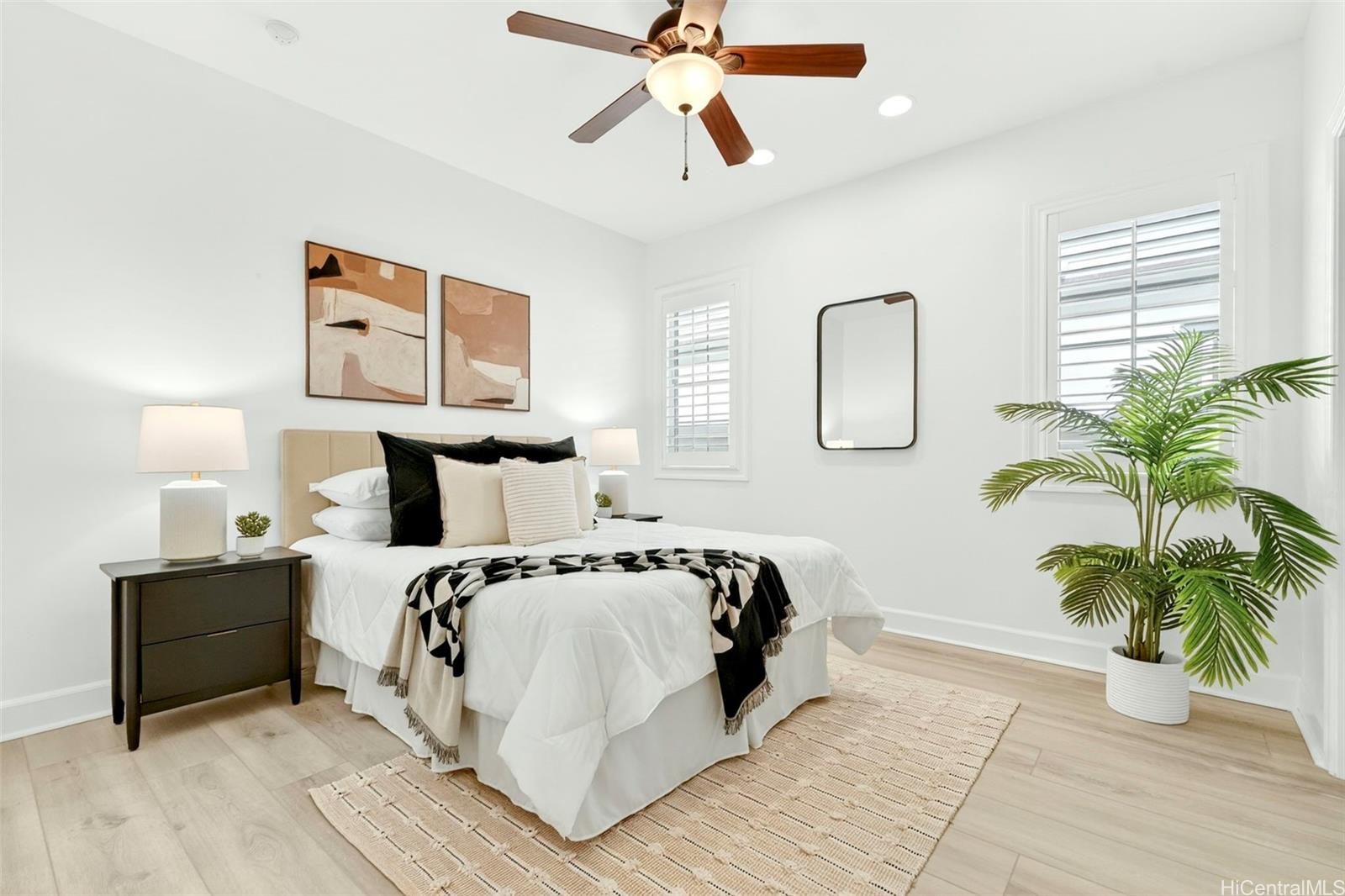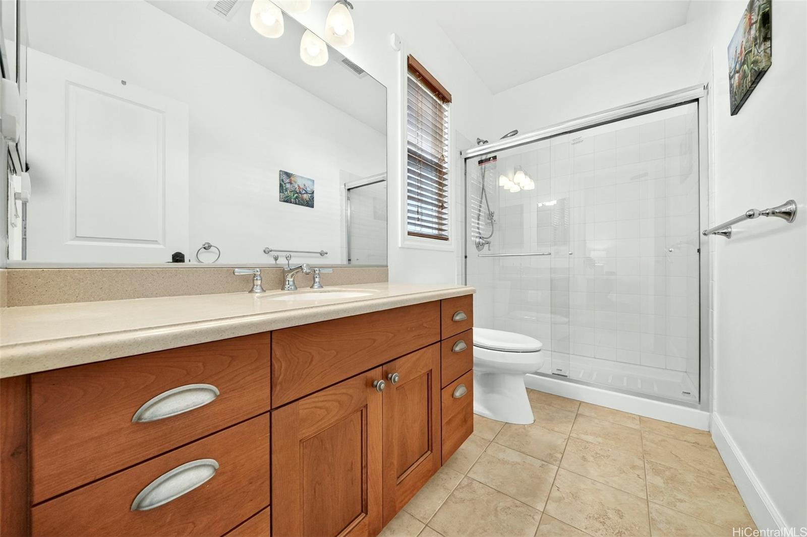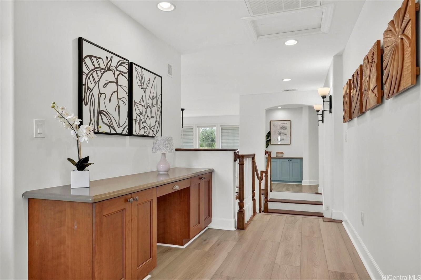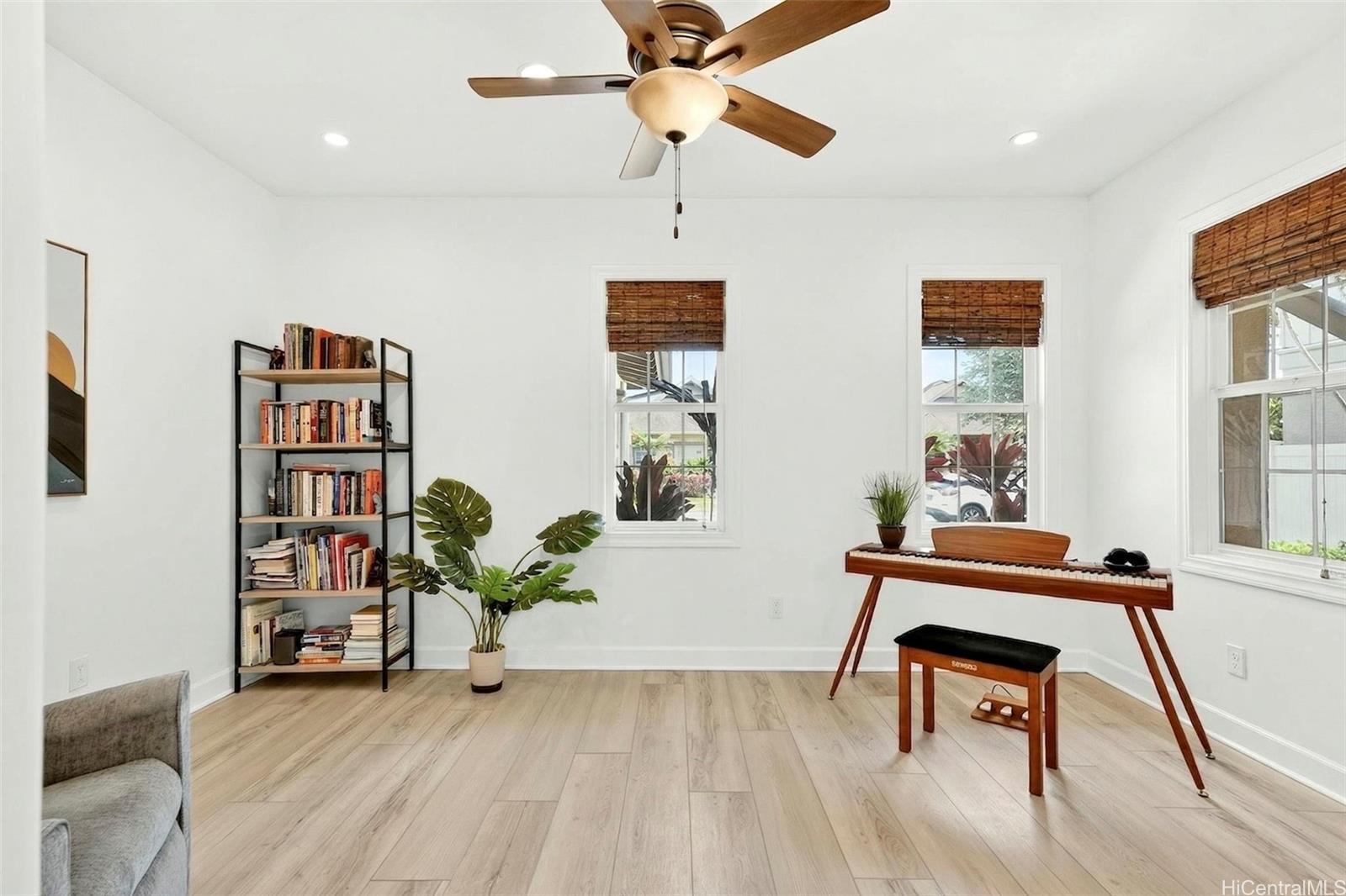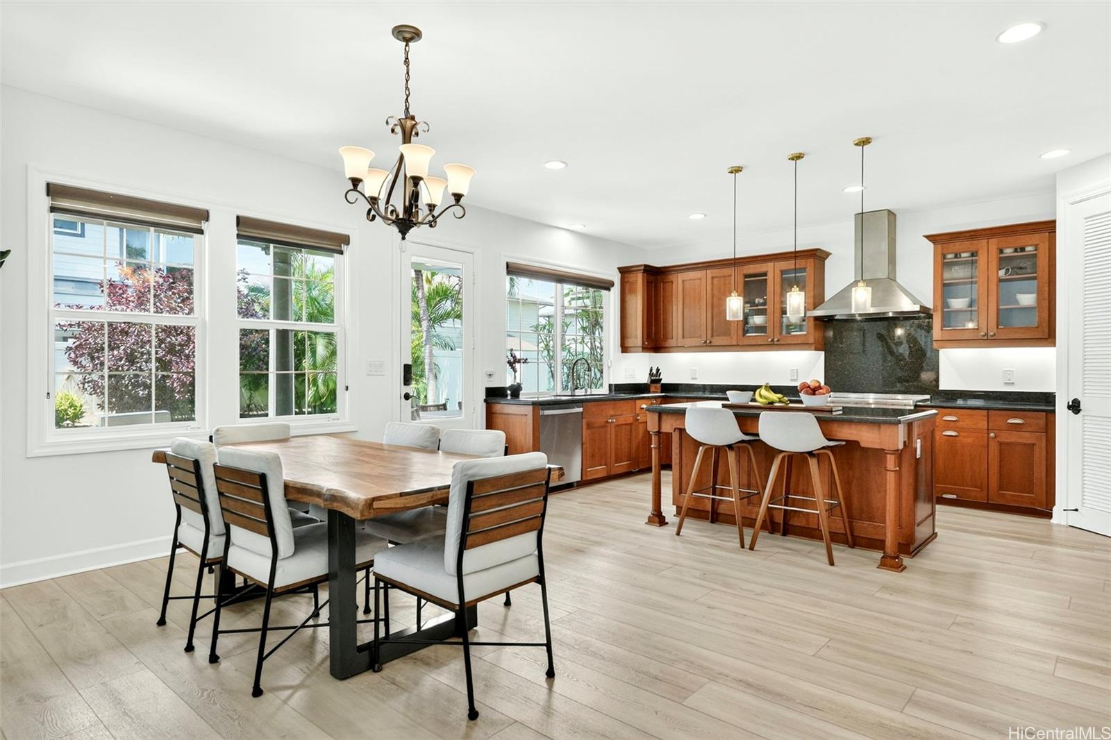 Discover this pristine 60.10 model in Ka Makana at Hoakalei. Upon entry you’re welcomed by a grand staircase and soaring ceilings in the living area allowing abundant natural light to fill the space. The main level features an open concept kitchen, dining and living area along with a bedroom complete with an ensuite full bath, a versatile bonus room ideal for an office and a half bath for guests. Upstairs, the spacious primary suite is thoughtfully separated from the guest bedrooms and features a tray ceiling that enhances the airy feel. The primary bathroom offers dual vanities, a soaking tub, walk-in shower and two closets. Two additional bedrooms and a full hallway bathroom complete the upper level. This home is equipped with high-end Viking appliances including a Sub-Zero refrigerator, 32 owned photovoltaic panels on net metering and two Tesla batteries to keep electricity costs low. Monthly dues include cable, internet and phone, plus access to the swim club, fitness center, pickleball courts, and lush green spaces. Conveniently located near Hoakalei Country Club, Wai Kai, and Ka Makana Ali’i Mall, dining, shopping and more are just minutes away!
