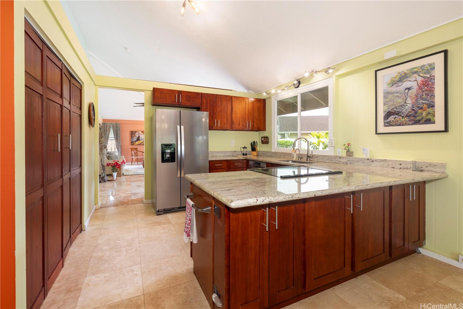 Classic Hawaiian paradise; a single-level, 4-bedroom resort-style home in the heart of an 11,000+ sq ft tropical oasis. Vaulted ceilings elevate two expansive living areas, kitchen and dining open floor plan. Travertine floors, granite kitchen/bath countertops, stainless appliances, Bosch dishwasher. Large open travertine showers say goodbye to squeegeeing glass shower doors! Situated for privacy, natural light and cross-breezes scented with pikake, tiare, pakalana and white ginger plantings. Spacious cathedral-ceilinged lanai, 35 foot tiled pool, Bullfrog hot tub, outdoor shower, dedicated BBQ space. Fruiting orange, lemon and cacao trees, butterflies and birds. 36 owned, net-metered photovoltaic panels and battery, reflective cool roof, coated double pane windows and doors (transferable lifetime warranty), solar cool attic fan. Upgraded electrical, plumbing. HOA maintains sidewalks, parks, & recreation centers for residents. Close to quality public schools, golf, shopping centers, medical offices, restaurants, YMCA, and weekly Farmer’s Market.