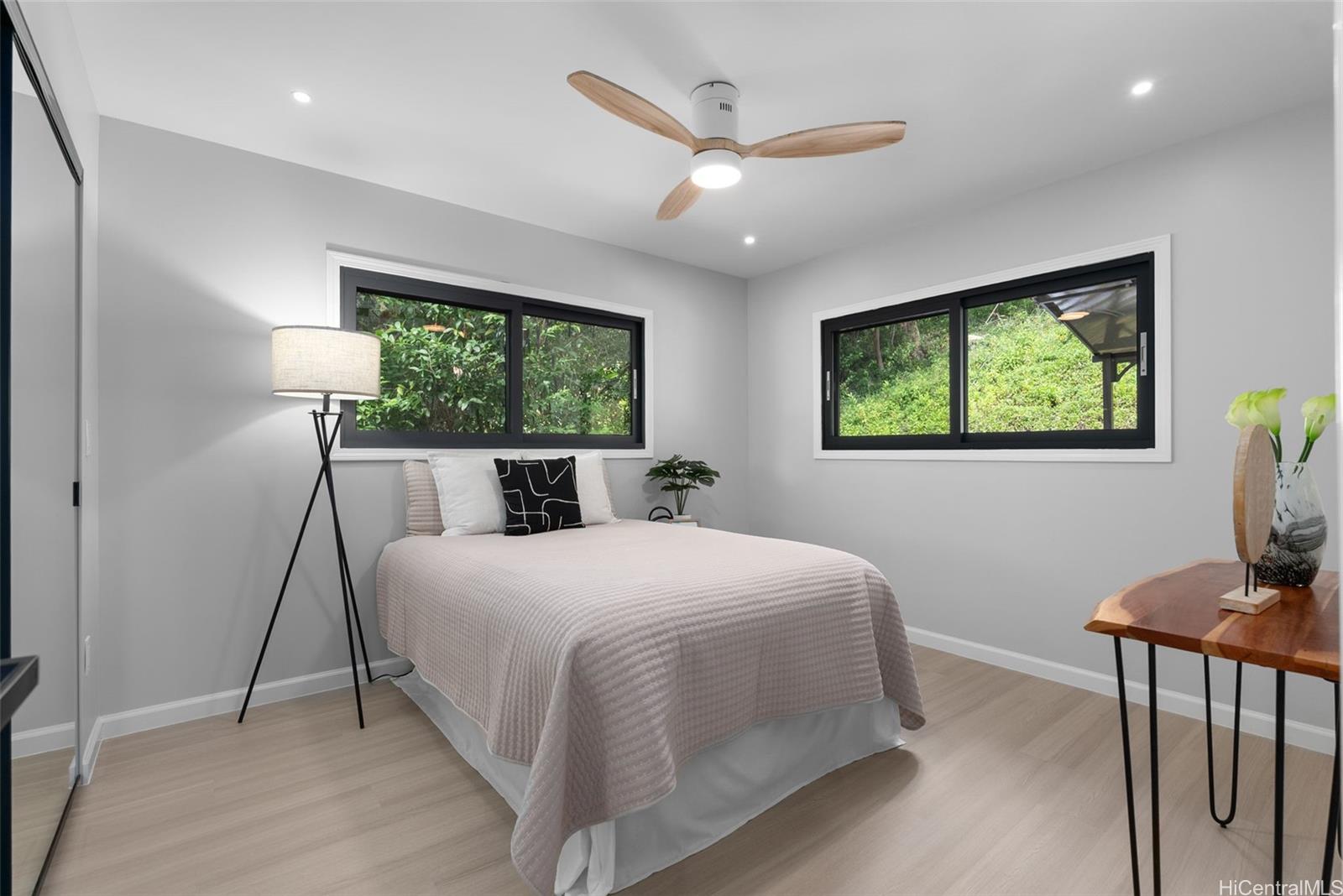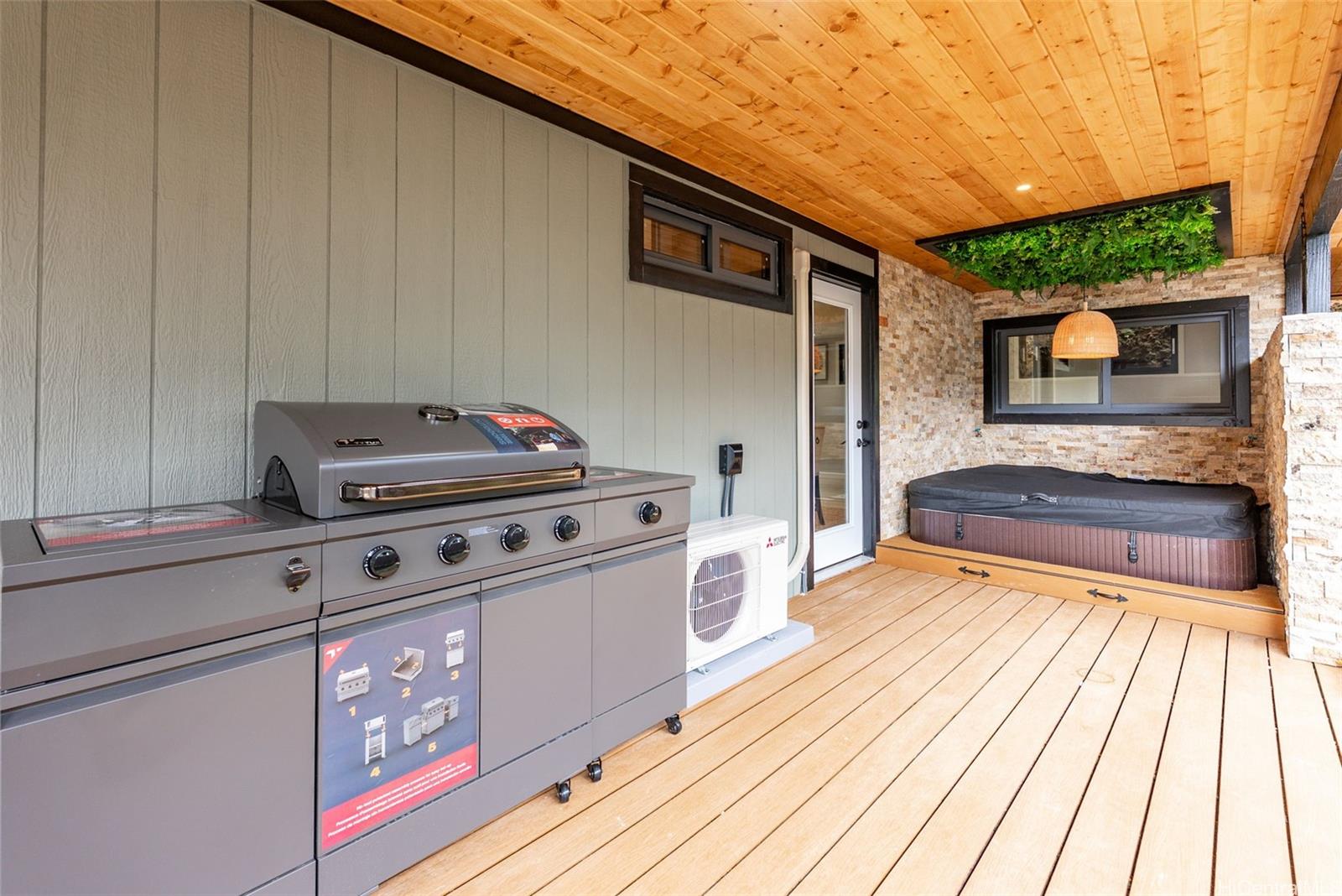 Located in the highly desirable neighborhood of Maunawili, this beautifully remodeled home sits under the breathtaking and serene mountains while the location provides a peaceful and relaxing environment. This home offers an enclosed garage and two levels of living space with wrap around decks on each floor (approx. 570 sf on the second level and almost 1000 sf on the top level), perfect for entertaining family and friends. You will love the attention to details throughout. The main floor boasts an open concept design with a large open kitchen with Cafe Brand appliances, a walk-in pantry, full bathroom and a bright, spacious living room perfect for entertainment and enjoying the views. The upper floor offers 4 bedrooms and 2 bathrooms. The primary bedroom is designed with a walk-in closet, spa like bathroom with a soaking tub and separate shower, a wall mounted electric fire place, and a wine refrigerator. Come home and appreciate the jacuzzi and BBQ grill that is included on the deck. Maunawili is just a short distance away from Pali Hwy, H-3, Downtown, shopping centers and to the beaches.
