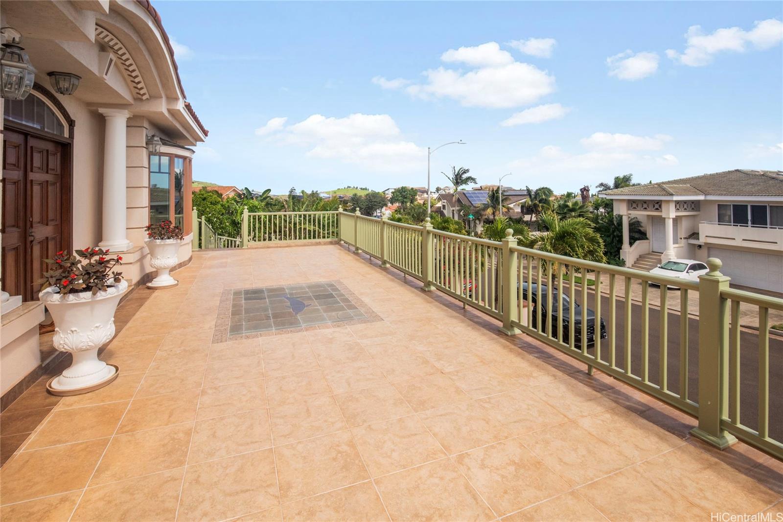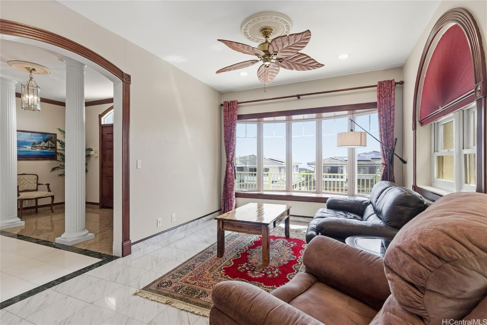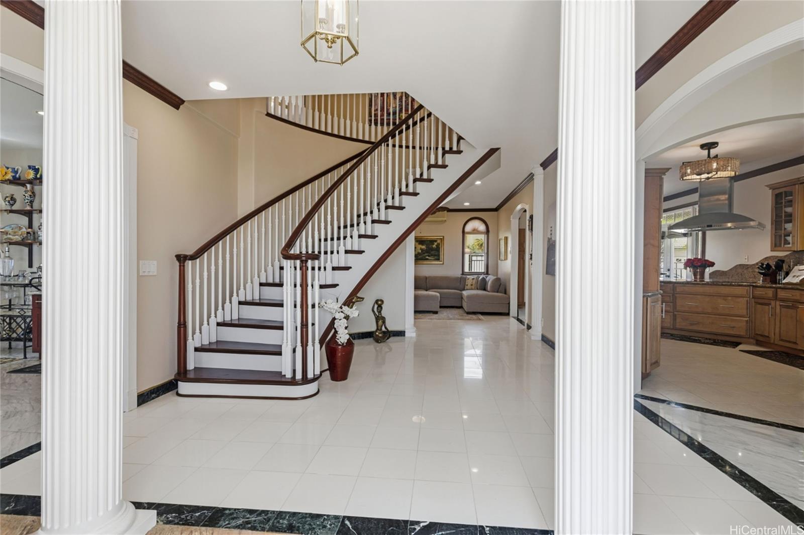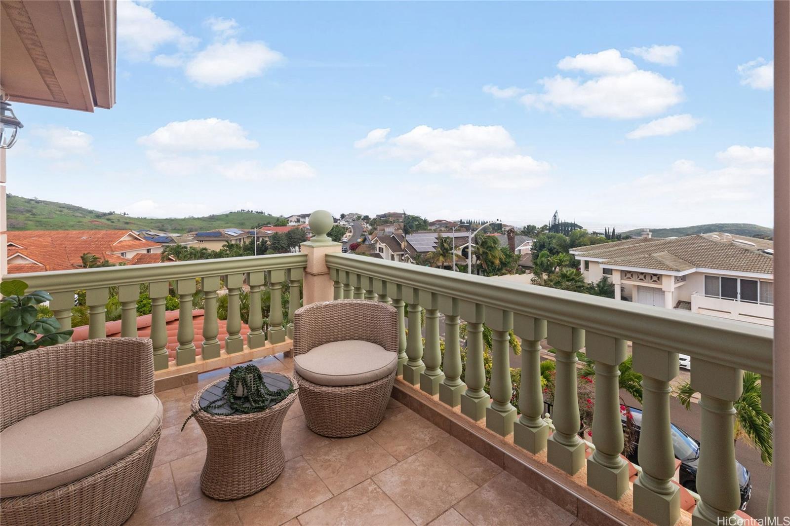 Villa La Romana is a classical Greco-Roman architectural marvel with castle-like features from the front street. Enclosed by an elegant six-foot wall, the villa sits atop Makakilo Hill, offering sweeping ocean and mountain views. Positioned on a corner lot, it showcases top-quality craftsmanship, premium materials, and grand views of the ocean, Diamond Head, and Honolulu city lights. Two large lanais adjacent to the primary bedroom provide inspiring outdoor living spaces perfect for relaxation and creativity. This spacious villa features 4 bedrooms, 3 bathrooms, a 3-car garage, a dining room, laundry room, and a bar/TV room with potential to serve as an additional bedroom. A large theater/entertainment room is ideal for life-size movie viewing or hosting guests, and a generous workshop offers space for hobbies and projects. The gourmet kitchen is thoughtfully designed with detailed finishes including marble floors, granite countertops and large windows overlooking the courtyard fountain and Makakilo hills—an ideal setting for any chef. The landscaped grounds include fruit trees and an elegant terraced garden perfect for private gatherings.