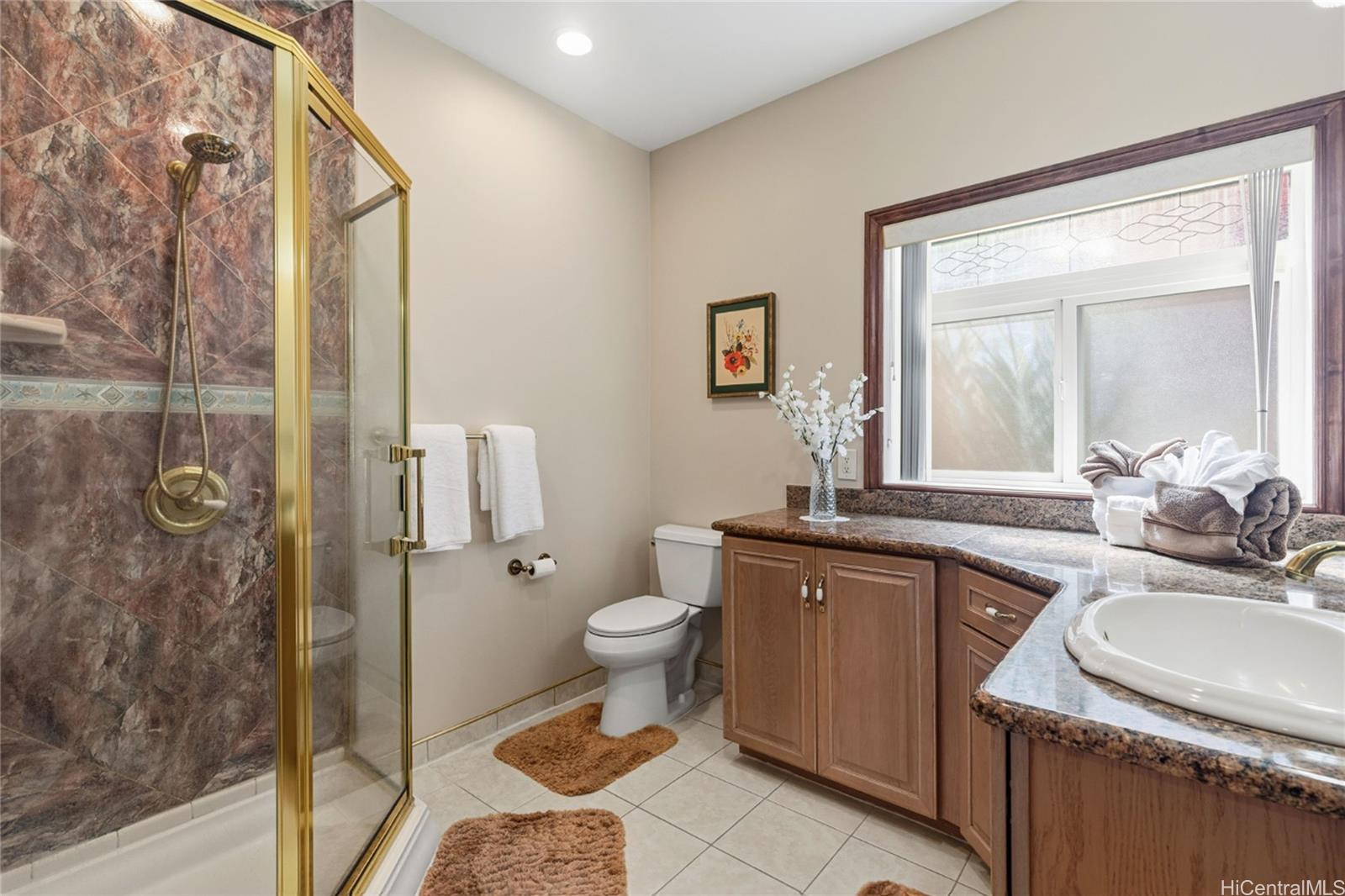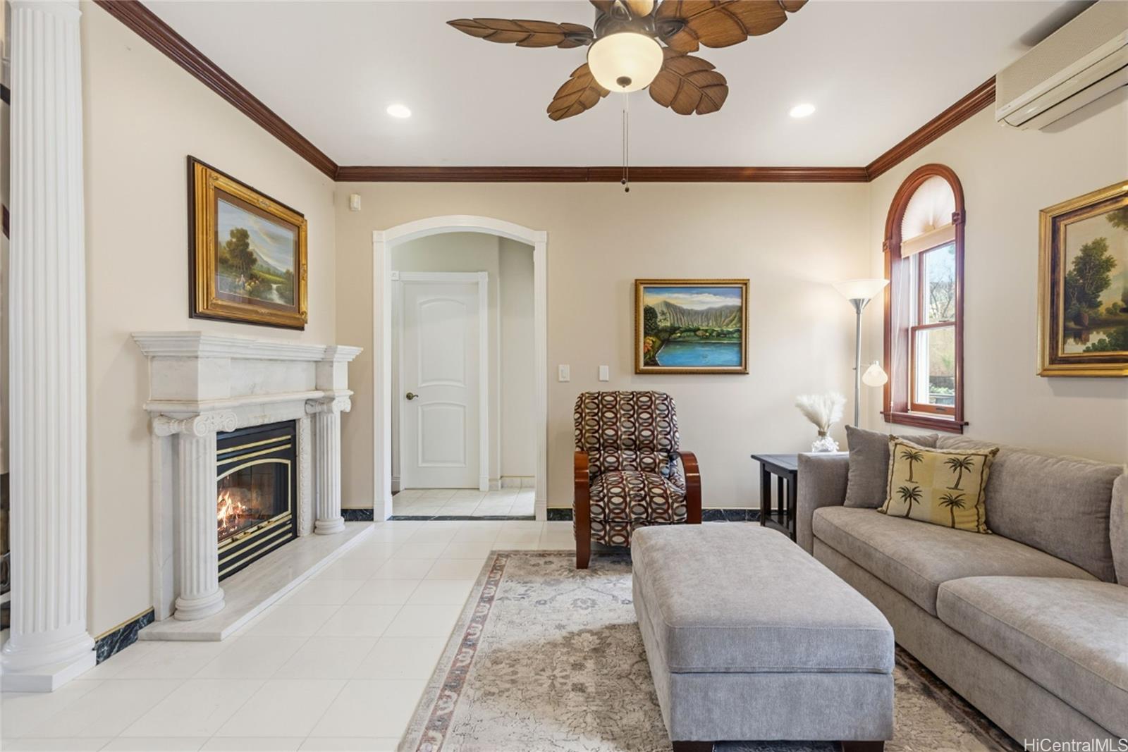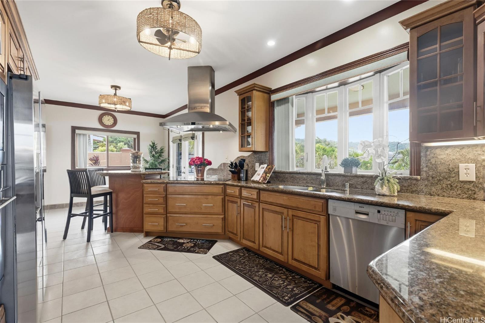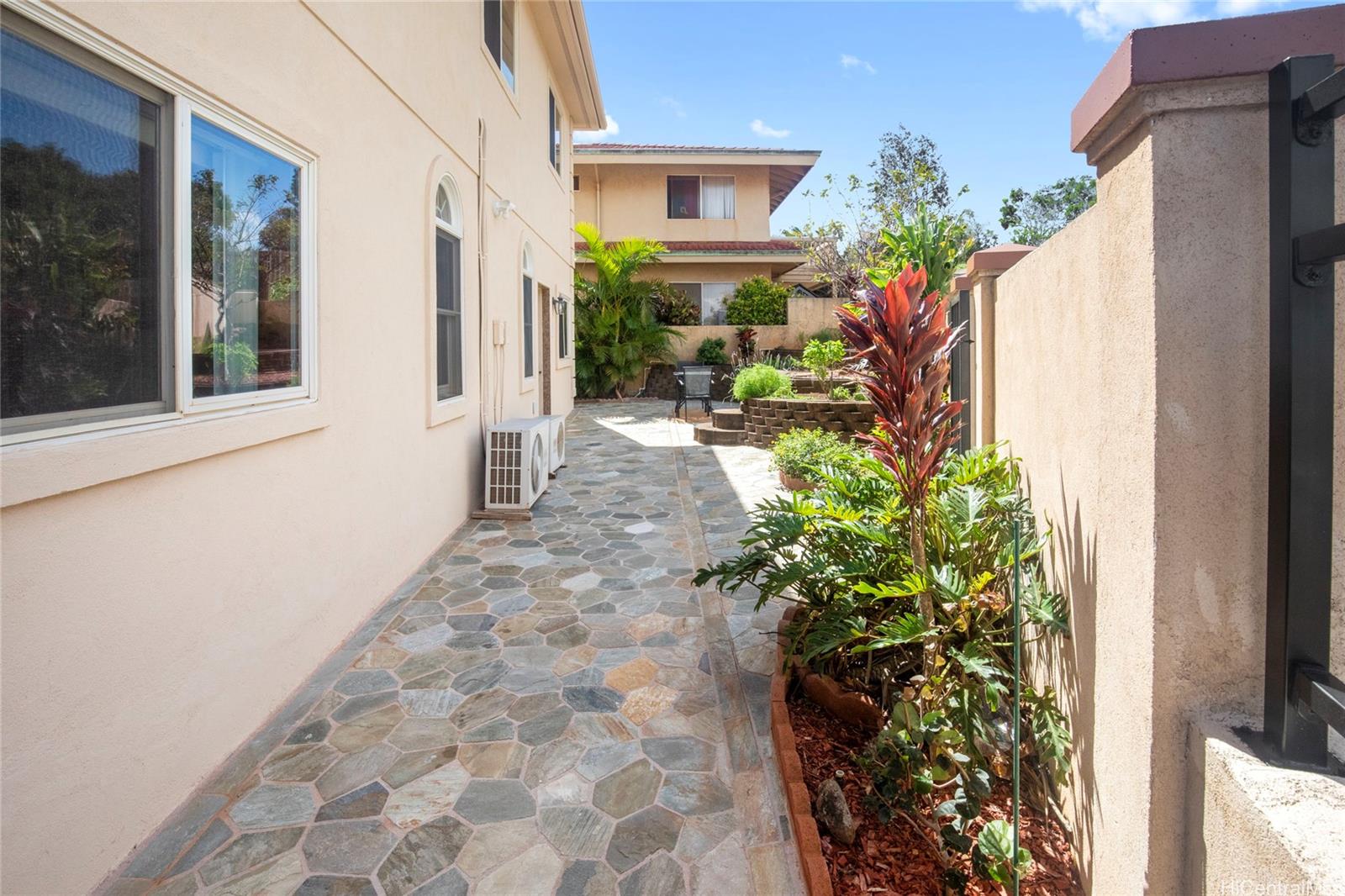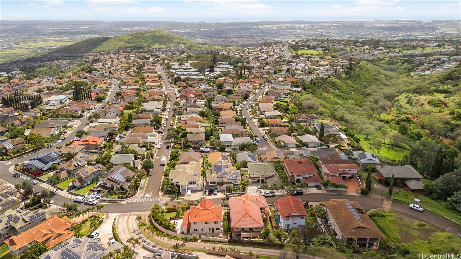 Villa La Romana is a classical Greco-Roman architectural marvel with castle-like features from the front street. Enclosed by an elegant six-foot wall, the villa sits atop Makakilo Hill, offering sweeping ocean and mountain views. Positioned on a corner lot, it showcases top-quality craftsmanship, premium materials, and grand views of the ocean, Diamond Head, and Honolulu city lights. Two large lanais adjacent to the primary bedroom provide inspiring outdoor living spaces perfect for relaxation and creativity. This spacious villa features 4 bedrooms, 3 bathrooms, a 3-car garage, a dining room, laundry room, and a bar/TV room with potential to serve as an additional bedroom. A large theater/entertainment room is ideal for life-size movie viewing or hosting guests, and a generous workshop offers space for hobbies and projects. The gourmet kitchen is thoughtfully designed with detailed finishes including marble floors, granite countertops and large windows overlooking the courtyard fountain and Makakilo hills—an ideal setting for any chef. The landscaped grounds include fruit trees and an elegant terraced garden perfect for private gatherings.