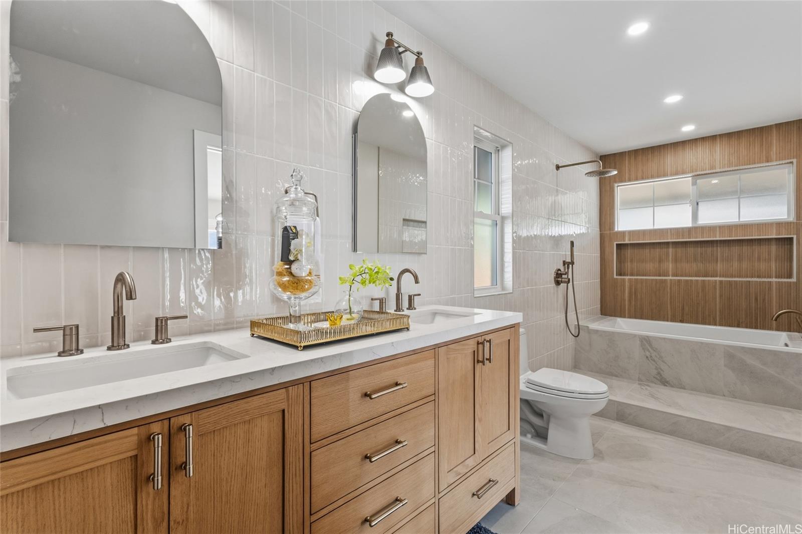 Beautifully renovated 4-bedroom residence offering 2,140 sq. ft. of interior living space, plus an additional 369 sq. ft. basement and garage. Thoughtfully reimagined with a modern aesthetic, this distinctive home features a spacious primary suite and a secondary bedroom with its own bathroom, ideal for flexible living arrangements. Enjoy seamless indoor-outdoor living with a full deck perfect for relaxing or entertaining, along with a generous mountain-view deck directly off the primary bedroom. Situated in a quiet neighborhood in desirable Manoa, conveniently close to schools. 23 owned solar panels. A truly unique design, must see to appreciate.