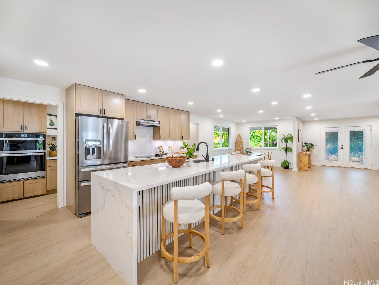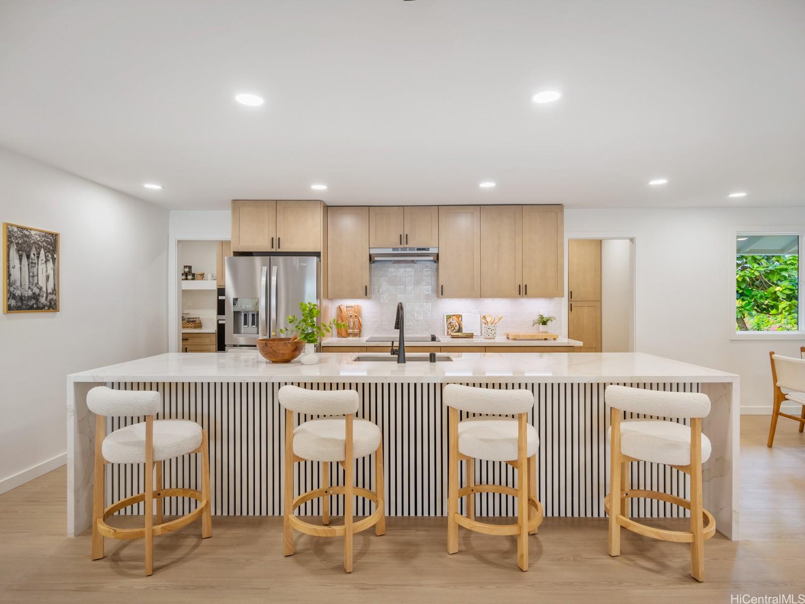 Thoughtfully redesigned for modern island living, this fully remodeled Haleiwa residence offers space, quality, and exceptional versatility on an oversized lot. Completed in 2025, the main residence features a spacious interior with wide-plank flooring, recessed lighting, split AC, and access to a generous lanai and yard for seamless indoor-outdoor living.The chef’s kitchen is a true centerpiece with quartz counters, a waterfall island, custom light-wood cabinetry & a stainless steel appliance suite. A standout feature is a rarely found butler’s pantry featuring dedicated prep space and double ovens. Two bedrooms, including the primary suite, feature en suite bathrooms. The primary retreat includes a walk-in closet and spa-style bath with double vanity and walk-in shower.The attached one-bedroom unit is complete with a full kitchen, bathroom, laundry, and a private lanai, making it perfectly suited for rental income, extended family, or guests. Set on an expansive lot with parking for 4+ vehicles, this home is designed for easy living, entertaining, and multi-generational flexibility. An invitation to experience where everyday living and long-term value come together.