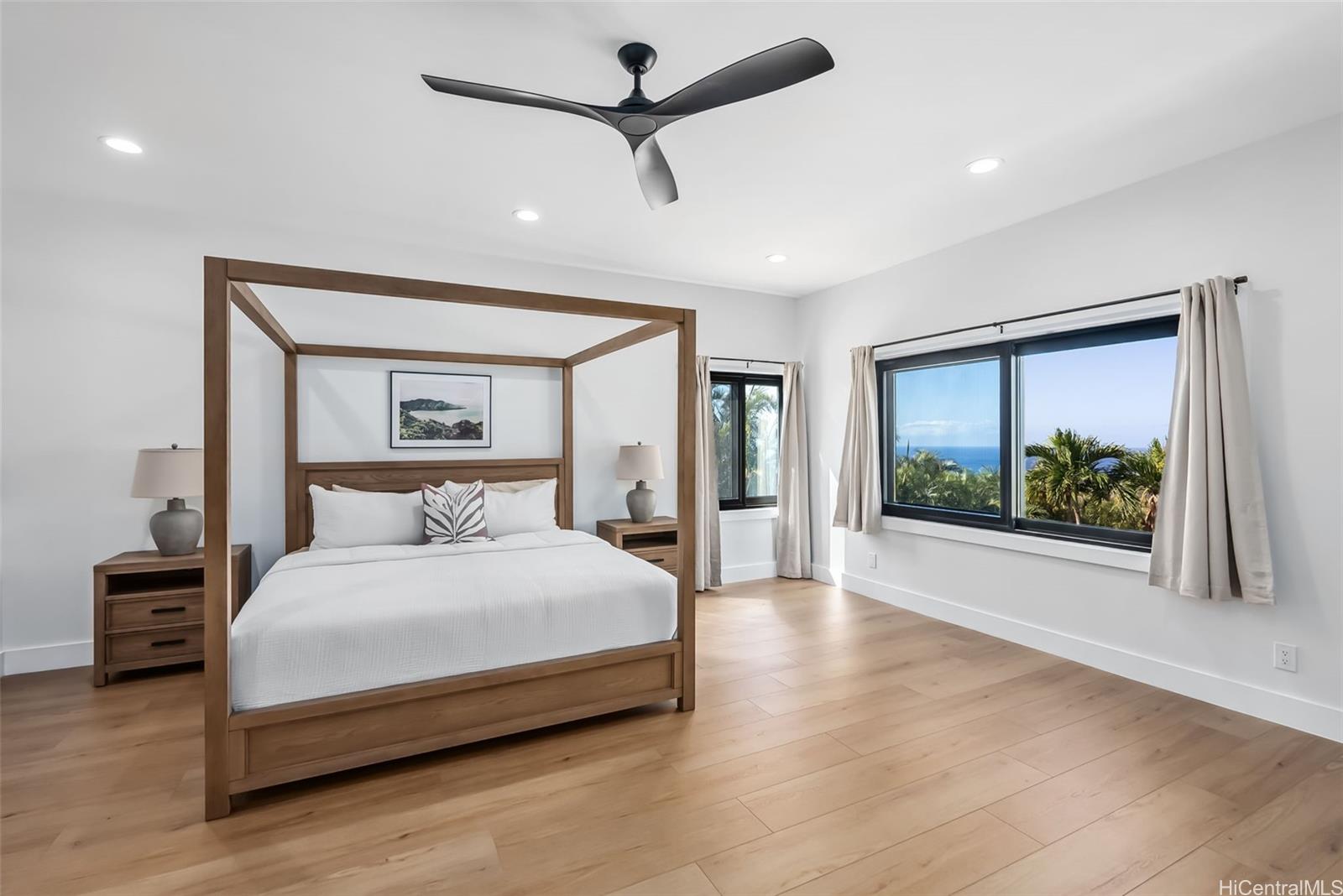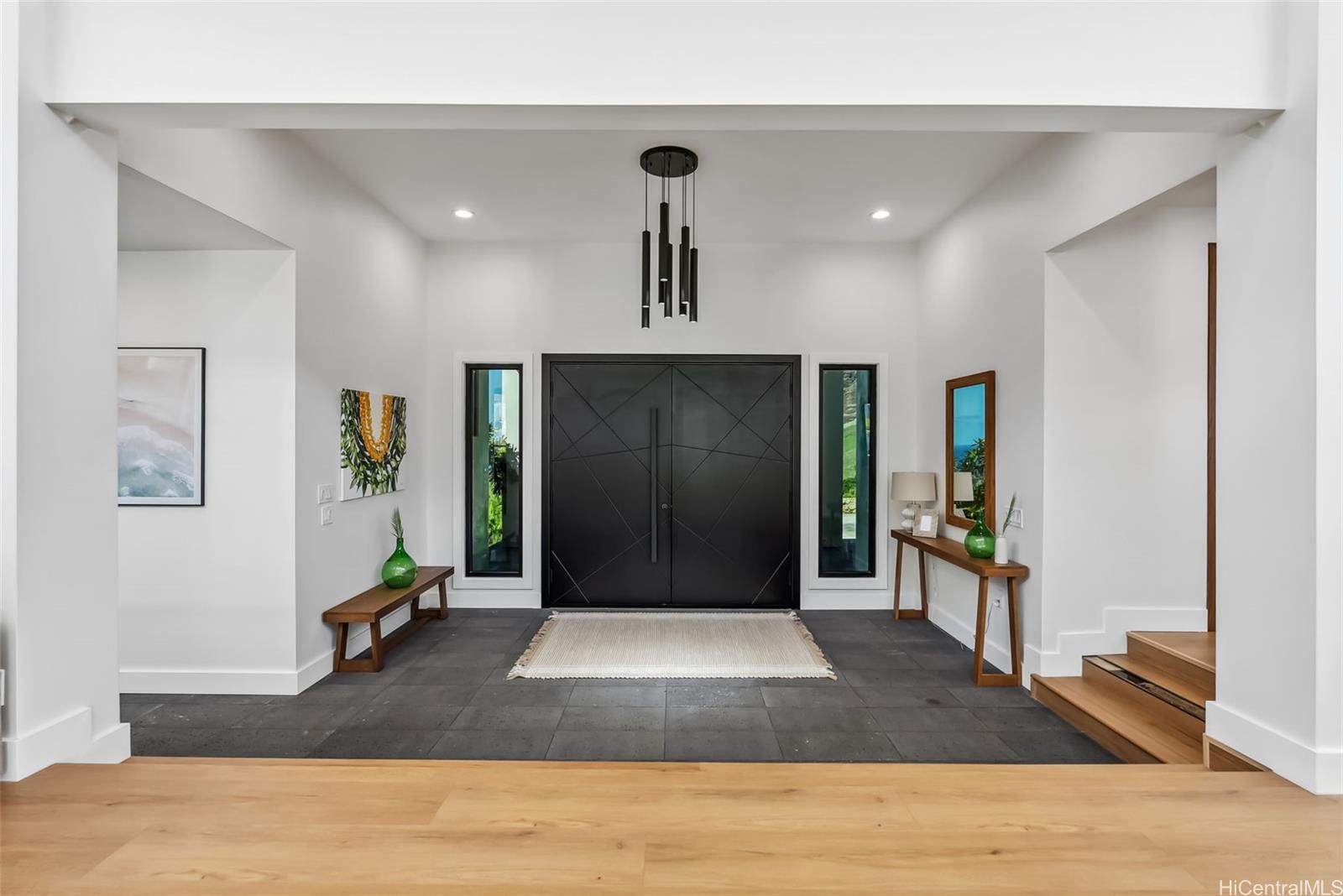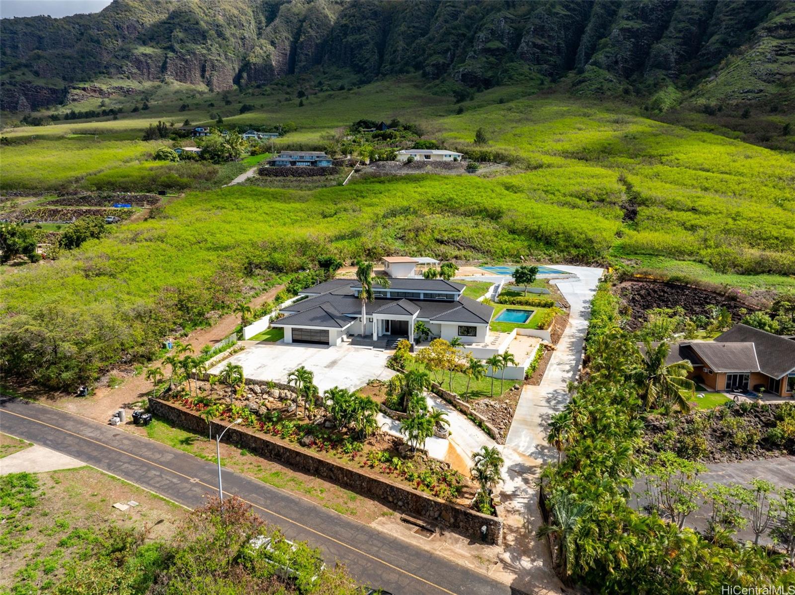 Exceptional value in gated Mauna‘Olu Estates. Set on over 2 acres, this modern retreat offers ocean and mountain views, privacy, and indoor-outdoor living. Open-concept design with high ceilings and natural light. Chef’s kitchen features premium Thermador appliances, custom cabinetry, walk-in pantry, and large island. Primary suite with spa-like bath. Resort-style backyard with pool, lush landscaping, covered lanai, and two pickleball courts.