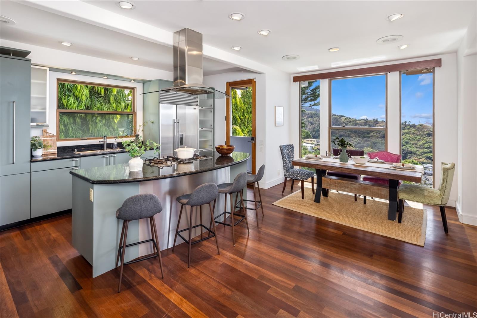 現代的なエレガンス!建築家ジム・シュミットによる、この特別にデザインされた注文住宅へようこそ。 間取りは、ダイヤモンドヘッドからパールハーバー、コオラウ山脈までの壮大な眺望を中心に見事にデザインされている。 記念碑的な10フィートの高さのボンデッド・ブロンズの玄関ドアが出迎え、壮大な2階建てのリビングルームへと続く。 リビングルームに一歩足を踏み入れると、息をのむような遮るもののない眺望に思わず「ワオ」と声を上げてしまう。 オーストラリアン・チョコレート・ハート・ブラッシュボックスのハードウッドフロア、二重の片持ち梁のリビングルームの壁、ASID賞を受賞したキッチン、すっきりとしたエレガントな建築ラインが、この家の時代を超越したデザインを生み出している。 プライマリー・ベッドルーム・スイートからは、ダイヤモンドヘッド、ワイキキ、パンチボール、そして海まで見渡せる素晴らしい眺望で目覚めることができます。 下階のレクリエーション・ルームはタンブル・トラバーチン・フロアで、素晴らしいラナイ、スパ、ラップサイズのプールにつながっており、さらにゴージャスな眺めを楽しむことができる。 通りから奥まったこの特別な家は、プライバシーが保たれ、ダウンタウンや主要幹線道路に近い絶好のロケーションです。 家に帰れば、この素晴らしい家での生活を楽しむことができる。