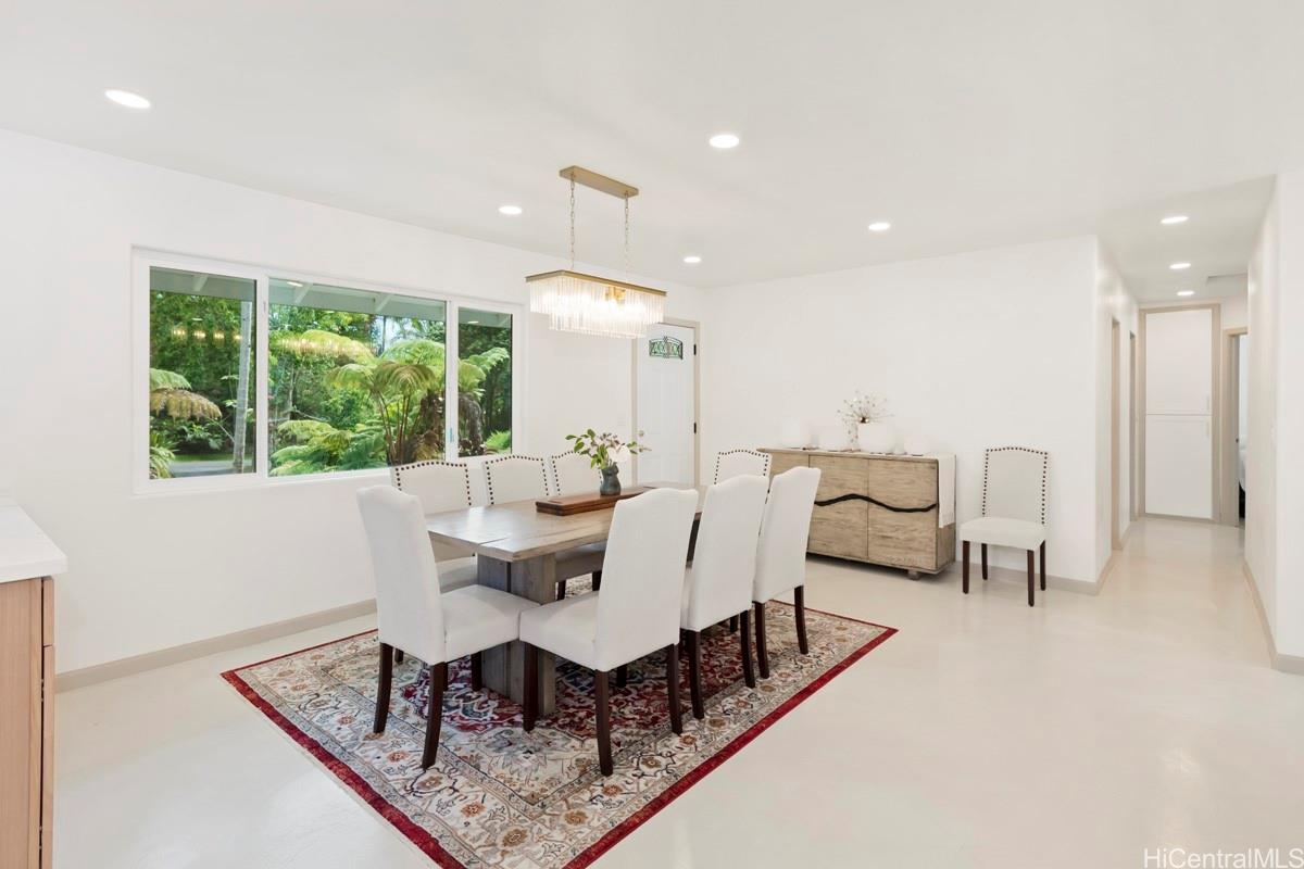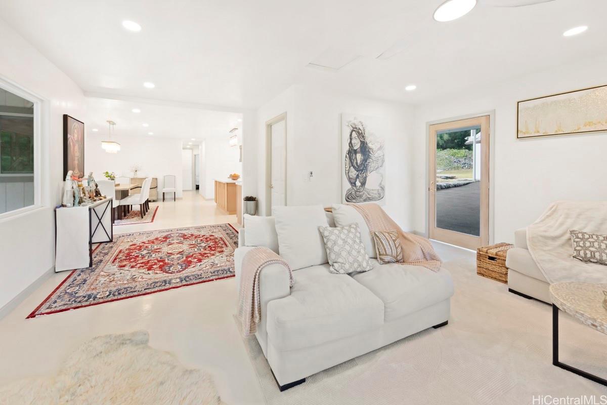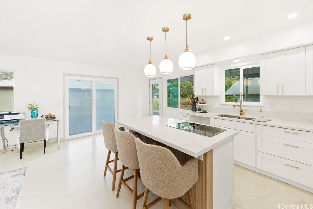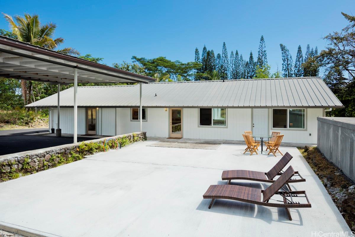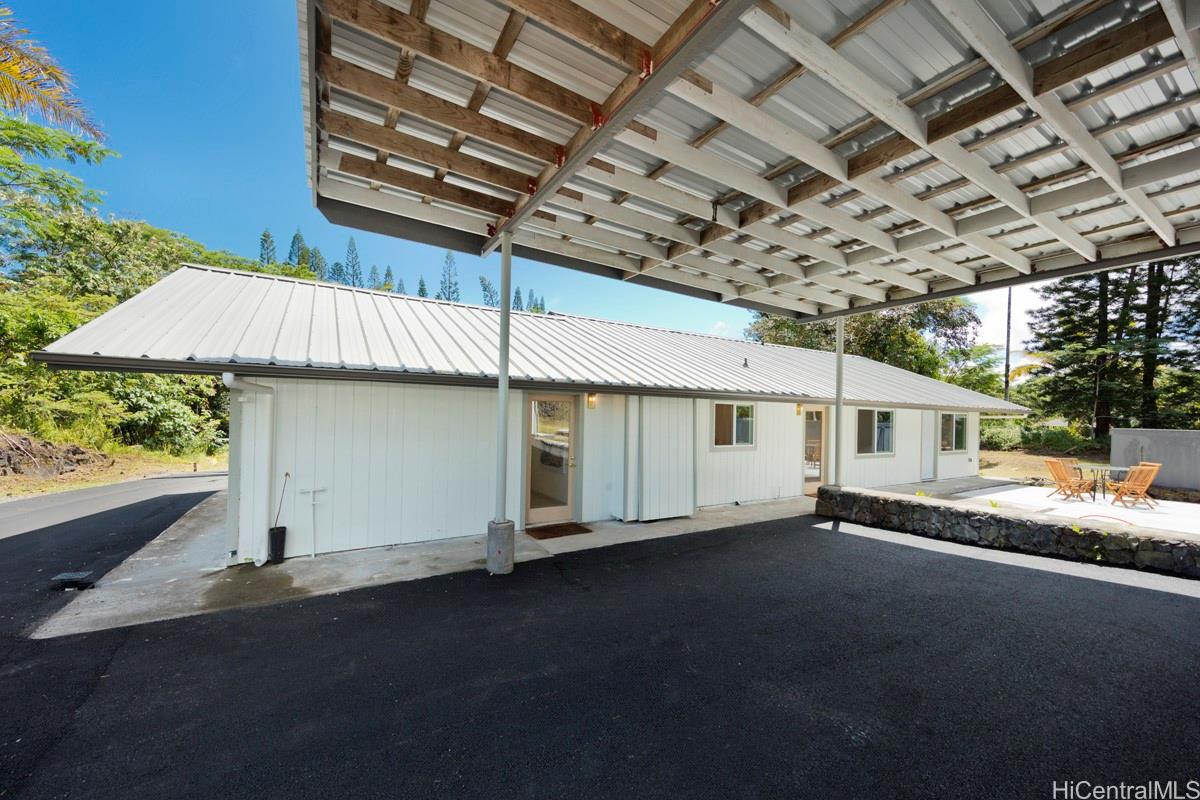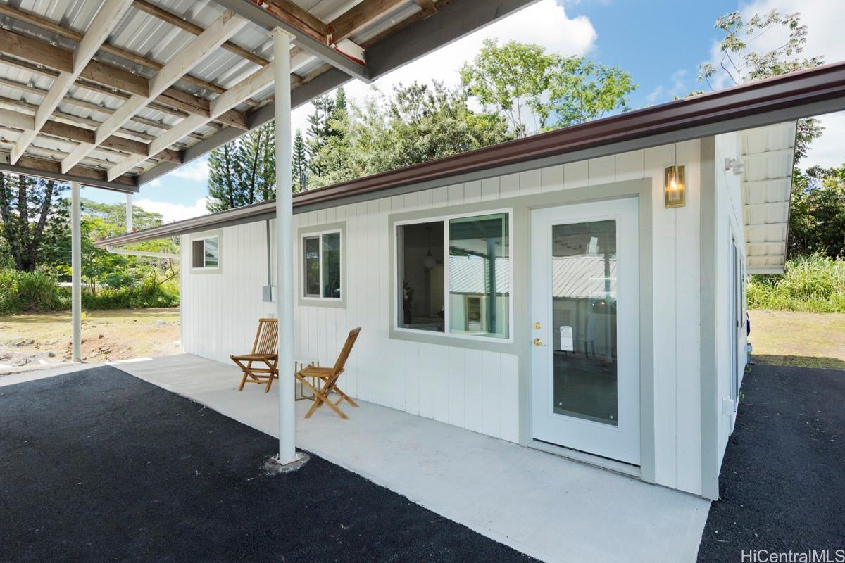 Beautifully renovated main home 3 bedrooms 2 bath and large ohana home 1 bedroom 1 bath with newly paved driveway and paved large Boat style carport in between homes featuring 12 foot ceiling and able to accommodate 4 vehicles. The main home features a large living room and very spacious formal dining room. The newly designed kitchen has new cabinets and quartz countertops with a large island with a lot of cabinet/storage space.Both homes feature wall to wall new fully custom Microcement flooring. Both kitchens are very spacious and have new appliances. Aside from the large carport, the outside between homes feature a large courtyard area plumbed for an outside kitchen and BBQ grill. Come and see this home today with all of it’s custom features.
