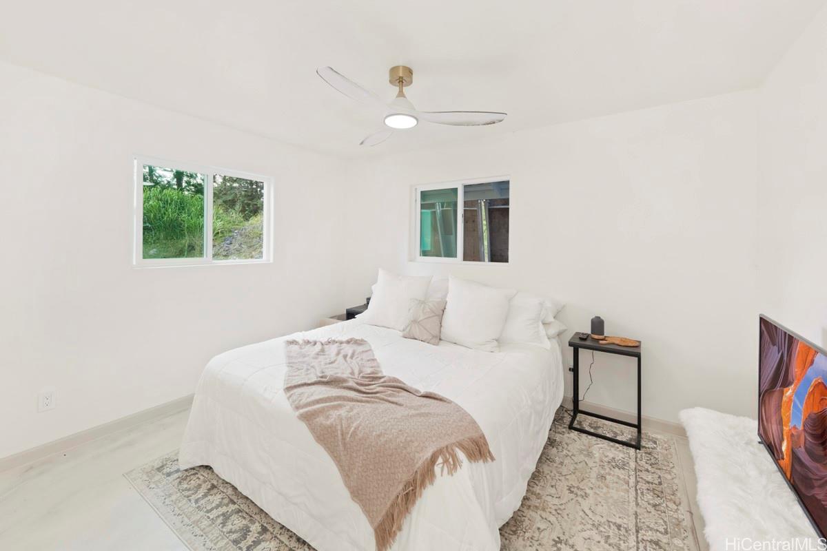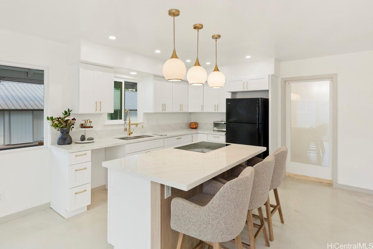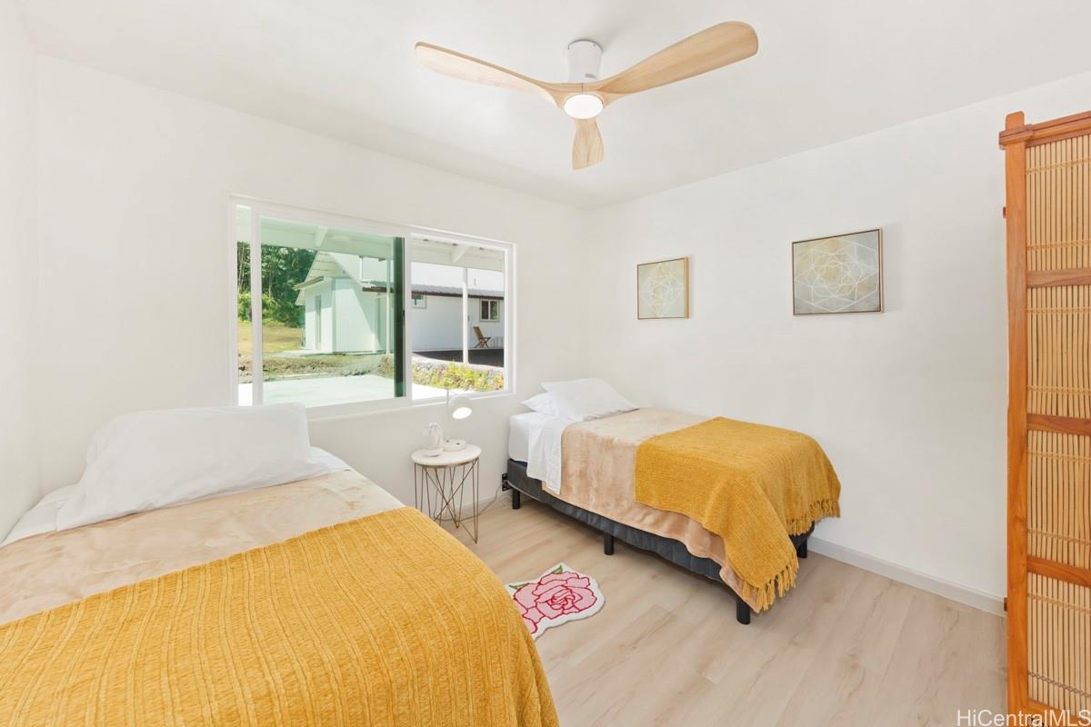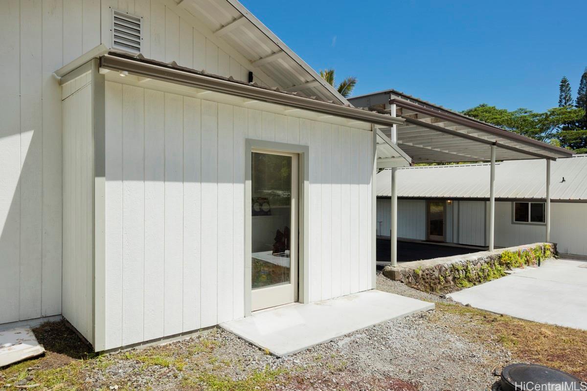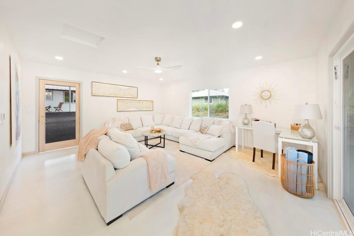 Beautifully renovated main home 3 bedrooms 2 bath and large ohana home 1 bedroom 1 bath with newly paved driveway and paved large Boat style carport in between homes featuring 12 foot ceiling and able to accommodate 4 vehicles. The main home features a large living room and very spacious formal dining room. The newly designed kitchen has new cabinets and quartz countertops with a large island with a lot of cabinet/storage space.Both homes feature wall to wall new fully custom Microcement flooring. Both kitchens are very spacious and have new appliances. Aside from the large carport, the outside between homes feature a large courtyard area plumbed for an outside kitchen and BBQ grill. Come and see this home today with all of it’s custom features.