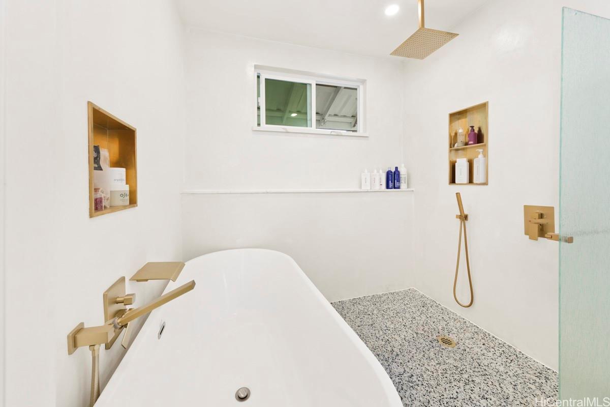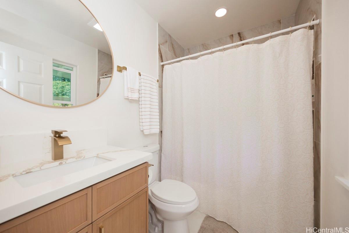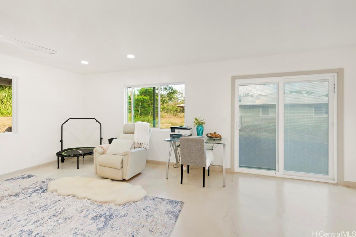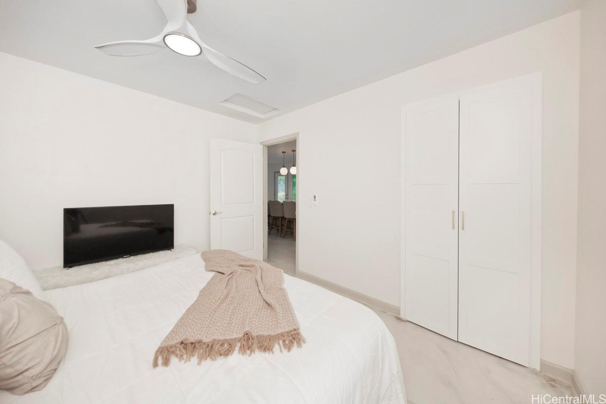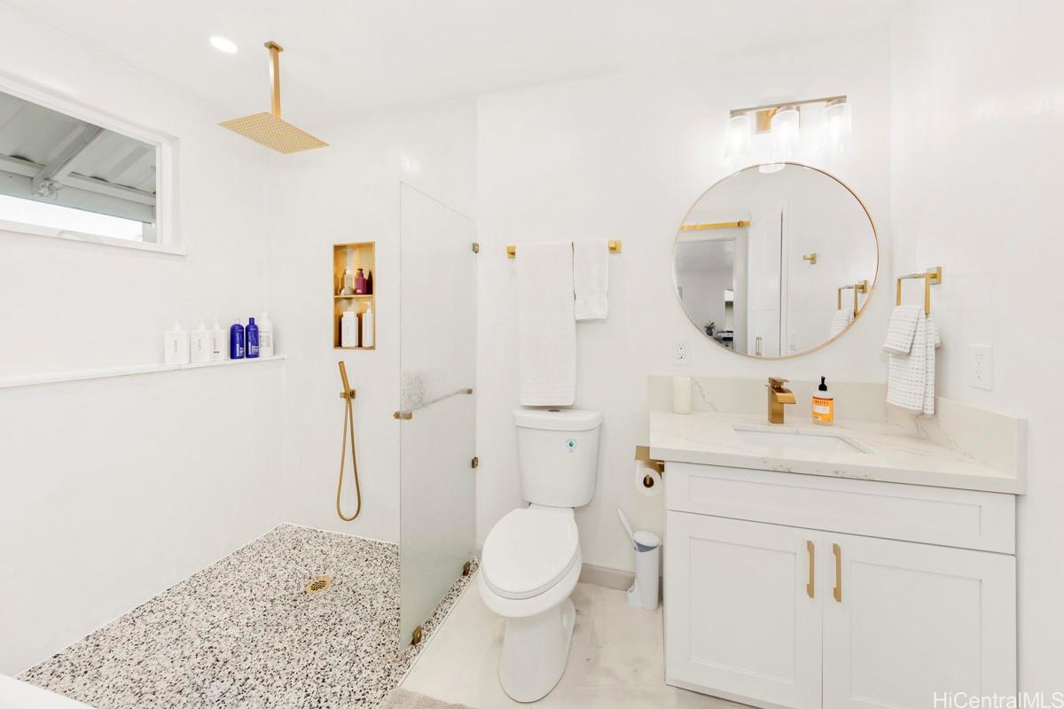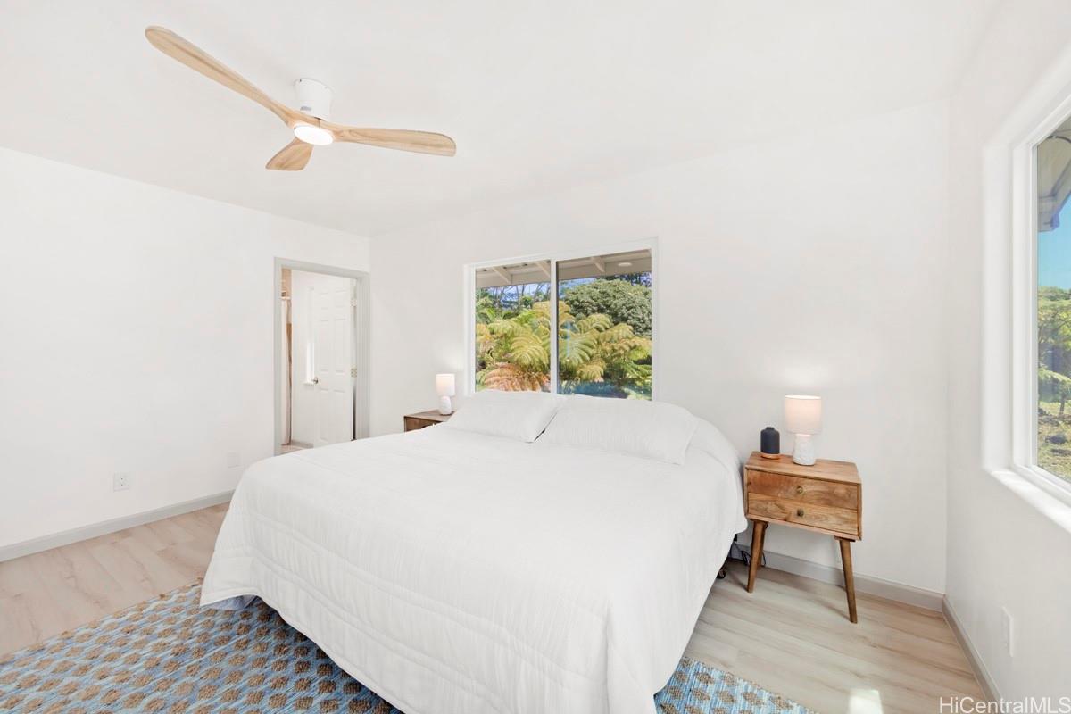 Beautifully renovated main home 3 bedrooms 2 bath and large ohana home 1 bedroom 1 bath with newly paved driveway and paved large Boat style carport in between homes featuring 12 foot ceiling and able to accommodate 4 vehicles. The main home features a large living room and very spacious formal dining room. The newly designed kitchen has new cabinets and quartz countertops with a large island with a lot of cabinet/storage space.Both homes feature wall to wall new fully custom Microcement flooring. Both kitchens are very spacious and have new appliances. Aside from the large carport, the outside between homes feature a large courtyard area plumbed for an outside kitchen and BBQ grill. Come and see this home today with all of it’s custom features.