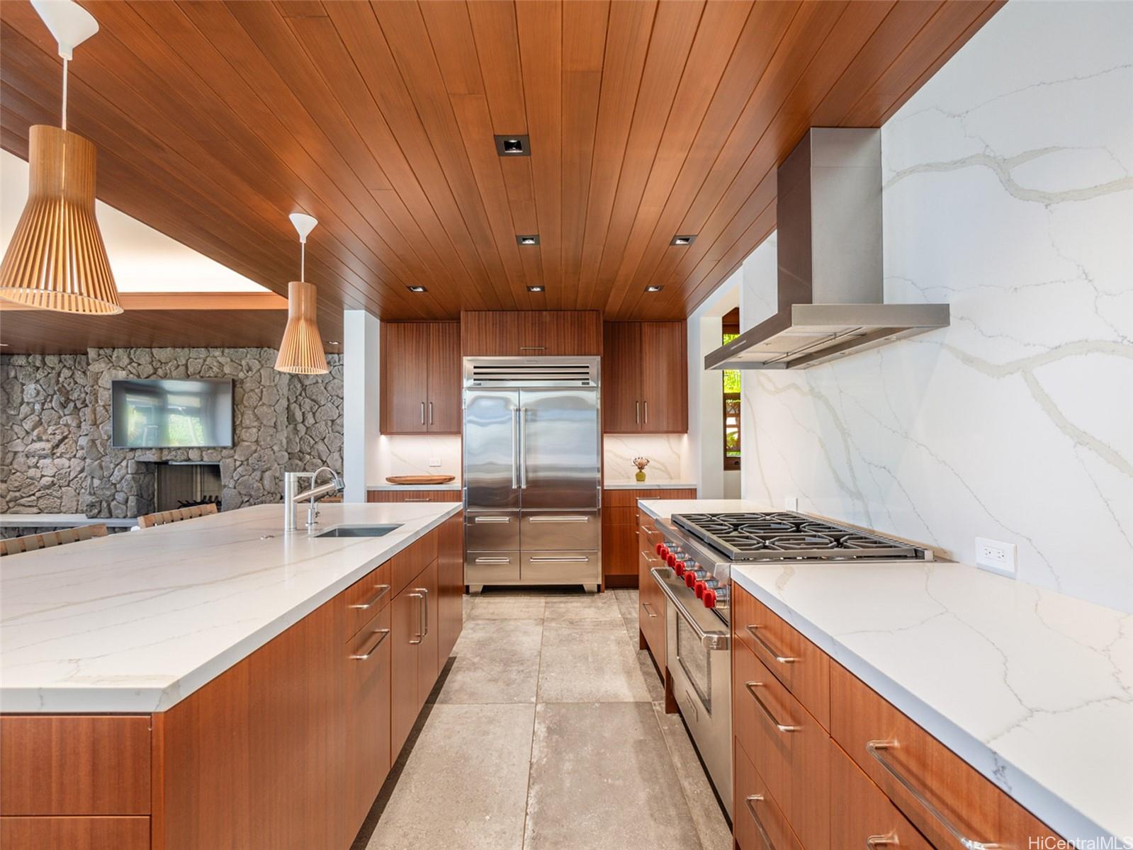 シームレスな屋内外リビングの真髄を体現したトロピカル・モダンの傑作で、120フィート以上のオーシャンフロントと、ココ・ヘッドからダイヤモンド・ヘッドまでの息を呑むような180度の眺望を誇ります。 豪華さと非日常的な島の環境が融合している。 ウルフのガスレンジ、ミーレのフード、サブゼロ・プロの48インチ冷蔵庫、ボッシュの食器洗い機など、一流家電を備えたシェフズ・キッチンには、フィッシャーのパントリーが備え付けられている。 複雑な天井のデザインから、特注のサペレ・マホガニーのドアや窓枠に至るまで、細部に至るまで精巧な職人技が施されている。 フォルチュニーとフォンタナ・アルテによるエレガントな照明が温かみと洗練さを添え、スマートホーム・テクノロジー、エアコン、ポケットドア、フローリム磁器タイルのフローリングが、キッチン、リビングスペース、ラナイ全体に快適さとつながりを保証する。 屋外には、タイル張りのプール、スパ、鯉の池、流れ落ちる滝が静かな隠れ家を作り出し、海に直接つながる階段のあるプライベート桟橋では、泳いだり、パドルを漕いだり、シュノーケリングをしたり、釣りをしたり、サーフィンをしたりと、すべて自宅の裏庭から楽しむことができる。 これは単なる家ではなく、ライフスタイルなのだ。