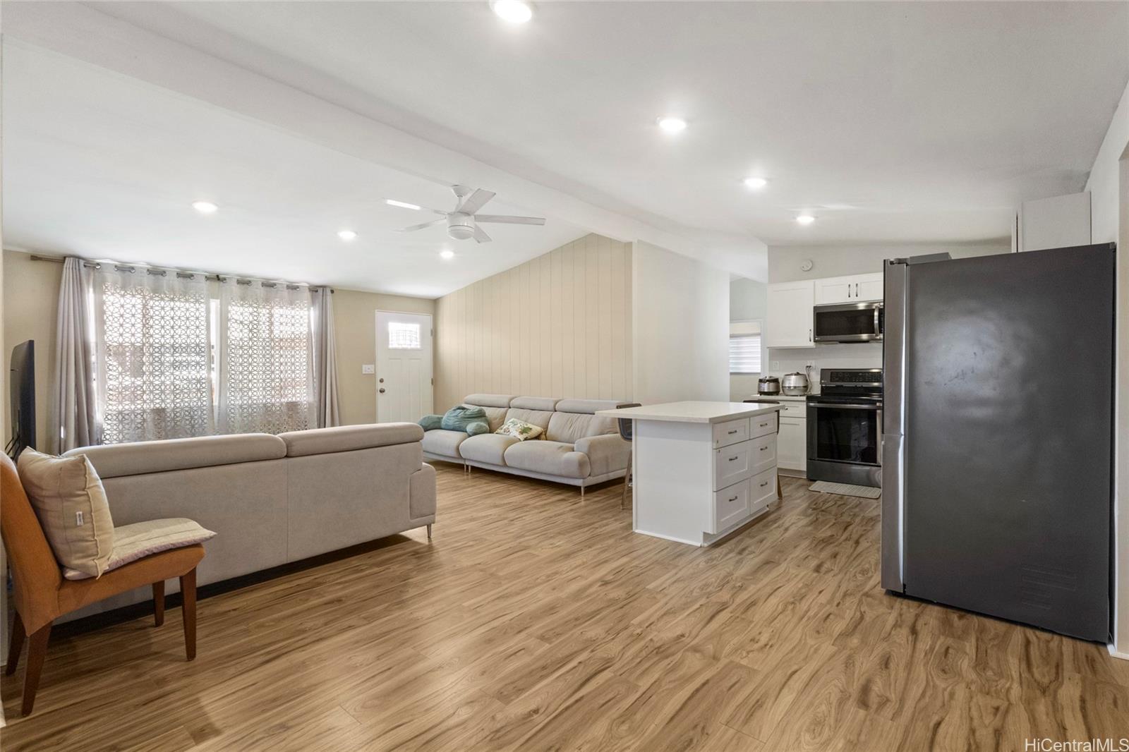 Single-level remodeled 4-bedroom, 2.5-bath home offering 1,648 sq ft of comfortable living in a highly convenient Pearl City location! This move-in-ready residence features durable vinyl plank flooring, a modern kitchen with updated finishes, and two separate living spaces providing flexibility for entertaining, relaxing, working from home, or multi-generational living. Step outside to enjoy a nicely fenced yard complete with a play set—perfect for outdoor fun, pets, or weekend gatherings. The garage adds valuable parking and storage, and all major appliances are included with the home for added convenience. Residents also enjoy access to a community pool with a small association fee. Ideally located near Pearl Harbor, restaurants, shopping, and nearby hiking trails, and approximately 15 minutes to the freeway for an easy commute. A wonderful opportunity to own a well-maintained single-level home in a desirable central Oahu neighborhood.