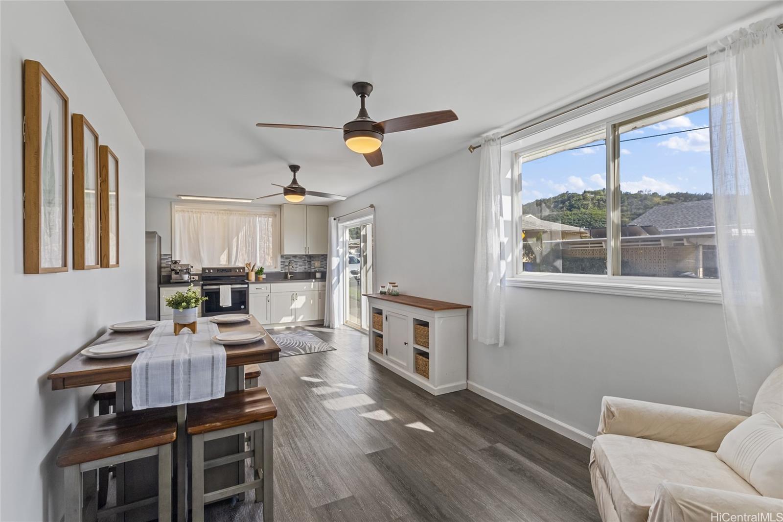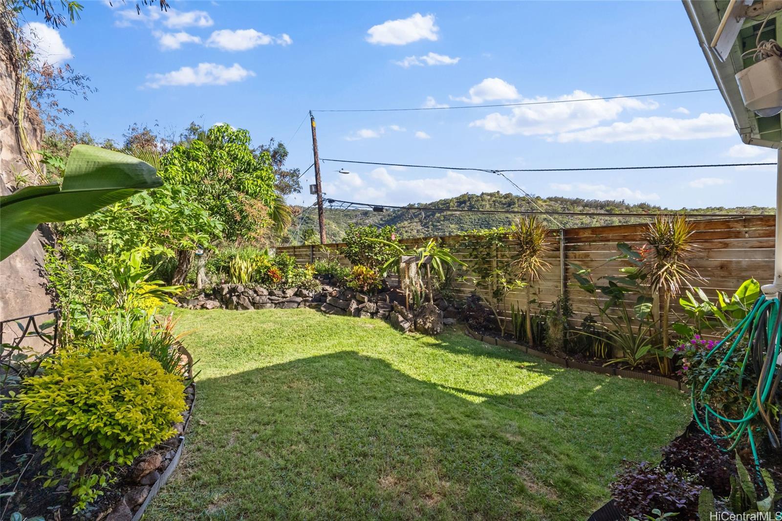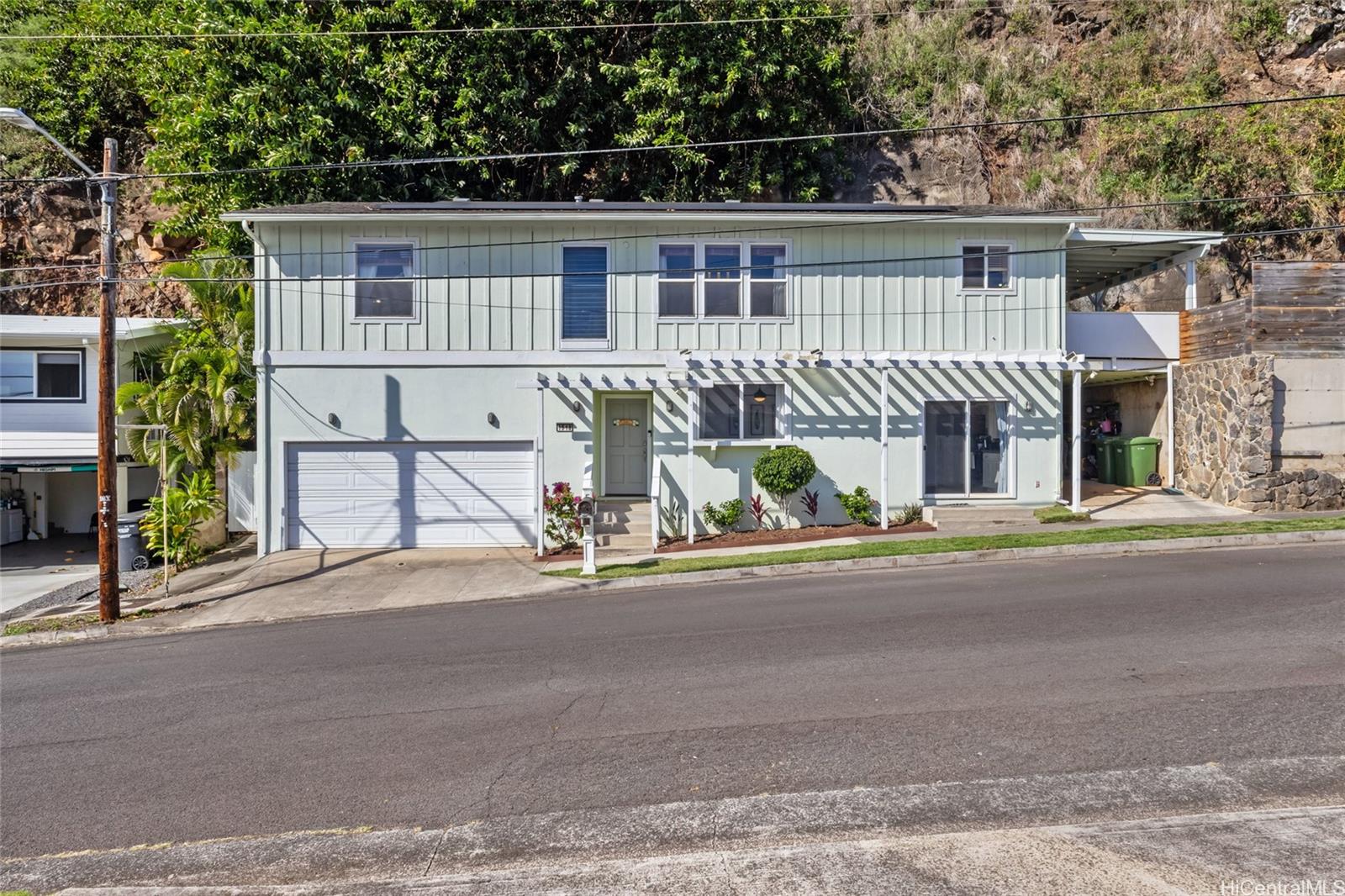 Rare beautifully maintained multi-generational opportunity in desirable Moanalua Valley! VA assumption to qualified buyers at 2.625% . This spacious 5-bedroom, 3-full-bath home features two distinct living areas a main space upstairs featuring 3-bedroom, 2-bath layout and downstairs 2-bedroom, 1-bath suite with wet bar. Can be used separately or together. Enjoy gorgeous mountain views with peek-a-boo ocean views and a primary suite with en suite bath. The home has nicely appointed quality finishes such as granite countertops, stainless steel appliances, luxury vinyl floors and hardwood. 1 Split A/C unit and 3 wall units and 13 OWNED solar panels and Tesla Powerwall. Step outside to a grassy yard perfect to garden with a covered lanai with mature lush tropical landscaping, creating a peaceful island oasis. Ideally located near Moanalua Valley Trail, Park, and Moanalua Valley Golf Club, with convenient freeway access, schools, and amenities. Approximately 3 miles to Fort Shafter and 6 miles to Joint Base Pearl Harbor-Hickam, 1.4 miles to Kaiser Moanalua Medical Center. A rare blend of convenience, flexibility, views, sustainability, and location