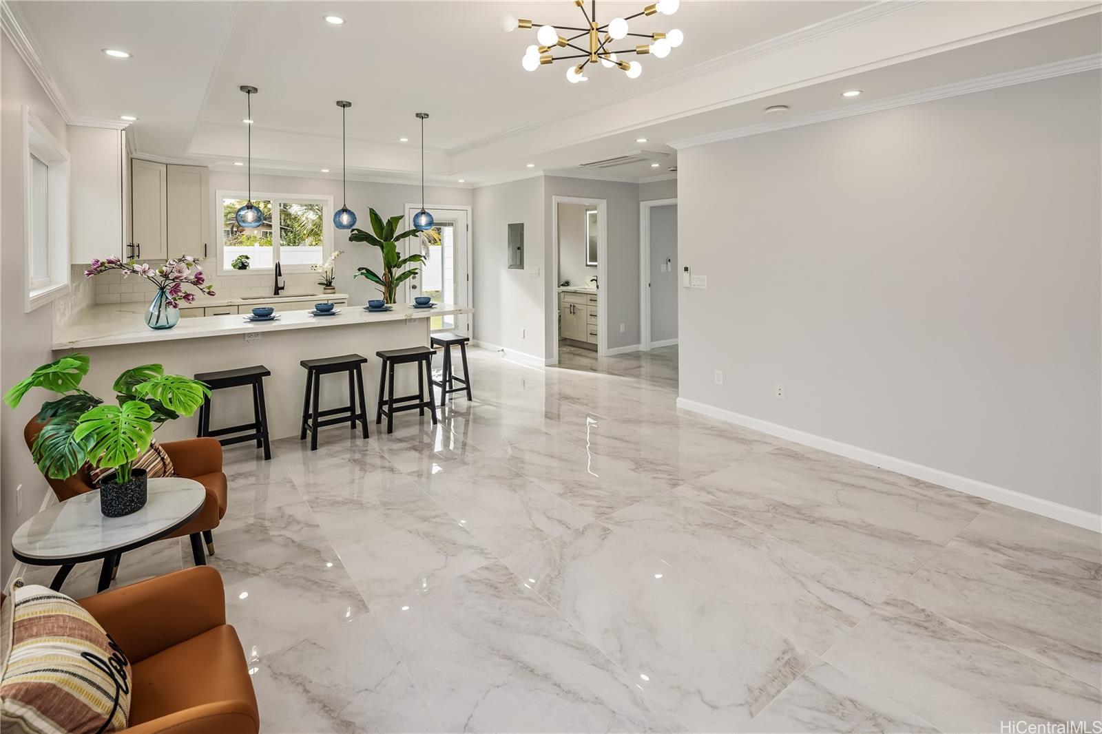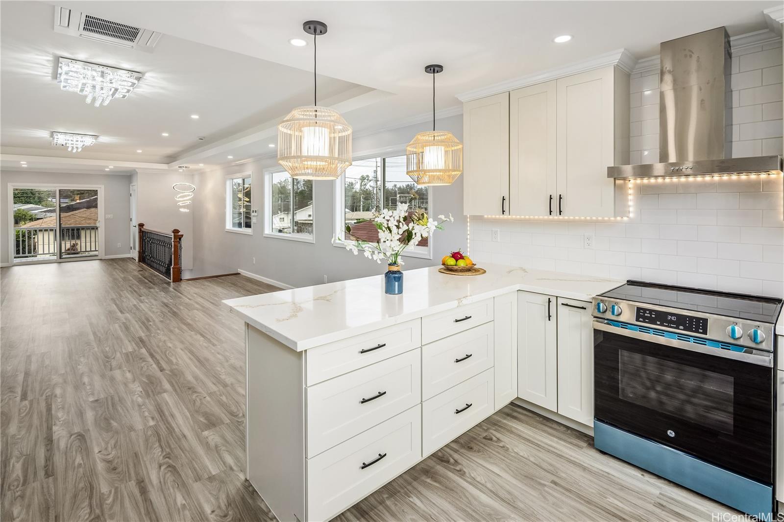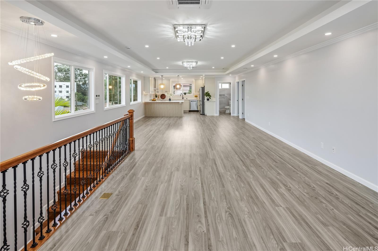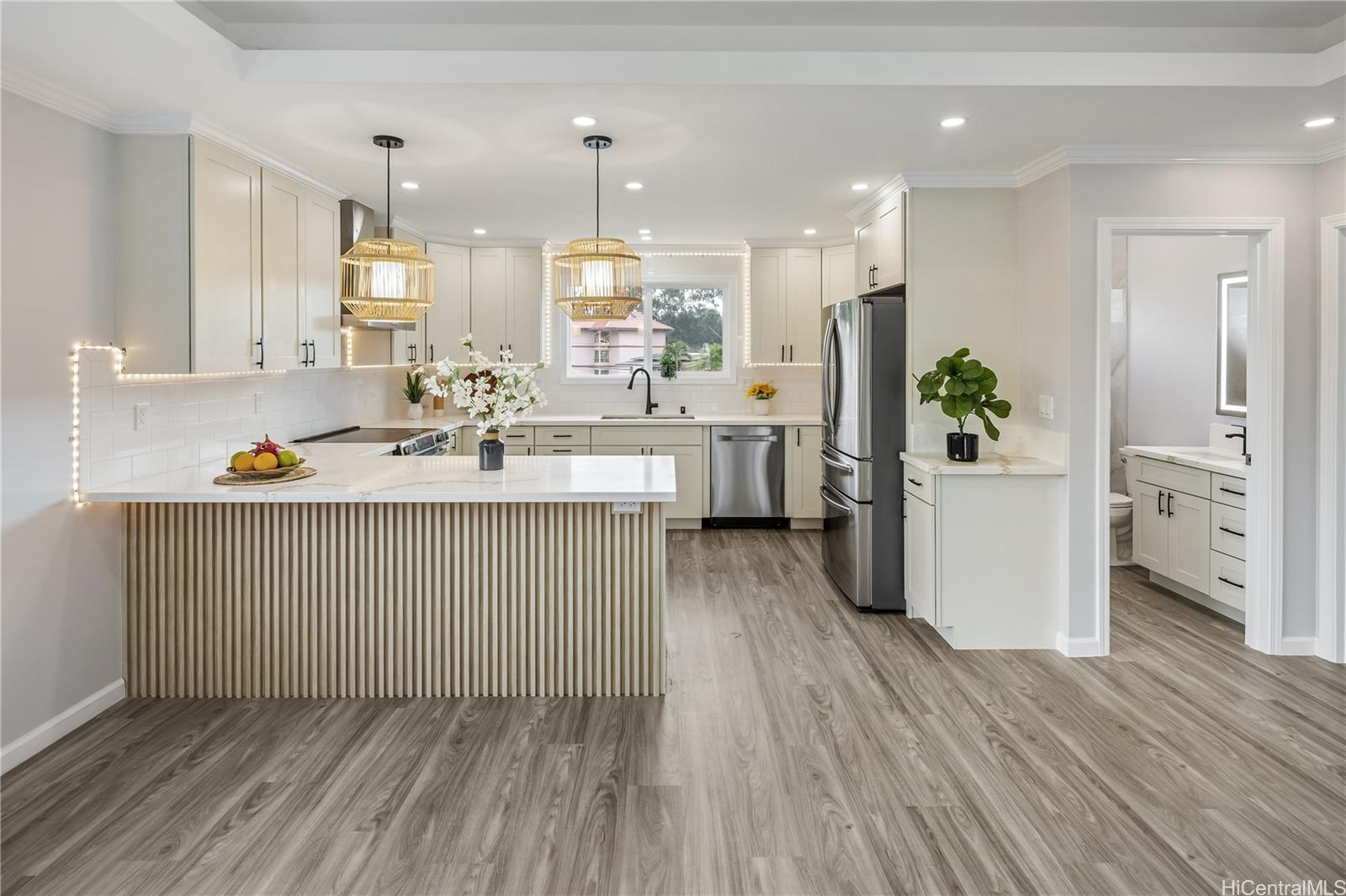 Discover this stunning brand-new 2-story single-family home in Wahlawa, expertly crafted with both luxury and functionality In mind. This spacious residence offers 5 bedrooms, 4 full bathrooms, and a 2-car garage, providing ample room for multi-generational living or flexible lifestyle needs. The first floor features 2 bedrooms, 2 full bathrooms, and a beautifully appointed spacious wetbar, making It Ideal for extended family or guests. Elegant tile flooring creates a sleek and modern feel throughout the level.Upstairs, the second floor features 3 bedrooms, 2 bathrooms, and a large open-concept kitchen with premium finishes-perfect for cooking, entertaining, and everyday living. vinyl plank flooring enhances the contemporary appeal. Luxury muti-split A/C units throughout keep the home cool year-round. The upstairs Ilving room and primary bedroom are highlighted by a fascinating suspended celling with custom lighting, adding a sophisticated architectural touch. Enjoy the peace and comfort of this Wahlawa neighborhood while being Just minutes from schools, dining, shops, and the scenic Wahlawa Freshwater State Recreation Area, Schofleld Barracks and Wheeler Army Airfield!