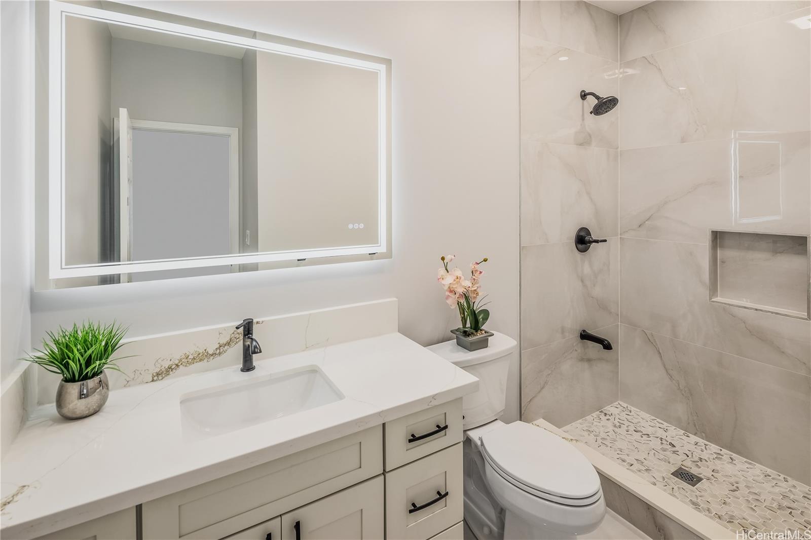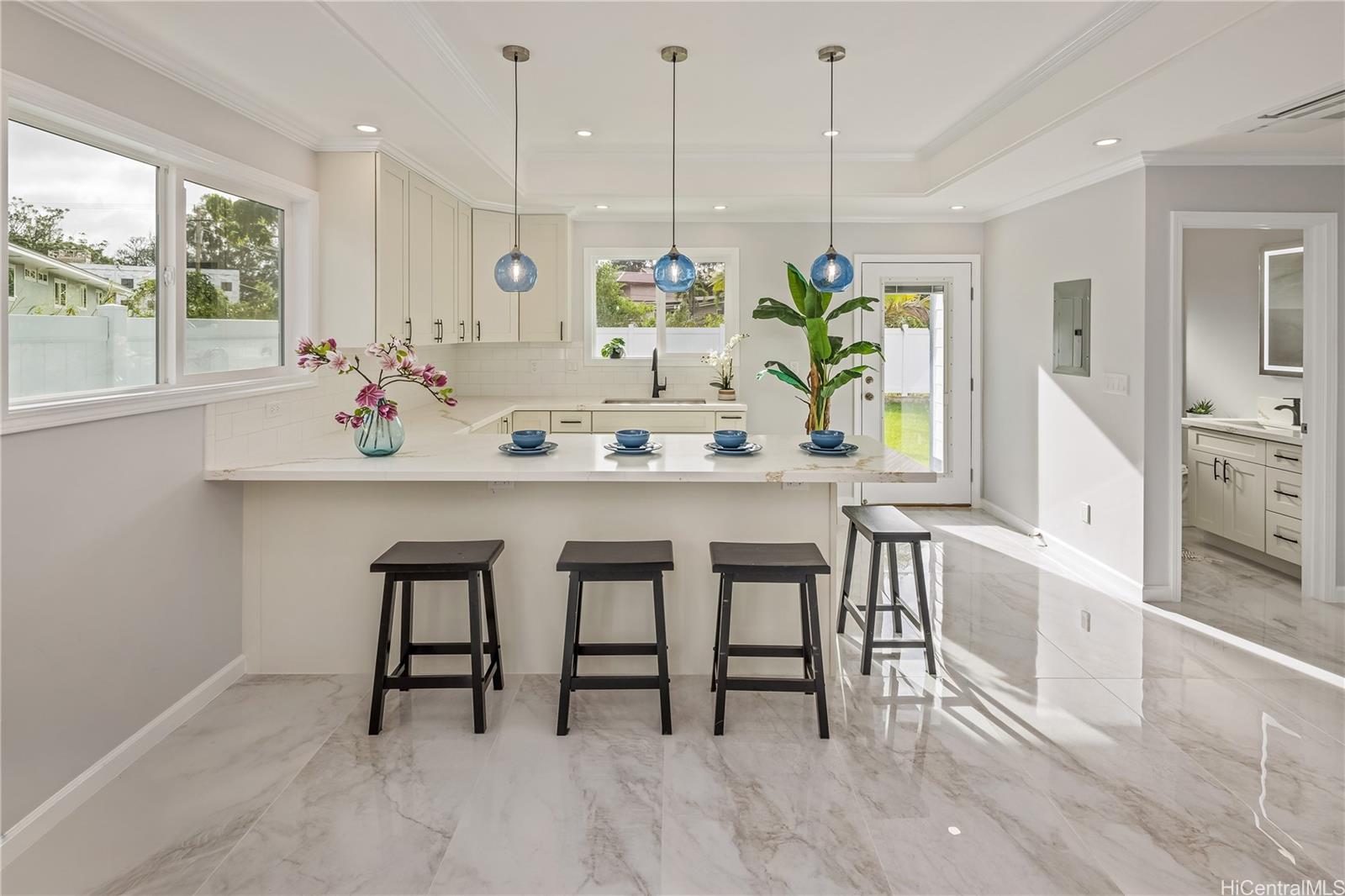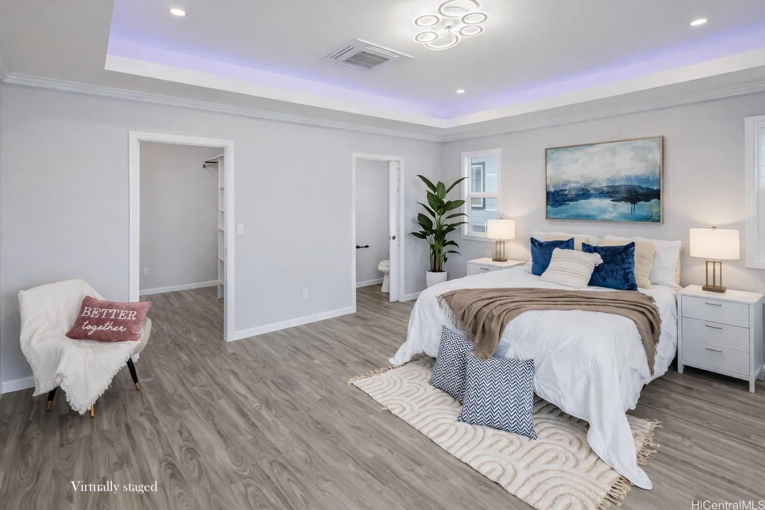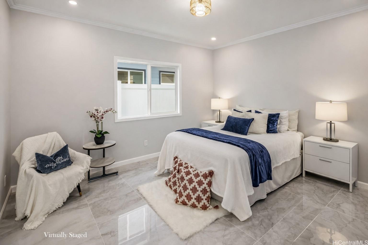 Discover this stunning brand-new 2-story single-family home in Wahlawa, expertly crafted with both luxury and functionality In mind. This spacious residence offers 5 bedrooms, 4 full bathrooms, and a 2-car garage, providing ample room for multi-generational living or flexible lifestyle needs. The first floor features 2 bedrooms, 2 full bathrooms, and a beautifully appointed spacious wetbar, making It Ideal for extended family or guests. Elegant tile flooring creates a sleek and modern feel throughout the level.Upstairs, the second floor features 3 bedrooms, 2 bathrooms, and a large open-concept kitchen with premium finishes-perfect for cooking, entertaining, and everyday living. vinyl plank flooring enhances the contemporary appeal. Luxury muti-split A/C units throughout keep the home cool year-round. The upstairs Ilving room and primary bedroom are highlighted by a fascinating suspended celling with custom lighting, adding a sophisticated architectural touch. Enjoy the peace and comfort of this Wahlawa neighborhood while being Just minutes from schools, dining, shops, and the scenic Wahlawa Freshwater State Recreation Area, Schofleld Barracks and Wheeler Army Airfield!