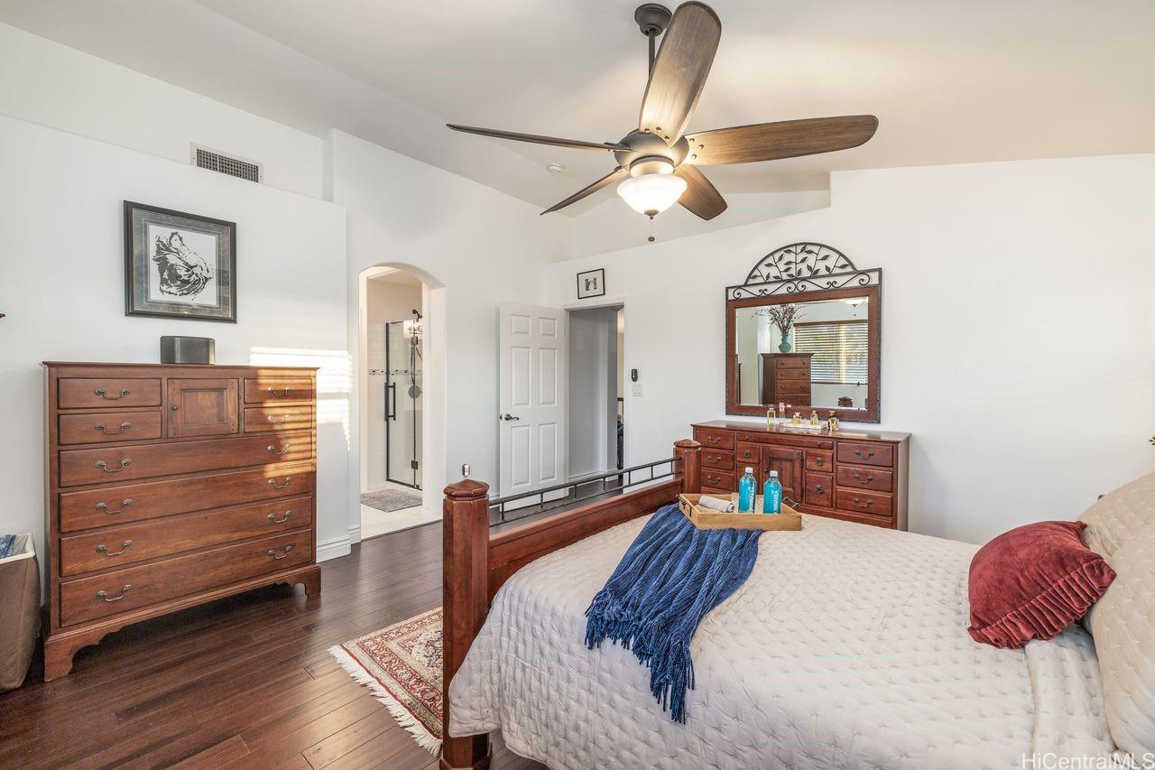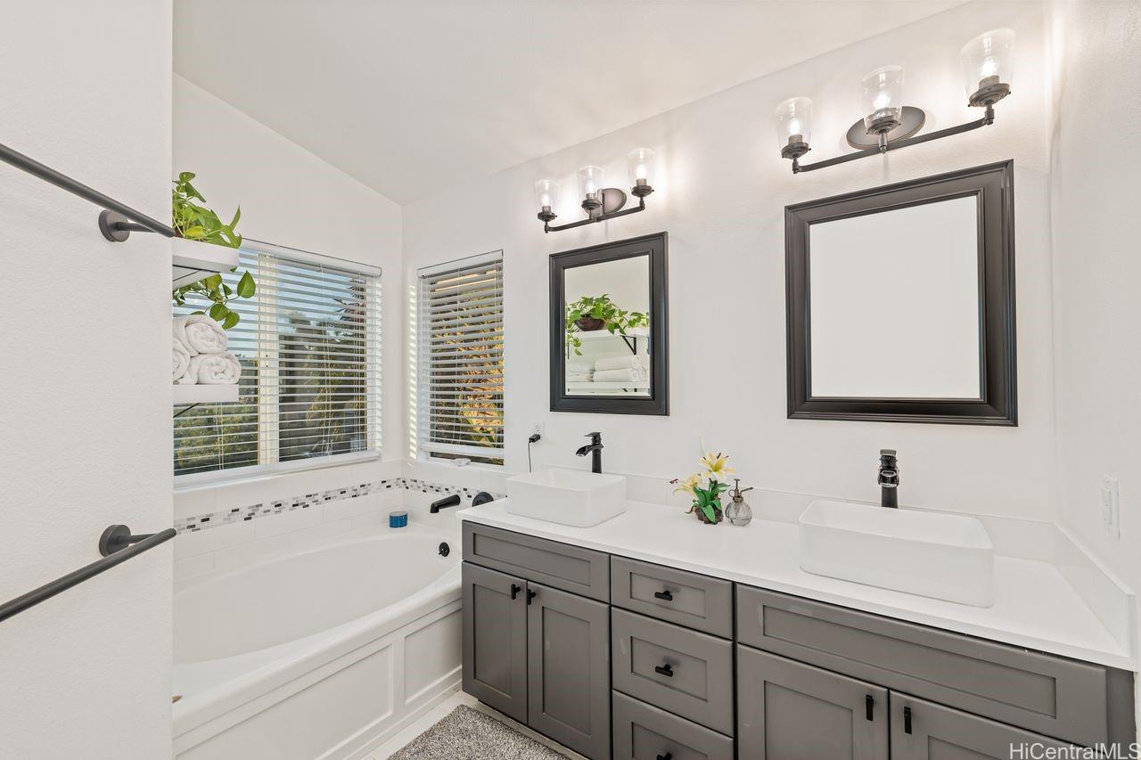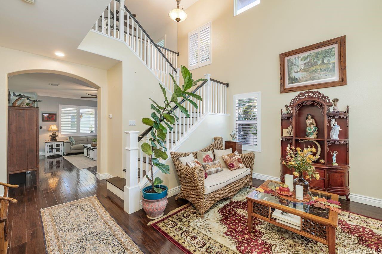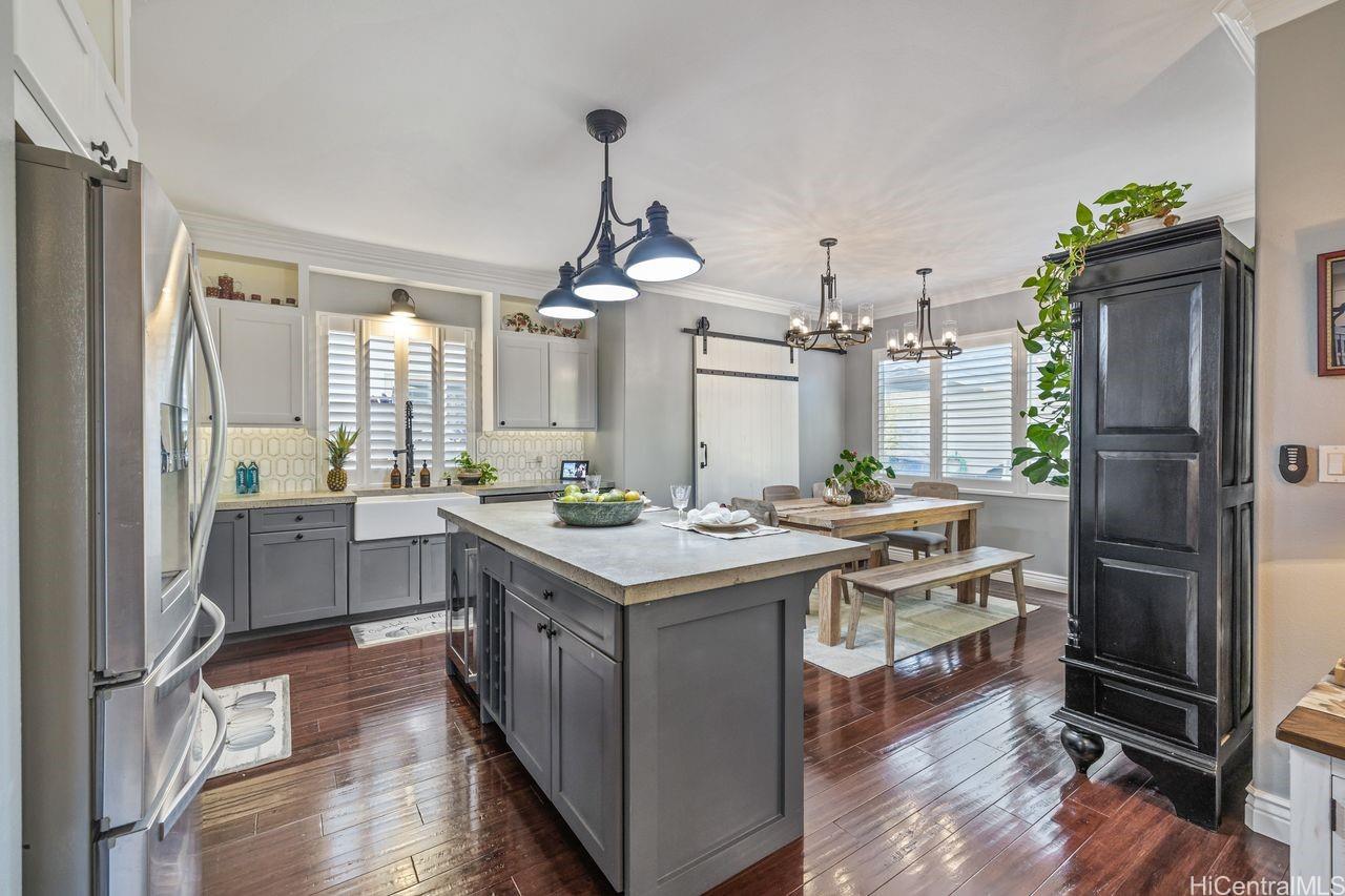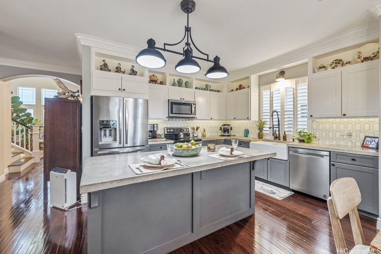 Welcome Home to this incredible sanctuary boasting 5 bedrooms and 4 full baths on a corner lot with a detached studio showcasing a full bath and wet bar in the prestigious Ocean Pointe neighborhood. This stunning home features spectacular features in every room from its custom chef inspired kitchen to its meticulous landscaped private backyard oasis. No expense was spared or overlooked in this sophisticated modern day masterpiece. The primary bedroom has a serene spa like bathroom with a with his and hers sink. The hand scraped hardwood floors with wood baseboard throughout. Thoughtfully designed with an expansive 2,436 square feet of interior living space, 48 solar panels and 3 Tesla Batteries. Minutes away from Ka Makana Ali’i mall, beaches, schools, world famous golf courses and dining. Come see for yourself what everyone is talking about. For those searching for a stunning retreat, Welcome home.