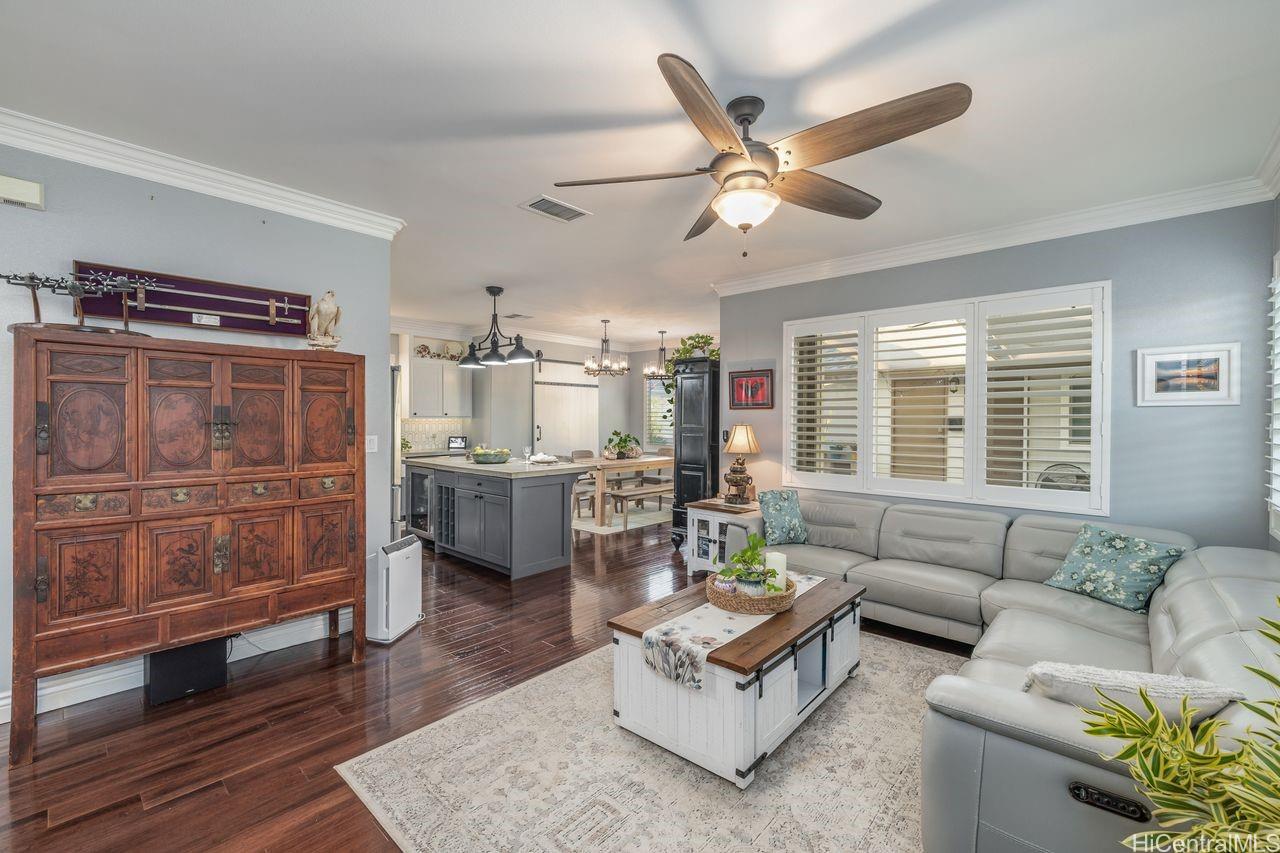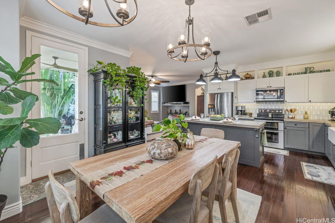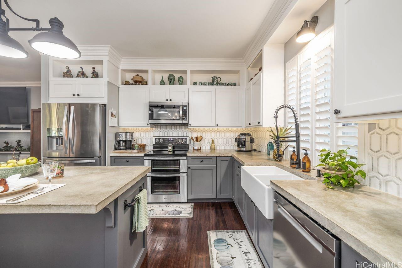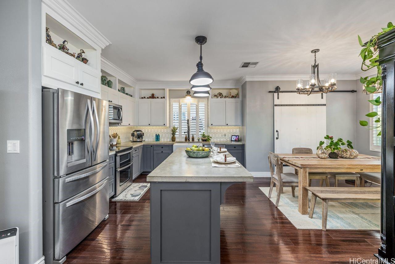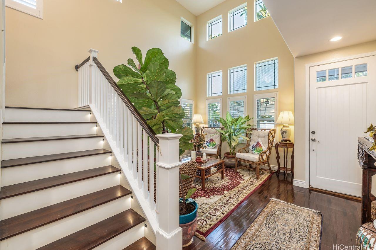 Welcome Home to this incredible sanctuary boasting 5 bedrooms and 4 full baths on a corner lot with a detached studio showcasing a full bath and wet bar in the prestigious Ocean Pointe neighborhood. This stunning home features spectacular features in every room from its custom chef inspired kitchen to its meticulous landscaped private backyard oasis. No expense was spared or overlooked in this sophisticated modern day masterpiece. The primary bedroom has a serene spa like bathroom with a with his and hers sink. The hand scraped hardwood floors with wood baseboard throughout. Thoughtfully designed with an expansive 2,436 square feet of interior living space, 48 solar panels and 3 Tesla Batteries. Minutes away from Ka Makana Ali’i mall, beaches, schools, world famous golf courses and dining. Come see for yourself what everyone is talking about. For those searching for a stunning retreat, Welcome home.