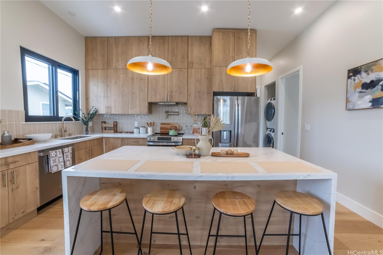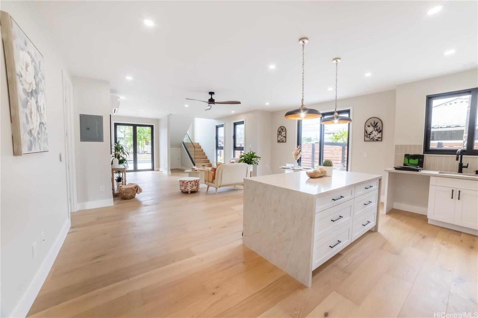Experience modern island living in this BRAND NEW single-family home, thoughtfully designed with open spaces and high-end finishes throughout. Located in desirable Kailua, this newly built residence blends contemporary architecture with the relaxed comfort of Hawai’i living. The home features a bright, open-concept floor plan (allowing for multi generational living) with soaring ceilings, recessed lighting, and wide-plank flooring.The designer kitchen is a showstopper, offering custom wood cabinetry, quartz countertops, stainless steel appliances, and a spacious island perfect for entertaining. Seamless indoor-outdoor flow creates an inviting space for everyday living and gatherings. Bathrooms are beautifully appointed with modern fixtures, large-format tile, and spa-inspired details, including a luxurious walk-in shower and freestanding soaking tub. Thoughtful finishes and neutral tones throughout create a calm, sophisticated aesthetic.