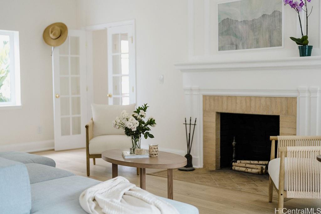 Originally built in 1929, this storied residence stands as a rare architectural treasure—one that has gracefully evolved while honoring its historic soul. Offered for the first time in 75 years, 3198 Alika Avenue is more than a home; it’s a love letter to an era of elegance and craftsmanship, thoughtfully reimagined for modern living. Set on a 12,699 sq. ft. corner parcel in coveted Dowsett, the home’s beautifully preserved Colonial Revival façade with beveled siding and board-and-batten detailing opens to interiors that blend old-world character with modern sophistication. Natural light pours across white oak floors, illuminating arched doorways, wainscoting, and bespoke millwork. Designed for today’s island lifestyle, the home offers seamless indoor–outdoor living with multiple lanais for dining and entertaining amid lush gardens that evoke Nu‘uanu’s timeless serenity.Inside you’ll find: four bedrooms including two full primary suites (one on each level) + an attached ADU for guests, multi-generational living, or office; a chef’s kitchen with Bosch appliances, marble counters, and a waterfall island; and tranquil outdoor spaces surrounded by mature landscaping.