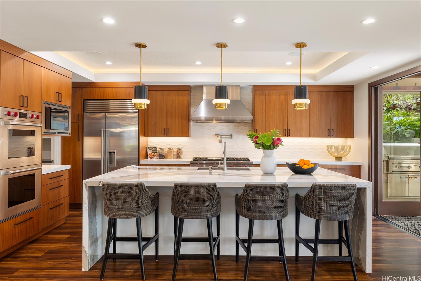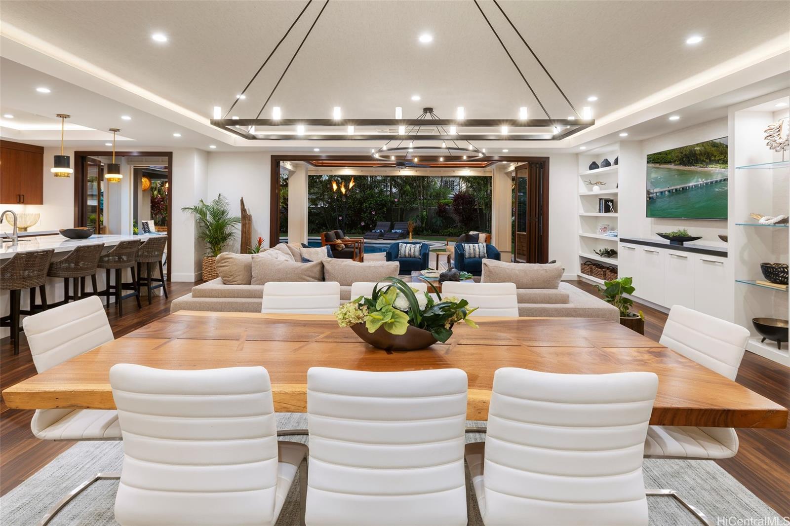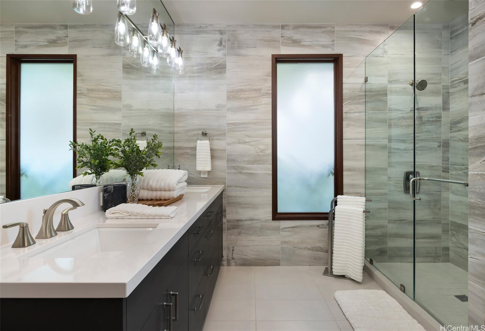 Experience elevated island living in this exceptional 2021 newly constructed home of over 6000sf of refined interior. This 5-bd,5.5+ bth residence has 4 en-suite bedrooms,featuring an upstairs primary suite w/Ocean,Diamond Head,& Koko Head views,a large sitting room & a to-die-for walk-in closet. The private downstairs suite is ideal for guests or multi-generational living. Professionally designed & fully furnished by Cathy Lee Style, the home showcases wood floors,premium finishes, La Cantina doors & Marvin windows for seamless indoor-outdoor living. The chef’s kitchen is equipped w/Sub-Zero/Wolf appliances, gas range, walk-in pantry & butler’s pantry. Enjoy a resort-style backyard w/a saltwater pool,spa,outdoor kitchen,cabana w/bath,lush landscaping w/tiki torches to complete your outdoor entertainment space. Additional: Bonus room,office,split/central A/C,motorized shades,2 laundry&custom California Closets. This home is protected by a DaVinci Roofscapes synthetic shake tile roof; known for it’s 50+ year longevity. Energy-efficient w/55 owned PV panels, 3 Tesla Powerwalls, EV chargers, secured w/gated entry finished w/a dream garage. Quiet neighborhood w/gated ocean access&dock.