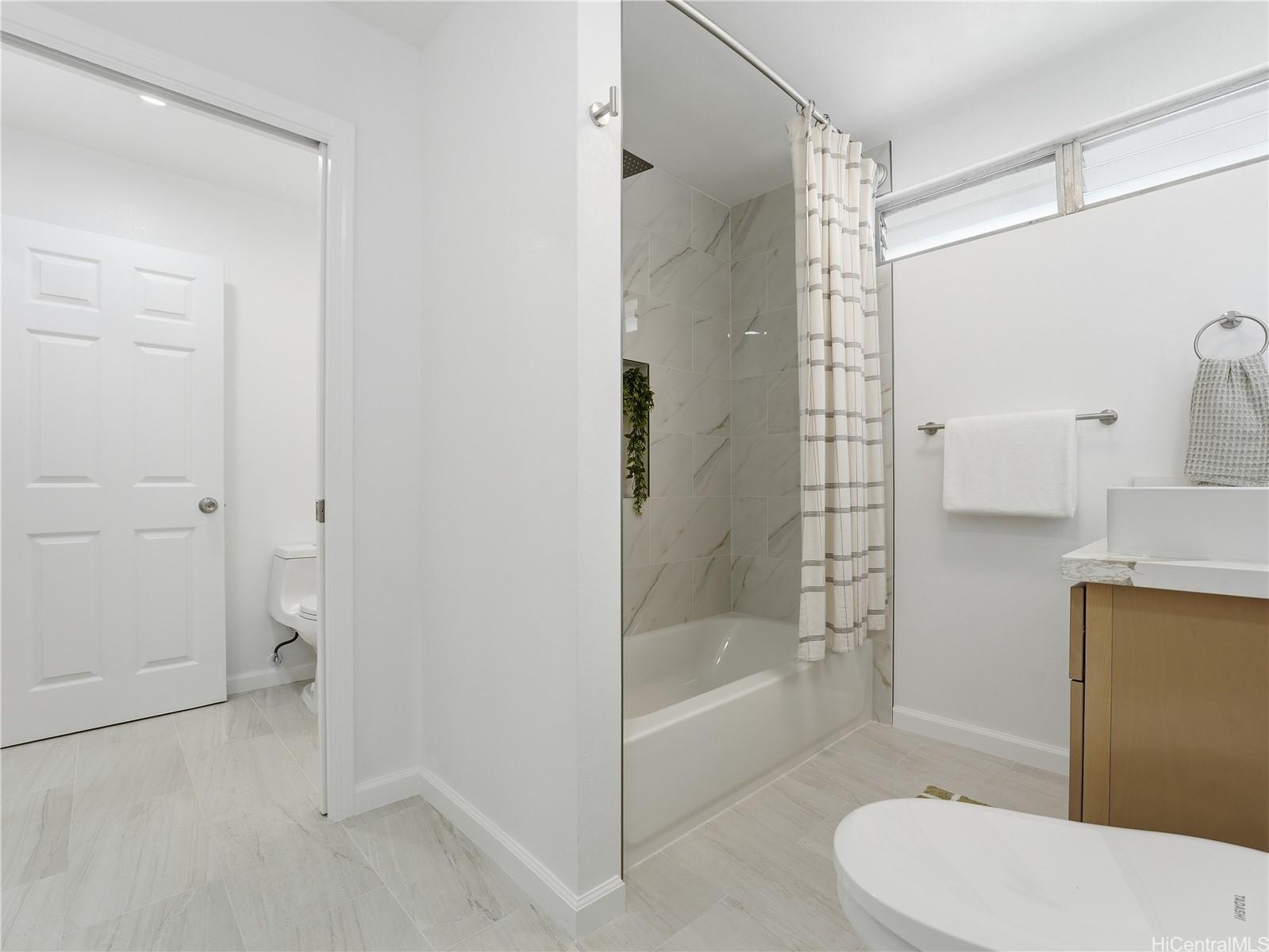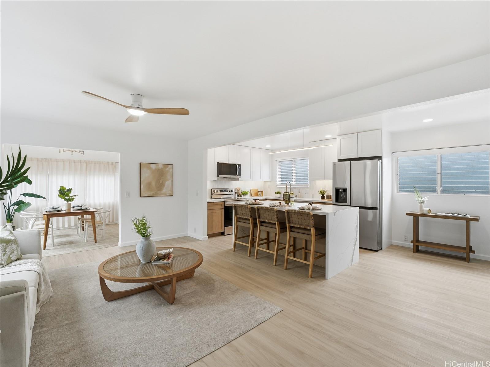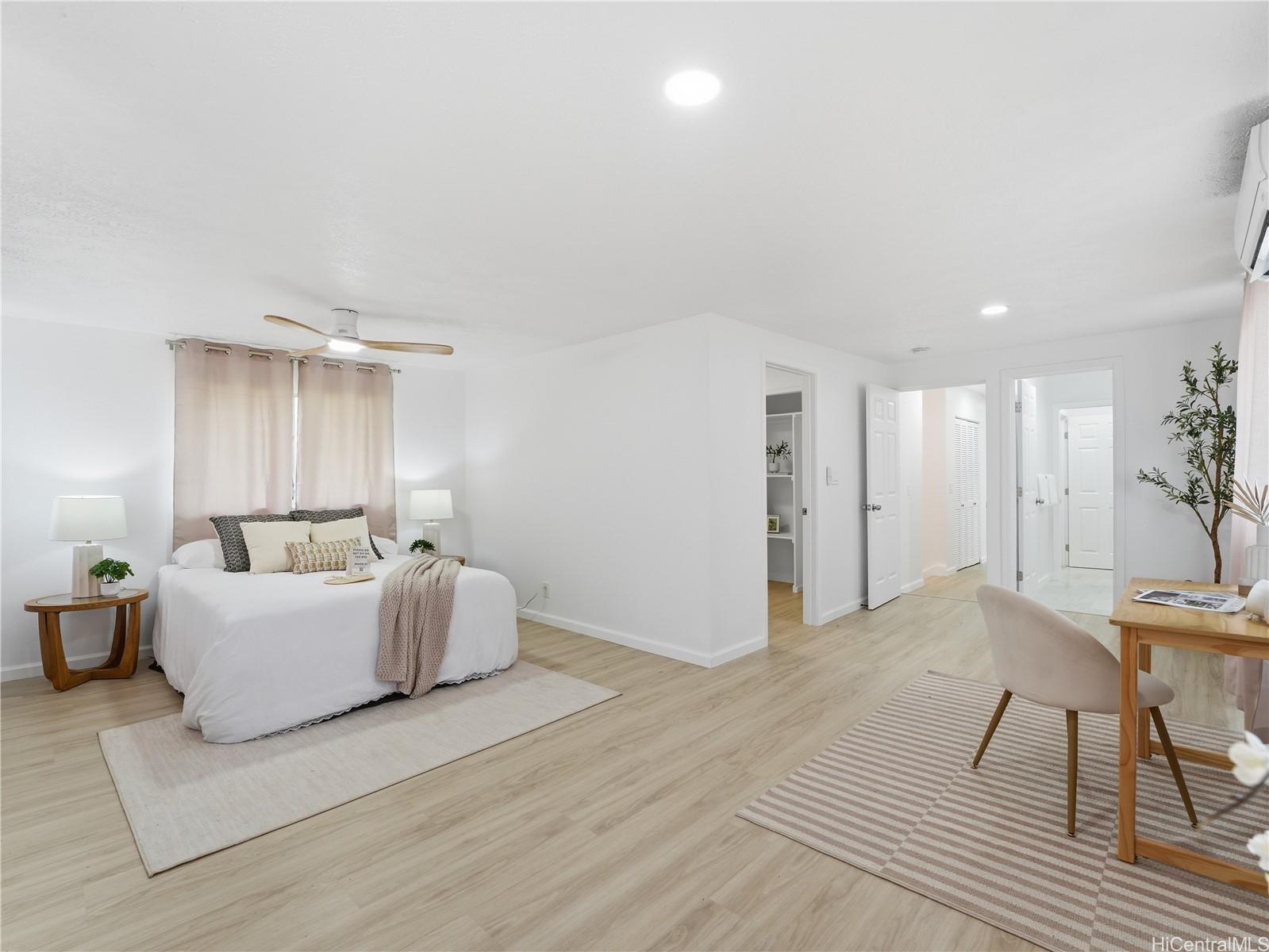 A rare combination of scale, sophistication, and value, this fully renovated 6-bedroom residence delivers modern luxury living just 1 block from Pearl City Shopping Center and is priced below appraised value! Intentional design throughout, the home offers an expansive, light-filled interior finished with timeless tones and enhanced by striking contemporary lighting. Open-concept layout flows effortlessly into a chef’s kitchen featuring quartz waterfall-edge countertops, custom cabinetry, & premium appliance package. The first level includes a bedroom and full bathroom, providing flexibility for guests or multigenerational living. Upstairs, the spacious 324 sq ft primary suite serves as a true retreat, complete with a walk-in closet. In total, the home features three walk-in closets, offering exceptional storage and organization. Sleek bathrooms feature LED backlit mirrors, modern fixtures & luxury washlets for elevated comfort. Split AC, 42 photovoltaic panels and parking for 5. Blending modern elegance, thoughtful functionality in a highly convenient location near shopping, dining, and daily essentials, this exceptional home stands out as a rare opportunity in today’s market.