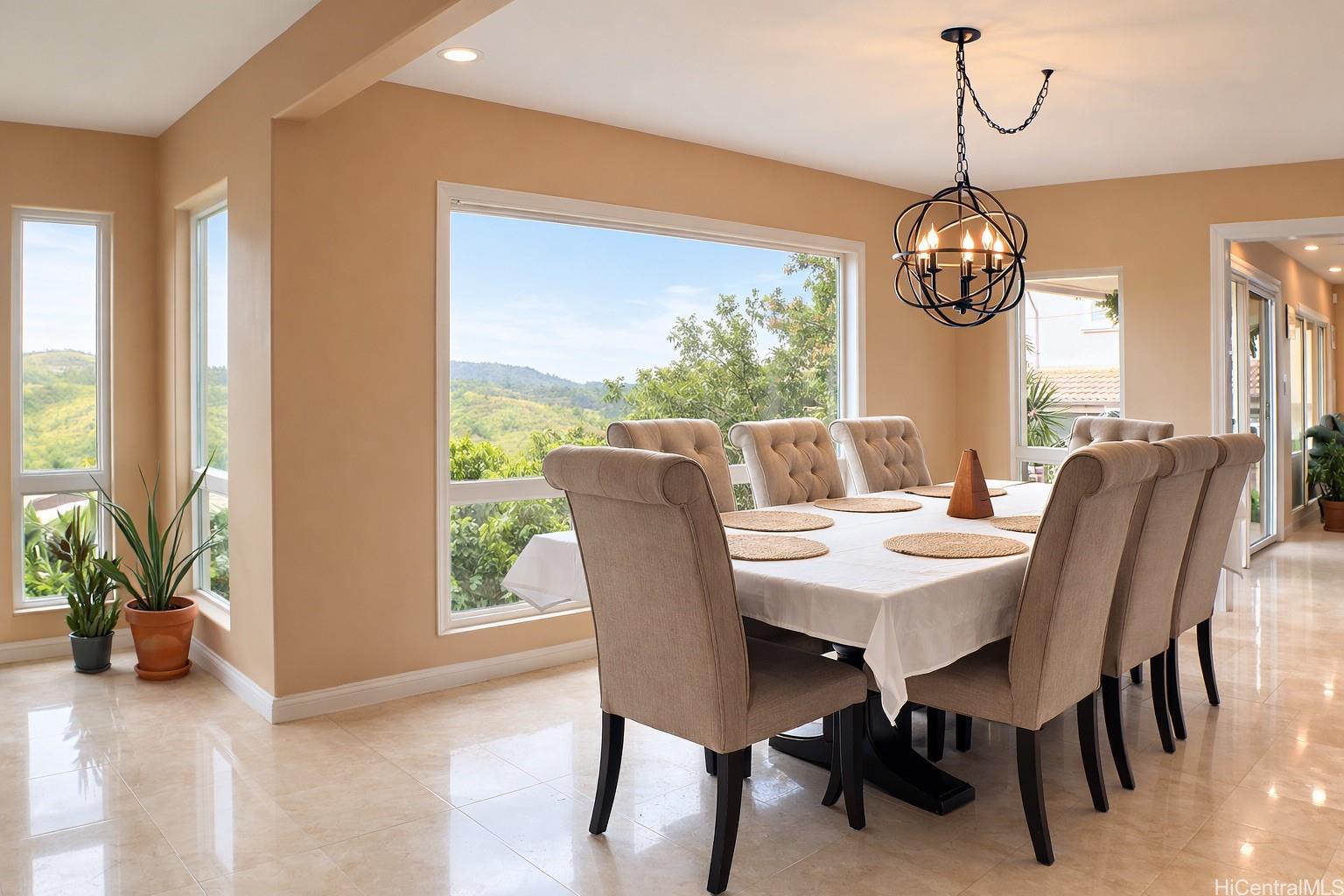 人気のマカキロ地区に位置するこの素晴らしい6ベッドルーム、3バスルームの豪華な邸宅からは、パールシティからホノルルに至る息をのむようなパノラマビューが広がり、夜には美しい街の明かりを楽しみ、一年中心地よい島のそよ風を感じることができます。 裏手に隣家がないため、この物件は手つかずの自然美が残る静かな谷に面しており、抜群のプライバシーが確保されています。 柔軟な間取りが特徴で、バスルームは改装済みです。2階全体と1階の5番目の寝室にはエンジニアードハードウッドフローリングが、1階とバスルームにはトラバーチン床材が敷かれています。 上品なプランテーションシャッターと、ミニブラインドが組み込まれた3枚のペラ製引き戸が、スタイルと機能性を兼ね備えています。 8台のスプリット型エアコンと7台の天井ファンで、快適に過ごせます。 47枚のパネルからなる自家用太陽光発電システム(住宅用41枚、給湯器用6枚)により、エネルギー効率が向上しています。 その他の設備としては、家全体をカバーする浄水システム、サラウンドサウンド、そしてスプリンクラー設備が整った手入れの行き届いた庭などが挙げられます。 この住宅には3台収容可能なガレージと、さらに駐車スペースを確保できる広々とした車道も備わっており、マカキロの眺望を楽しめるこの物件は、まさに希少な物件です。 .