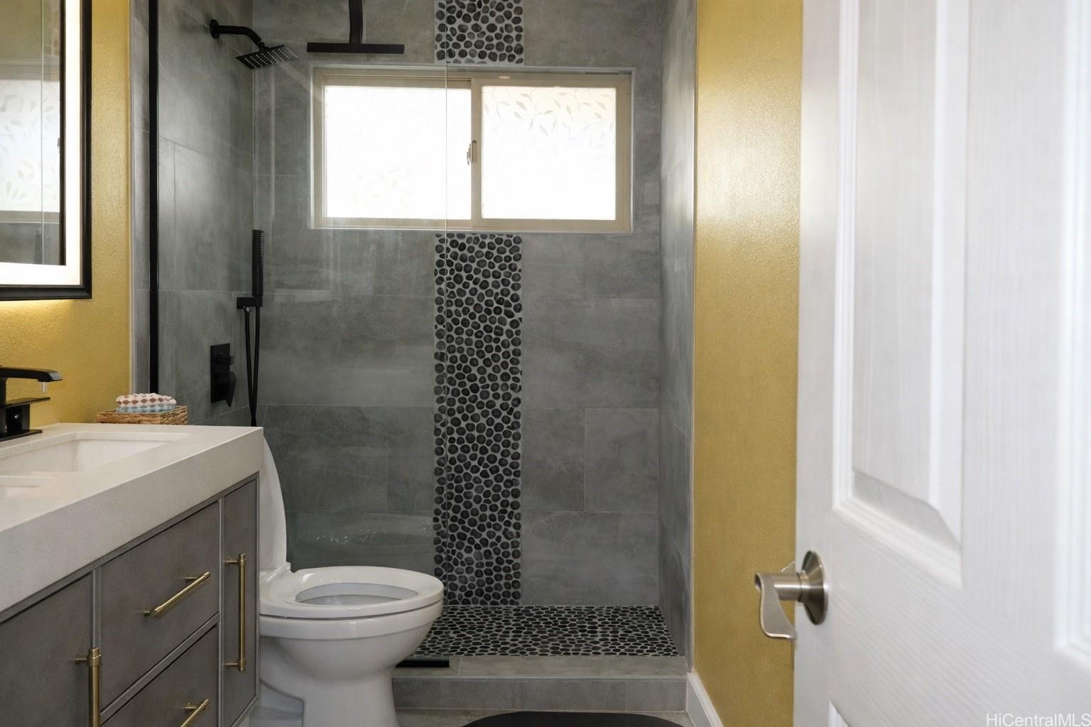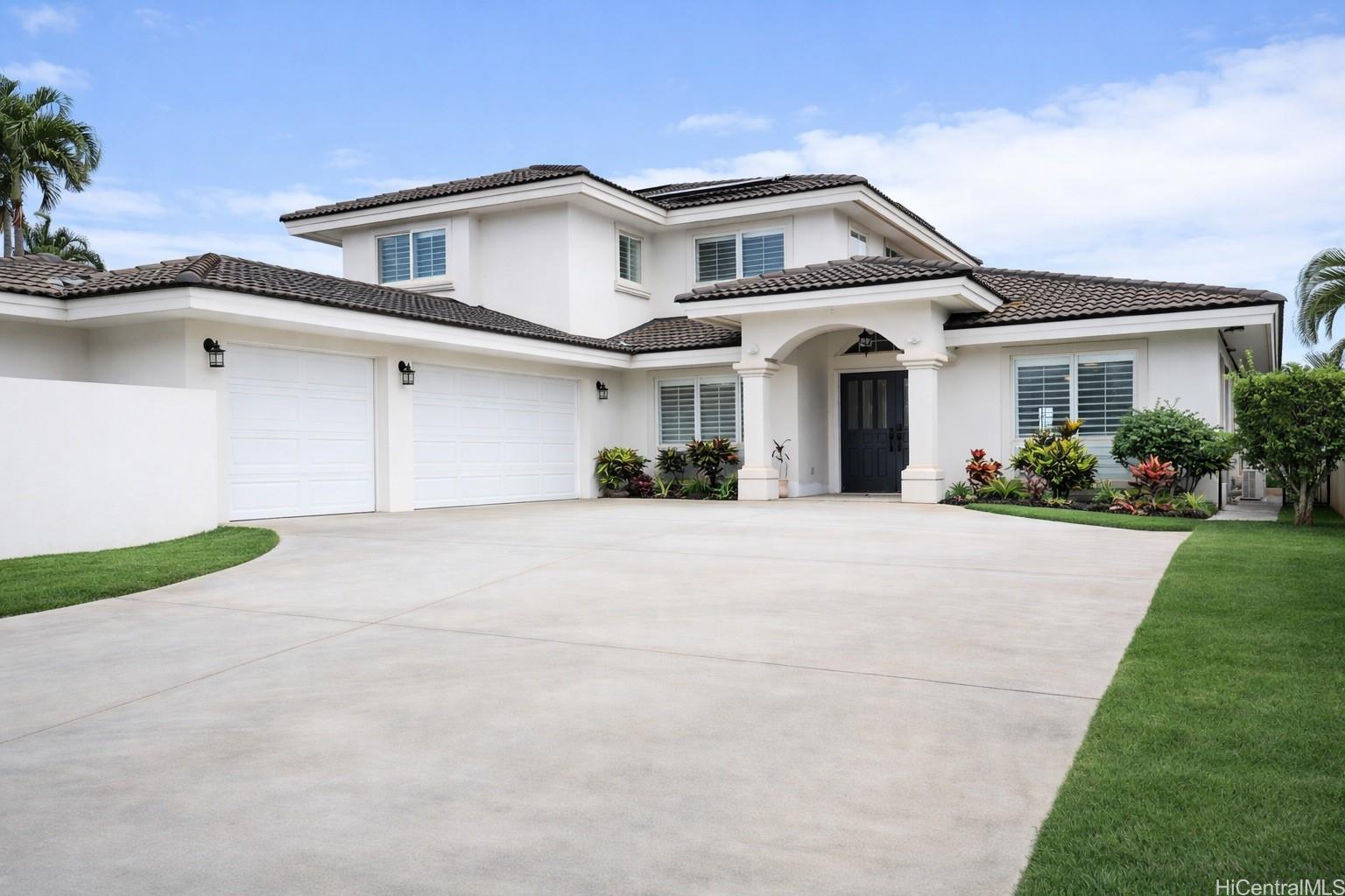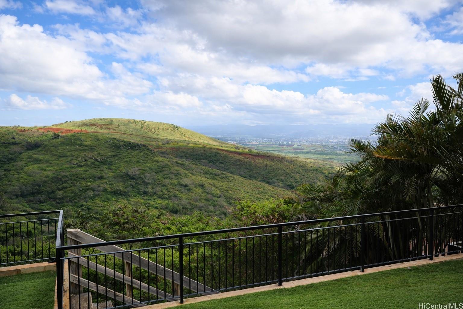 Perched in desirable Makakilo, this stunning 6-bedroom, 3-bath luxury home offers breathtaking panoramic views from Pearl City to Honolulu, with beautiful city lights at night and cool island breezes year-round. With no back neighbor, the property backs to a peaceful valley with untouched natural beauty, creating exceptional privacy.The flexible floor plan features remodeled bathrooms, engineered hardwood flooring throughout the 2nd floor and bedroom #5 downstairs, and travertine flooring on the 1st floor and bathrooms. Elegant plantation shutters and three Pella sliding doors with built-in mini blinds add style and functionality.Stay comfortable with 8 split A/C units and 7 ceiling fans. Energy efficiency is enhanced by a 47-panel owned PV system (41 for the home, 6 for the water heater). Additional features include whole-home water purification, surround sound, and a well-maintained yard with sprinkler system.The home also offers a 3-car garage and spacious driveway for additional parking, making this Makakilo view property a rare opportunity.