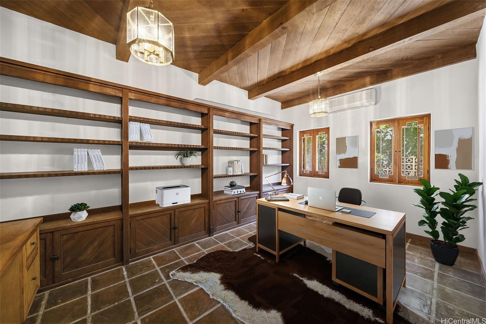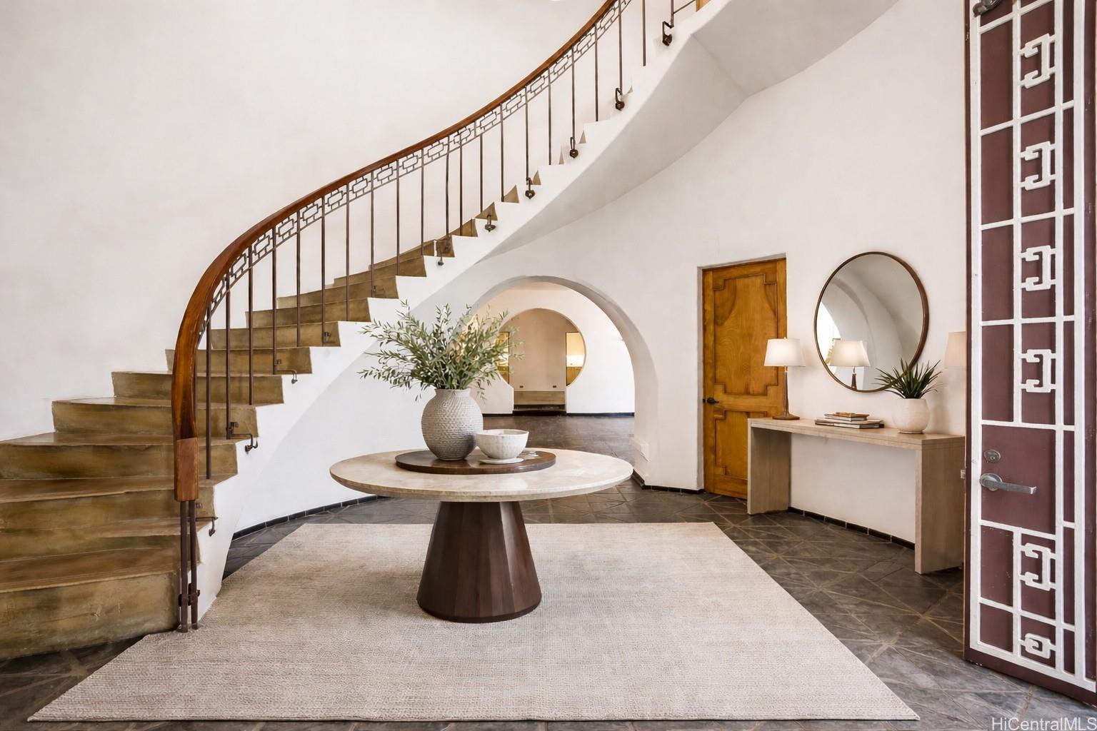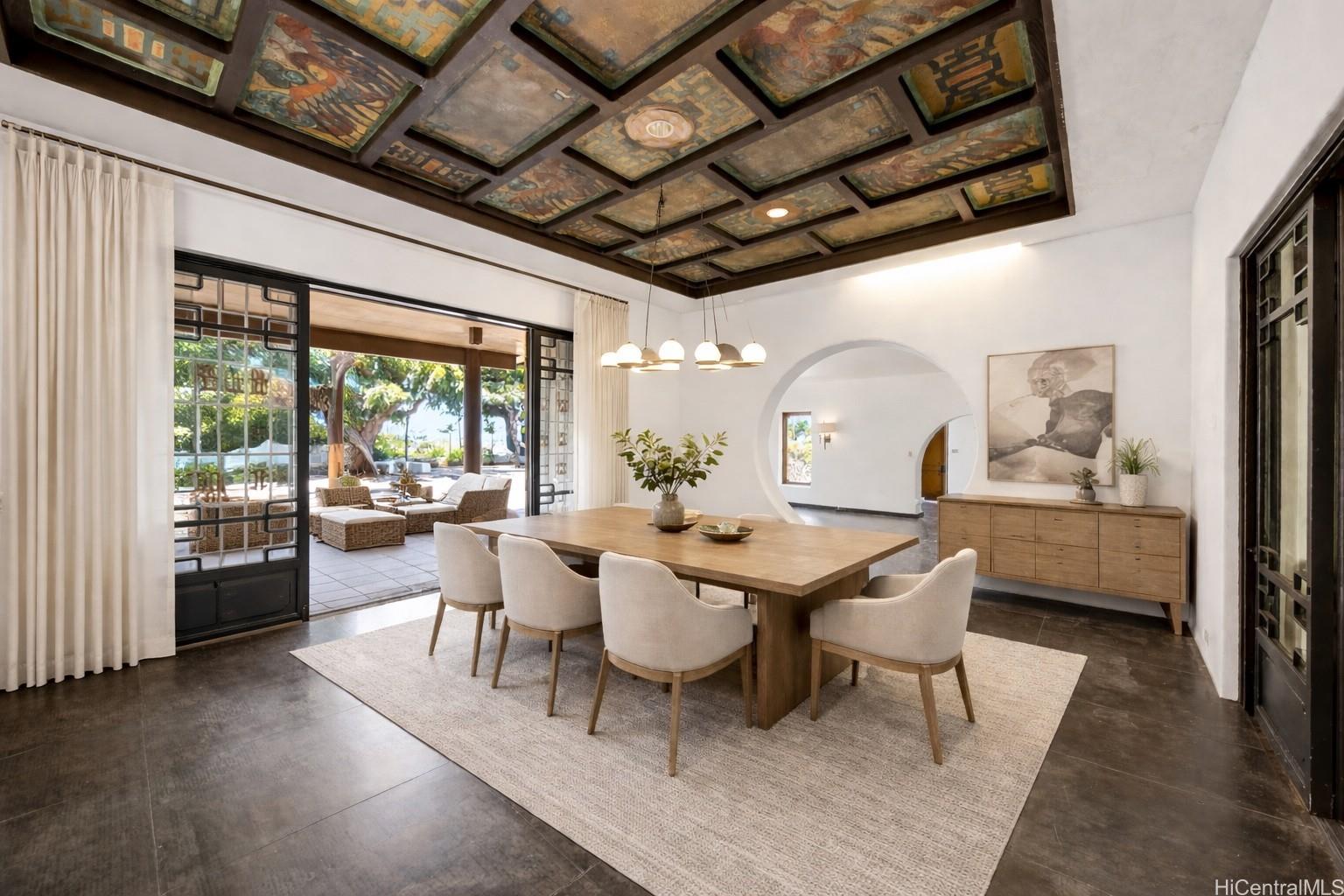 Location, beauty, and privacy come together in a unique estate nestled on the slopes of Diamond Head. This one-of-a-kind Noela Drive villa was originally built in 1934. It seamlessly integrates indoor and outdoor living with an Asian-inspired open floor plan, showcasing captivating views of ocean, Diamond Head and the city. Featuring 4,542 square feet of interior living space built on a 23,148 square feet corner lot of land, this architecturally striking estate offers 6 bedrooms and 4.5 bathrooms. On the main floor, there’s a living room, family room, dining room, one bedroom, a caretaker’s room, library/media room. The second floor features a spacious primary bedroom and two additional bedrooms. The living room and dining room open to a spacious outdoor pavilion – the ideal space for entertaining or relaxing poolside. From hand painted ceilings to the intricate staircase, doors, and windows, every detail of this estate (formerly owned by Randolph Crossley) is thoughtfully crafted of the highest quality, creating a custom residence – waiting for its new owner to bring it to life again.