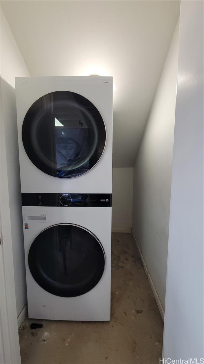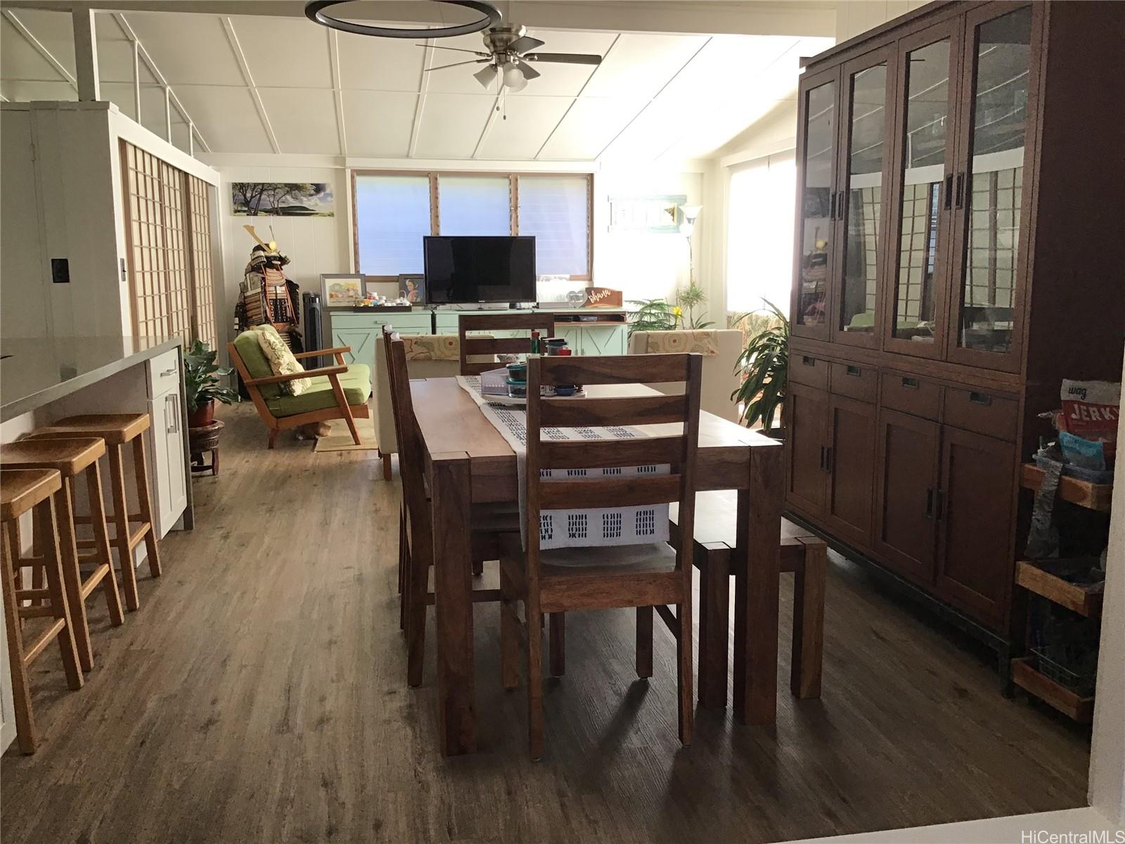 19 owned PV panels and battery back up charger for the downstairs unit. Large spacious multi-generational home. Freshly painted downstairs which has a large primary en-suite w/ enough room for a King size bed, sofa, tv, desk, walk-in closet and new bathroom. 4 bedrooms 2 bathrooms downstairs with a bonus space off the dining room with french doors leading outside. The bonus room can be used for an office, storage, den or craft room. Another bonus a large downstairs laundry room that can be used as an additional pantry space with room to add your own storage shelves to hold small kitchen appliances and Costco goods. The front has a large covered patio as well as a covered patio in the back. Large yard with banana trees and area to garden and children to play. Upstairs has 3 good size bedrooms and 2 bathrooms all tiled flooring. 2nd primary en-suite can fit a King size bed. 2 water heaters on PV. 2 sets of washer/dryers. 2 extra storage areas in the carport and side of the house. Gorgeous views of Pearl Harbor all the way to Ewa Beach and the mountains. Upstairs addition was added 4 years ago with interior staircase and a separate outside entrance. Keyless entry