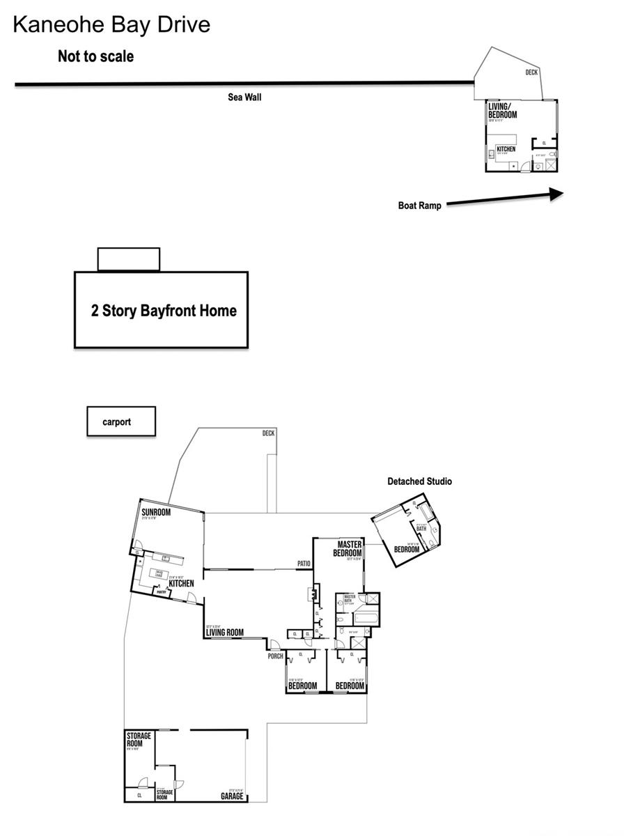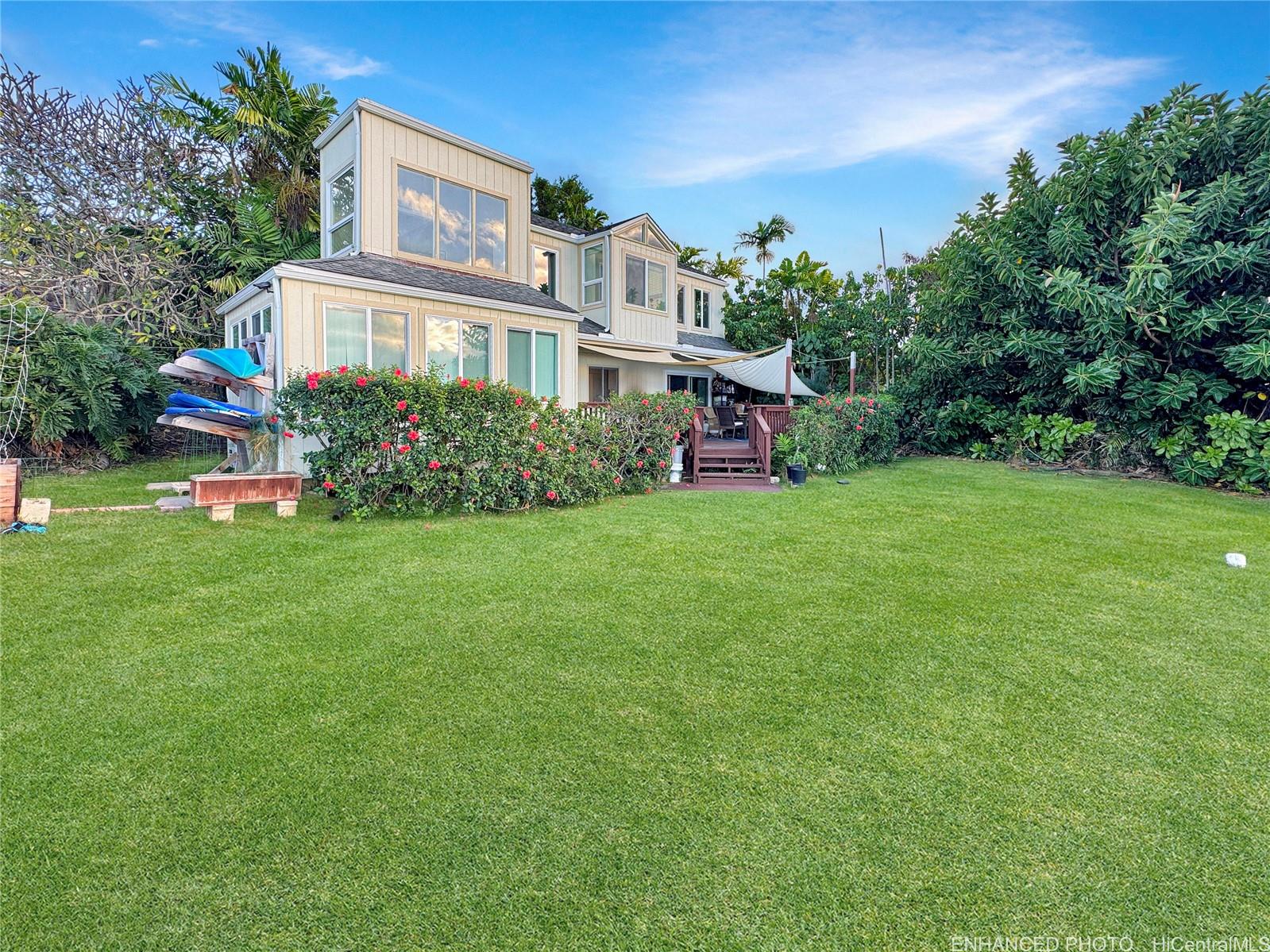 A rare Oceanfront property is available create the perfect Tropical Estate! This extraordinary offering spans over 41,000 sq ft of gently sloping land, capturing sweeping ocean vistas and majestic Koolau mountain views, extending from K-Bay Dr to the shoreline.The contemporary oceanfront two story residence, built in 1985, is permitted with three bedrooms has lots of charm. With a lovely living room, dining area and contemporary kitchen, to expansive grounds and a generous deck designed for unforgettable sunsets. At the water’s edge, a private studio retreat features a kitchenette, full bath, and a wraparound deck that extends over the ocean, complete with its own dock.A charming 1955 beach house offers three bedrooms, two baths, a beamed ceiling living room with fireplace, and a separate studio with full bath—ideal for restoration and your creative touch.With ample space to create an additional residence and rare legacy elements including a seawall, boat ramp, boathouse, and dock, this is a singular opportunity to realize a truly exceptional Hawaiian retreat.