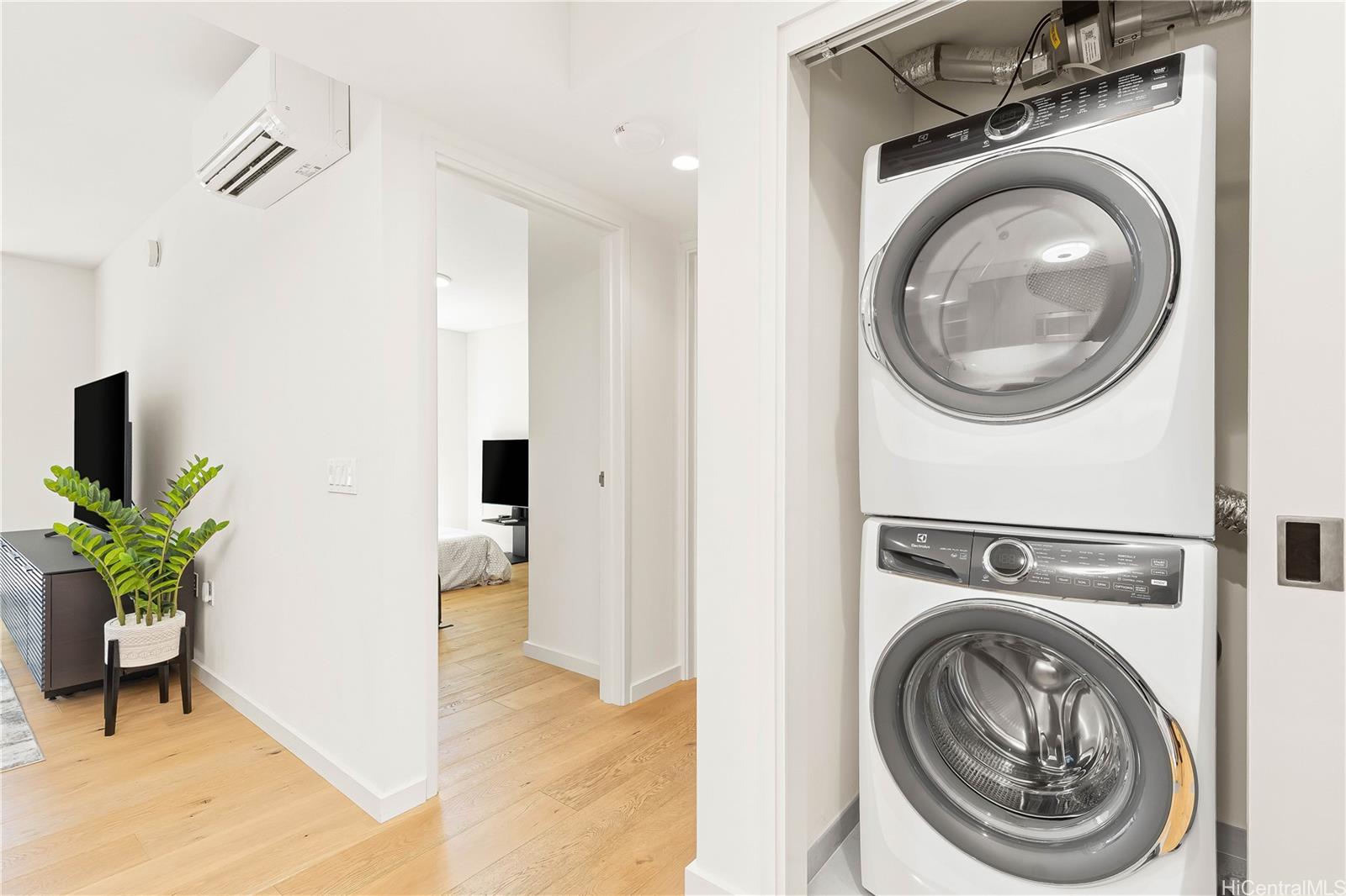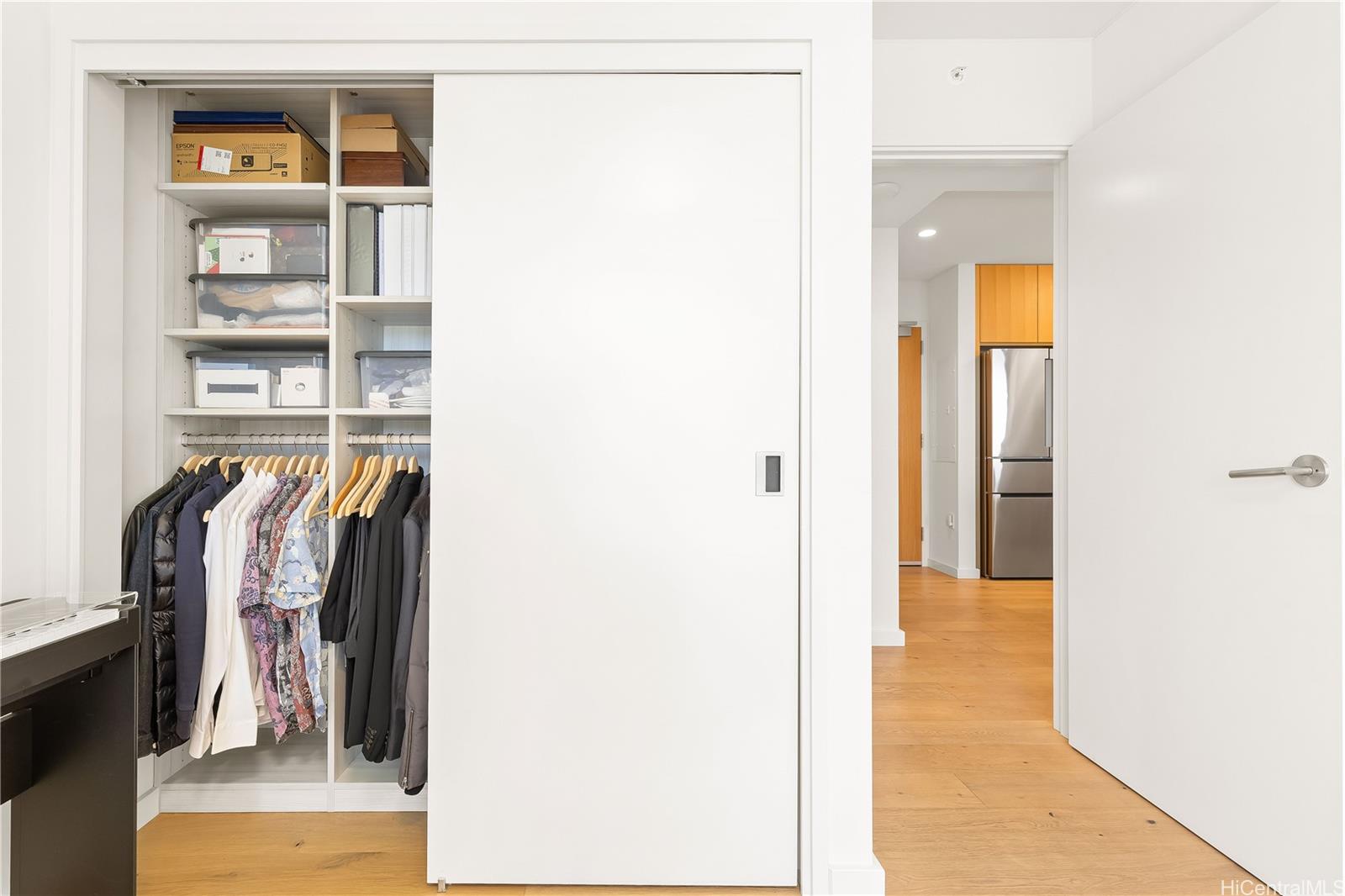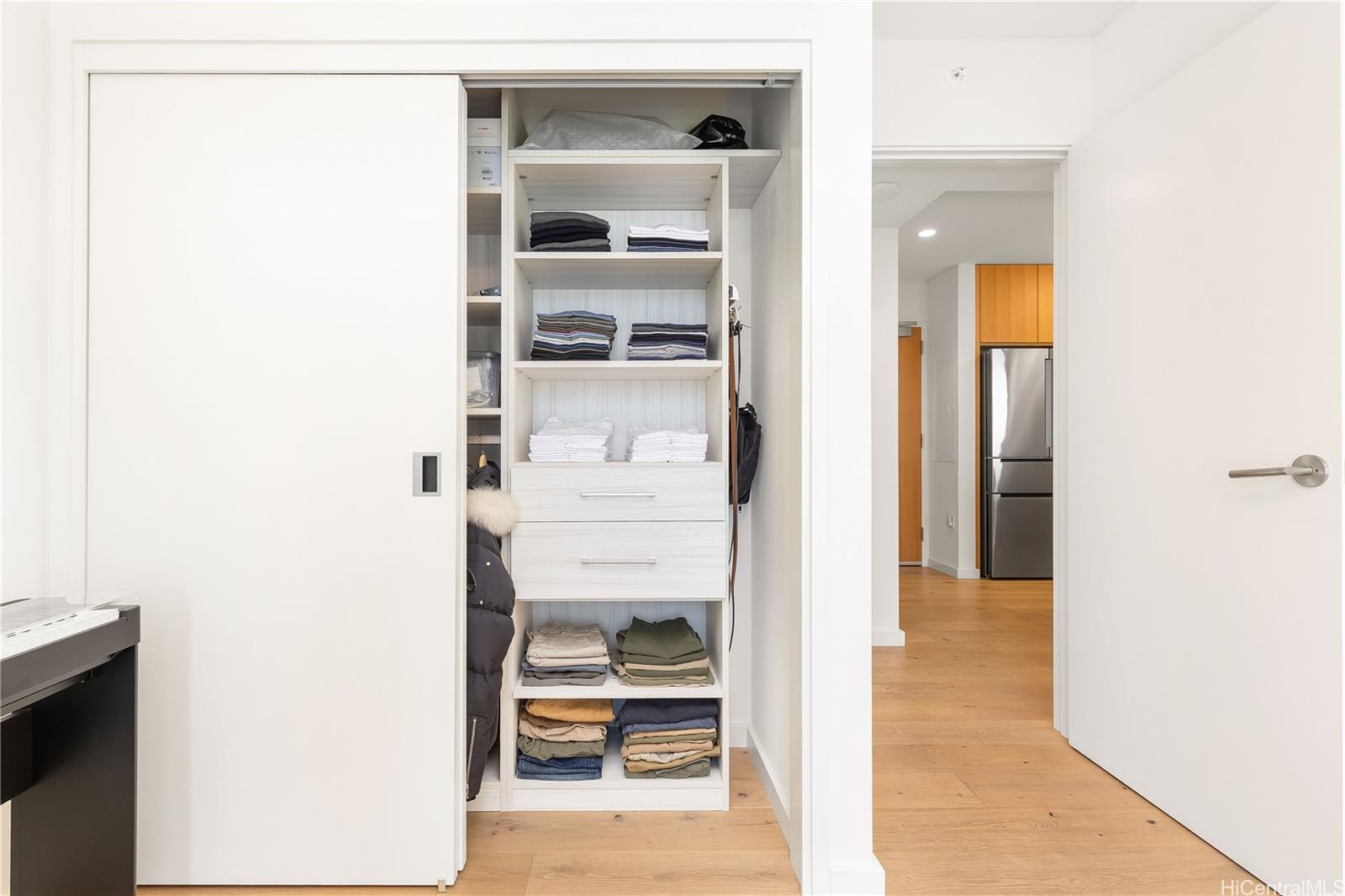This upgraded residence at Sky Ala Moana West features quality finishes and thoughtful improvements throughout. Quality upgrades include engineered white oak wood flooring, upgraded kitchen and laundry appliance packages, Toto Neorest bidet toilet, California Closet system, and Hunter Douglas roller screen shades. Additional storage provides added convenience. The spacious 99 sf lanai offers ocean views and is perfect for relaxing. Residents enjoy a wide range of resort-style amenities including two pools, a fitness center, spa, BBQ cabanas, dog park, children’s play area and multiple private rooms for meetings or celebrations. Conveniently located near Ala Moana Center, dining, shopping and beautiful beaches. The building allows 30-day minimum rental, offering additional flexibility for owners. High end furnishings available for purchase separately.