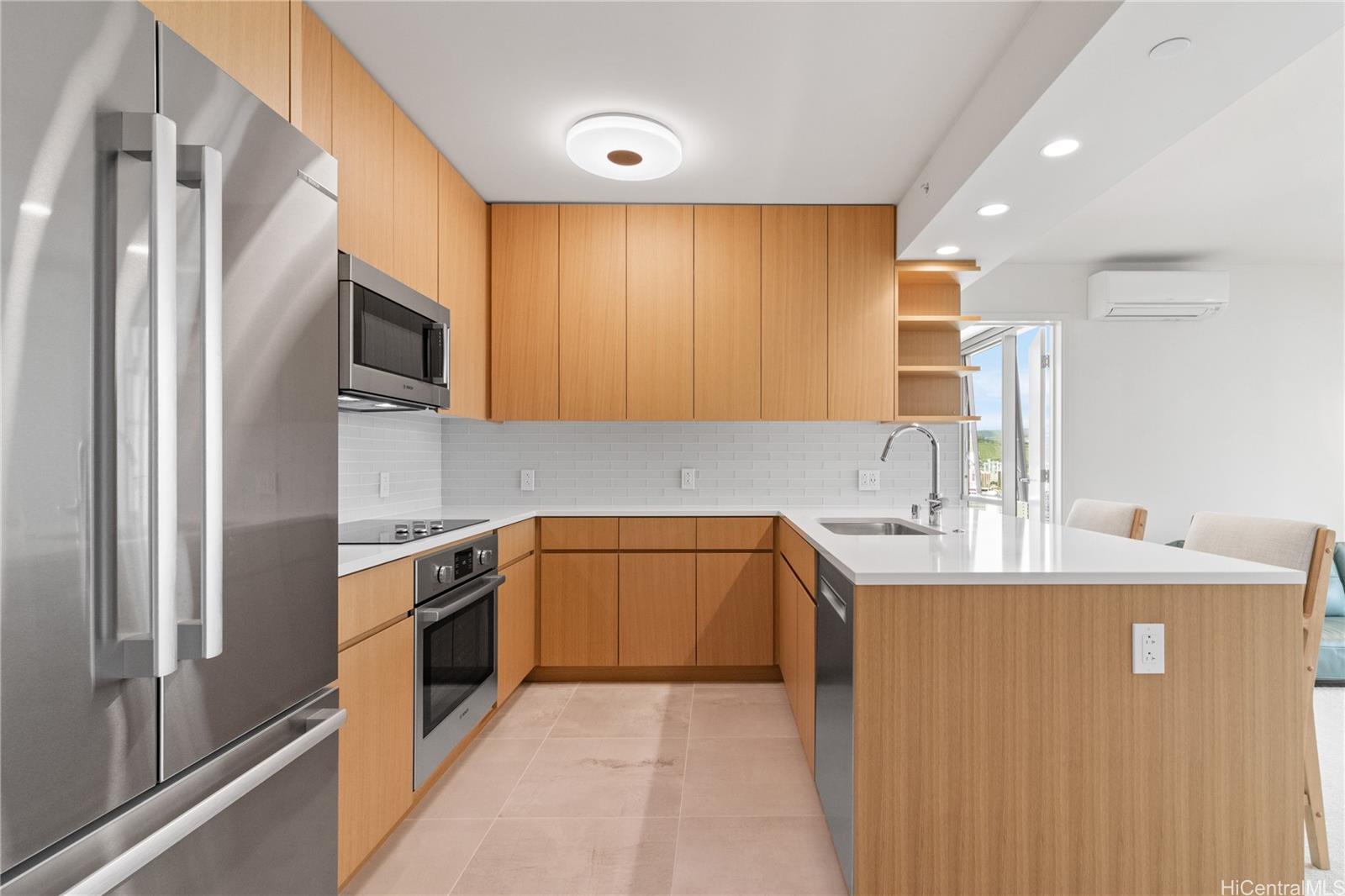 Sky Ala Moana West Unit 2811 offers breathtaking panoramic views of Honolulu’s skyline, lush mountains, and sparkling ocean from its floor-to-ceiling windows and private lanai. The modern kitchen features sleek cabinetry, quartz countertops, and high-end Bosch appliances, creating a seamless blend of style and functionality. Residents enjoy exclusive access to resort-style amenities, including a luxurious pool, open green spaces, and a fully equipped fitness center, as well as the Sky Terrace Spa in the connected hotel tower, featuring a steam and dry sauna, Ofuro, and a refreshing cold plunge for ultimate relaxation.
