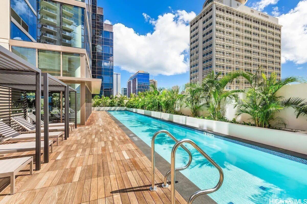 Sky Ala Moana is one of Honolulu’s new two tower developments, and it’s the first of its kind in Hawaii with one tower having a world renowned Renaissance Marriott Hotel and the other tower the Sky Ala Moana Residences. The synergy this provides is unparalleled with the opportunity to enjoy resort like amenities while having the comfort of your two bedroom, two bathroom condo. This high floor unit features 2 custom walk-in closets, large entry storage closet, Silestone quartz countertops, Bosch appliances, full size wash/dryer, split AC in each room, ceiling fans, floor to ceiling glass in all rooms, 96 square foot open air lanai which allows for breathtaking views of the city, ocean, mountains and sunsets. The convenience of two side by side, gated parking stalls plus storage. The 8th floor amenity deck is one of the largest in Honolulu. This oasis in the sky consists of two heated salt water pools. One being a 25 meter lap pool and the other is one of Honolulu’s largest residential pools. Enjoy the full service Renaissance Marriott pool bar, spa’s dry&wet sauna, furo, cold plunge, indoor/outdoor gym, 4 hot tubs, BBQ cabanas, party rooms and kids play areas. & Amazing Location!