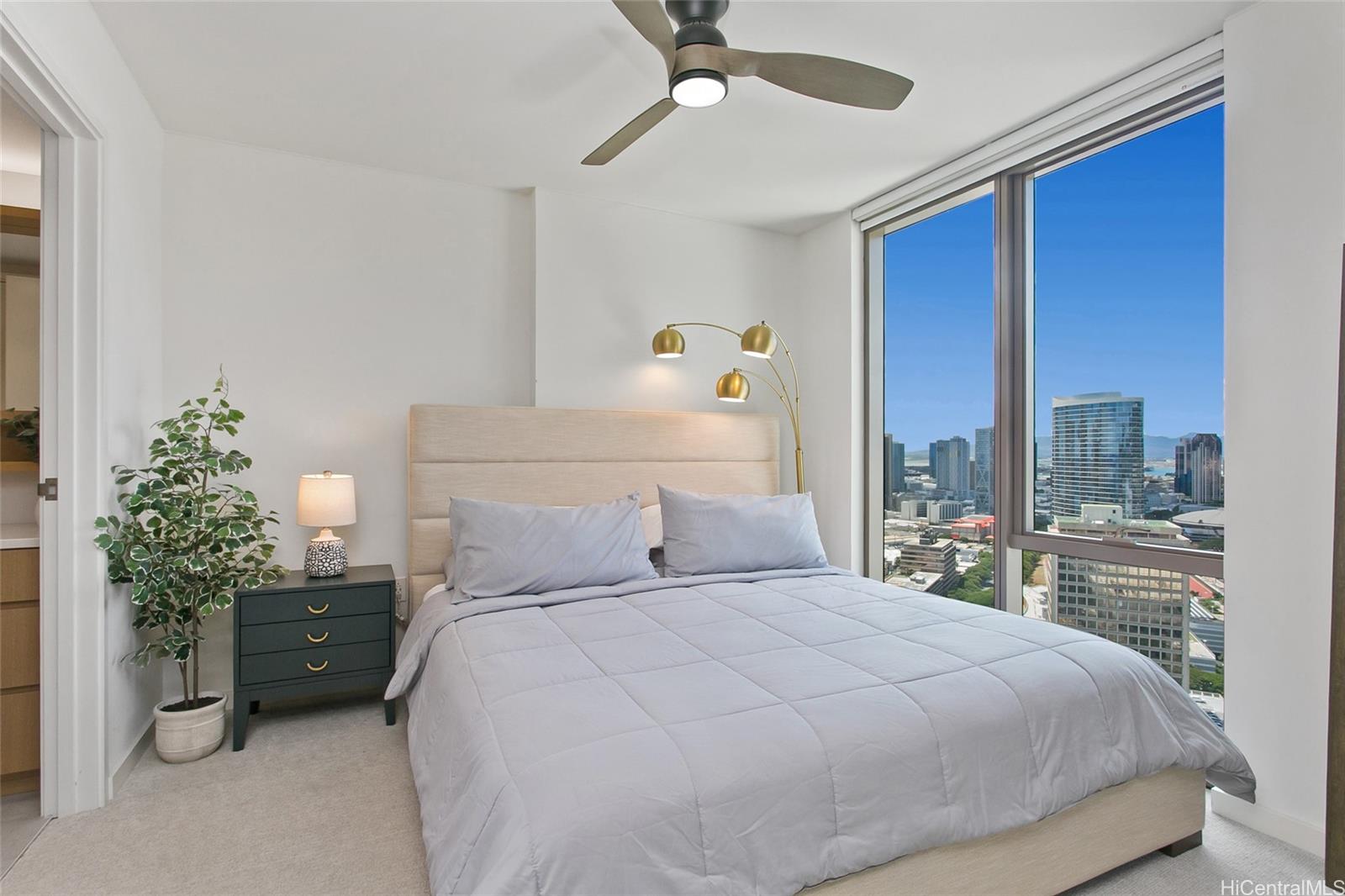 Sky Ala Moana is one of Honolulu’s new two tower developments, and it’s the first of its kind in Hawaii with one tower having a world renowned Renaissance Marriott Hotel and the other tower the Sky Ala Moana Residences. The synergy this provides is unparalleled with the opportunity to enjoy resort like amenities while having the comfort of your two bedroom, two bathroom condo. This high floor unit features 2 custom walk-in closets, large entry storage closet, Silestone quartz countertops, Bosch appliances, full size wash/dryer, split AC in each room, ceiling fans, floor to ceiling glass in all rooms, 96 square foot open air lanai which allows for breathtaking views of the city, ocean, mountains and sunsets. The convenience of two side by side, gated parking stalls plus storage. The 8th floor amenity deck is one of the largest in Honolulu. This oasis in the sky consists of two heated salt water pools. One being a 25 meter lap pool and the other is one of Honolulu’s largest residential pools. Enjoy the full service Renaissance Marriott pool bar, spa’s dry&wet sauna, furo, cold plunge, indoor/outdoor gym, 4 hot tubs, BBQ cabanas, party rooms and kids play areas. & Amazing Location!