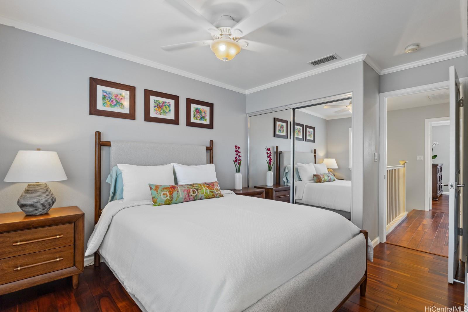 This beautifully maintained and updated TH is part of the sought after and rarely available Spinnaker Place TH increment 3 development in the heart of Ocean Pointe. This beautiful 3 bedroom/2.5 bath home with attached 2 car garage has numerous upgrades and refinements, including ceramic tile flooring downstairs and dark hard wood flooring upstairs, a whole house water softening/filtration system, crown molding, custom window trim, ceiling fans in every room and stainless steel appliances. This TH is located off the main roadway and offers a gated yard with covered lanai, facing a quiet courtyard. Spinnaker is known for its excellent amenities, including a beautiful community pool/spa, ample guest parking, and a lower water/sewer bill that is sub-metered with the HOA.The Lualani Shopping Center, Waikai lagoon and 24-hour Urgent Care are all just a few minutes drive away. At the Waikai lagoon you will experience Thursday’s Night Market, plus music concerts and special events throughout the year. If you like golf, this is the place for you! There are many excellent golf courses within a 3-4 mile radius, including Hoakalei private country club, Ewa 360, and Prince Golf Course.