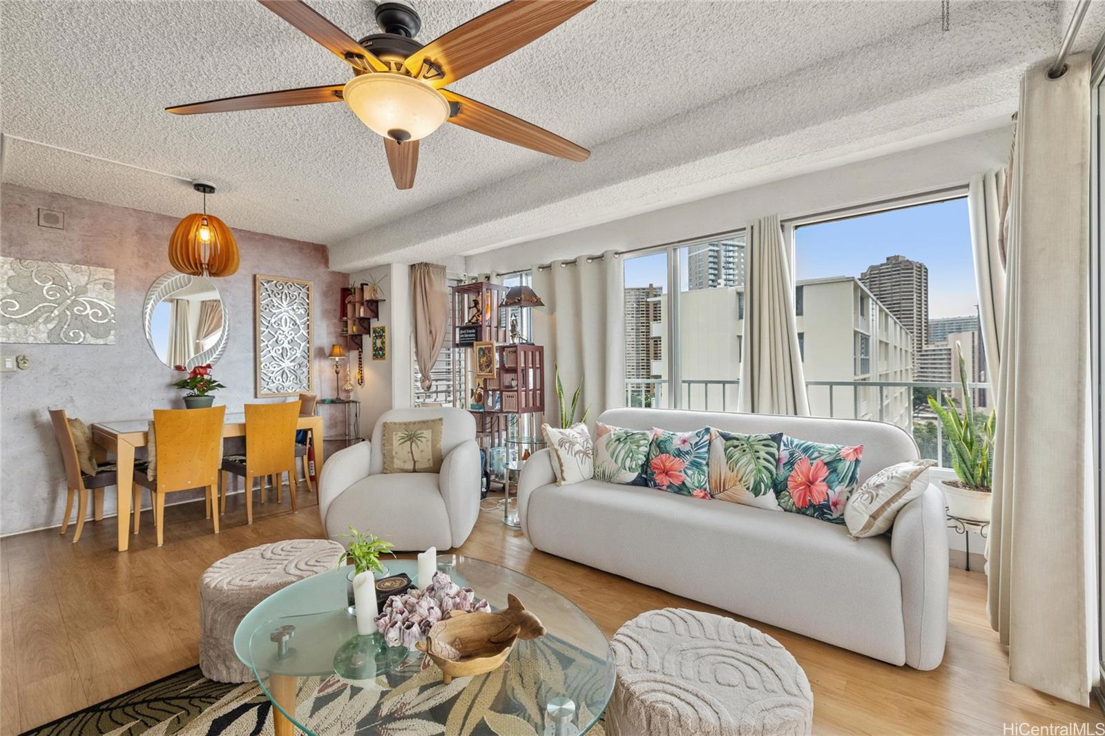 Welcome to Sunset Tower #1404, a cool and quiet corner residence offering spectacular panoramic ocean views stretching across Ala Moana Center, Magic Island, and beyond. Enjoy Friday night fireworks right from your spacious, open-covered lanai, an extended living space that spans the entire ocean-facing side of the home. This well-maintained 2-bedroom, 1.5-bath unit includes one assigned parking stall and a private storage locker for added convenience. The low maintenance fees, makes this a rare find in the heart of Ala Moana. Inside, you’ll appreciate numerous upgrades completed after the unit was purchased in 2011, along with the option to include all furnishings—perfect for a turnkey move-in or investment opportunity. Ideally situated near Waikiki, Ala Moana Shopping Center, world-class restaurants, beaches, and entertainment, Sunset Tower #1404 offers the ultimate blend of comfort, convenience, and island lifestyle. Don’t miss this chance to own a beautiful ocean-view home in one of Honolulu’s most desirable locations! Live the Lifestyle you always dreamed about! Seller may require to rent back for a couple months in 2026.