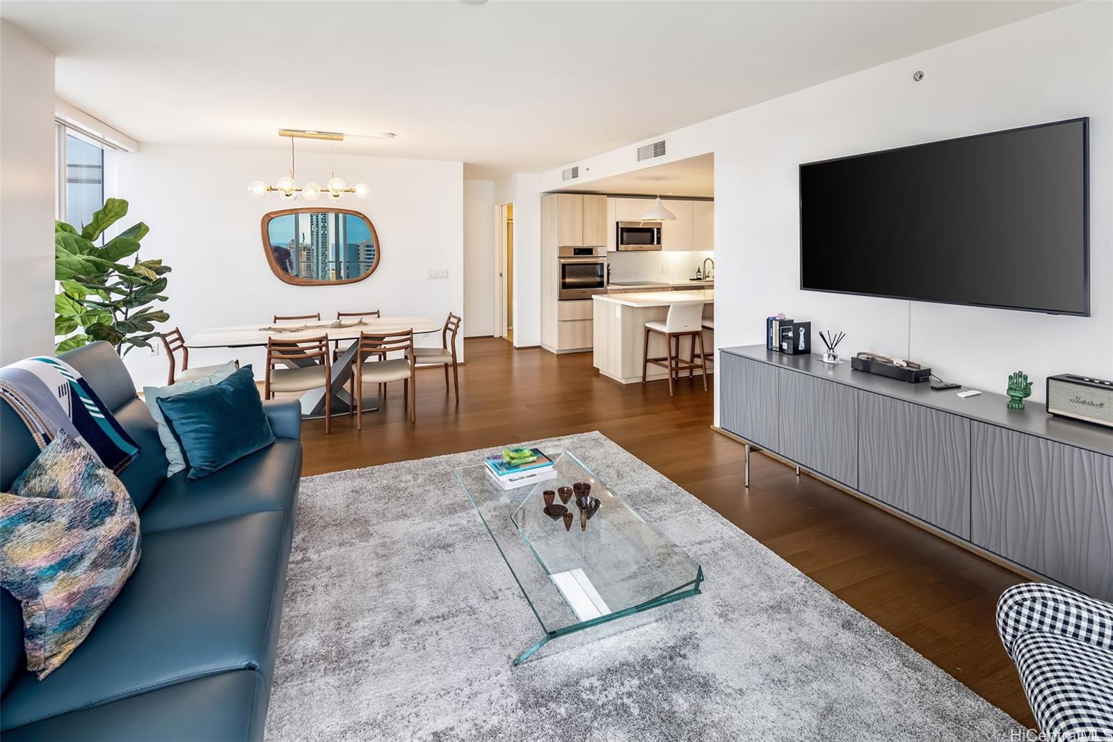 High-floor 3-bedroom condo in Kakaako with ocean, city and mountain views. This unit is move in ready and thoughtfully laid out for everyday living. From the moment you enter, the unit offers ocean views and with floor to ceiling windows that bring in steady, natural light, all throughout the day. The floor plan is practical and livable, featuring a separate laundry room, an open kitchen with a large island, and a living area that comfortably accommodates both relaxing and entertaining. The lanai seats 2+ and the sunsets from here are incredible. The kitchen features Studio Becker cabinetry, soft-close drawers, Bosch stainless steel appliances and a quartz countertop for the island. A great gathering place in this home is indeed the kitchen. Engineered hardwood flooring runs throughout the main living area and has been well maintained. Each room is equipped with motorized shades for heat and light control. The primary suite is spacious with incredible ocean views, walk in closet and a dual vanity. The unit comes with 2 side by side parking stalls. Pets are allowed. Building is centrally located to all the conveniences of a modern city like Honolulu is. Come see today!