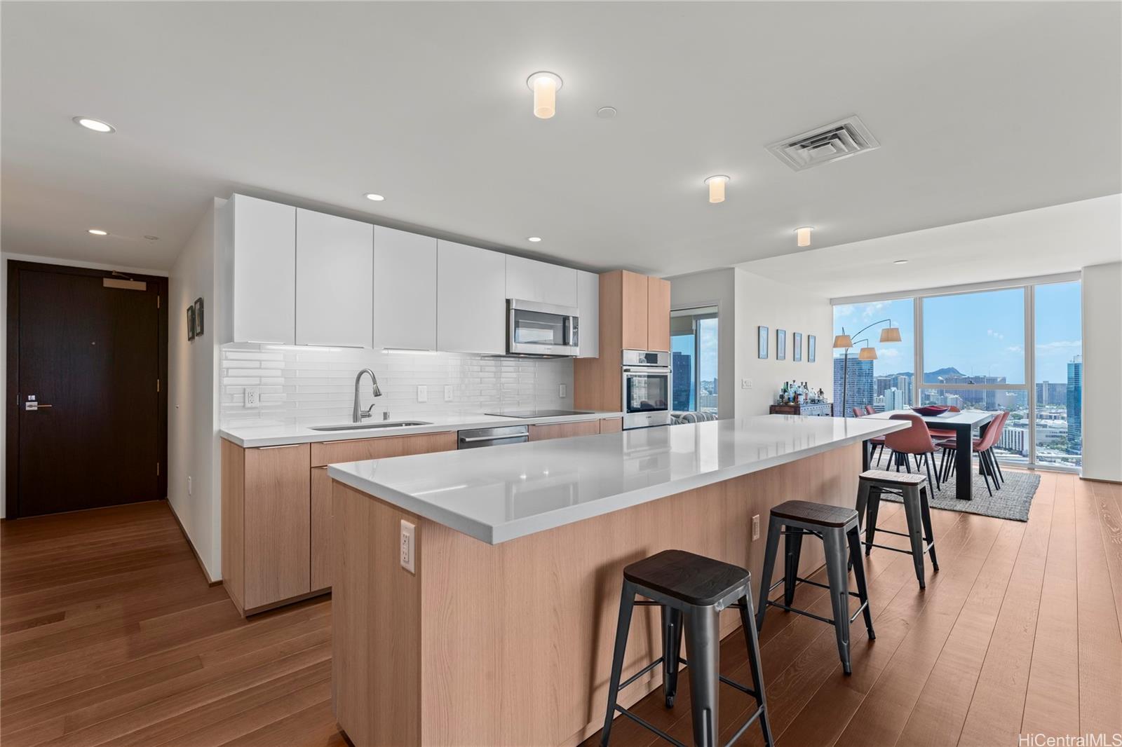 最も希少な「05」スタック ― 空に浮かぶデザイナーの夢!入手困難でありながら常に需要が高い高層階「05」スタックは、シンフォニー・ホノルルの至宝。最も憧れられる南東角に位置し、太平洋、ダイヤモンドヘッド、ホノルルのスカイラインを一望できる息をのむような眺望を提供します。 面積 1,500平方フィート フィート この角部屋の3ベッドルームは、モダンデザインと気取らないラグジュアリーの真髄と言える。 元の所有者によってほとんど使用されず、入念に手入れされてきた物件です。厳選された高級家具が完備されており、スムーズな入居を実現します。 スタジオ・ベッカーのキッチンは、ボッシュ製家電、クォーツカウンター、ビルトインワイン冷蔵庫、統合型コーヒーシステムを備え、優雅さと機能性を融合させています。 主寝室は特注の木工細工、スパを思わせるシャワー、ウォークインクローゼットを備え、プライベートな隠れ家のような雰囲気を醸し出しています。 充実した機能性を備えたこの間取りを、充実したランドリールームが完成させている。 リゾートスタイルのアメニティをお楽しみください:温水インフィニティプール、カバナ、BBQステーション、フィットネス&ヨガスタジオ、シアター、スパルーム、ゲストスイート、ドッグパーク。これら全てが、ホノルルで最も印象的なペットフレンドリーなタワーの一つに揃っています。 デザイン、テクノロジー、そして静けさが稀に見る融合を遂げた「05」スタックは、現代の暮らしの真髄を体現する。 .