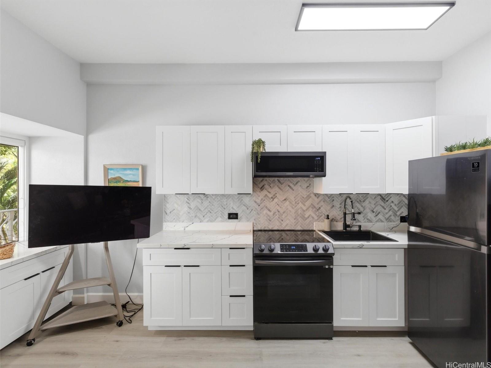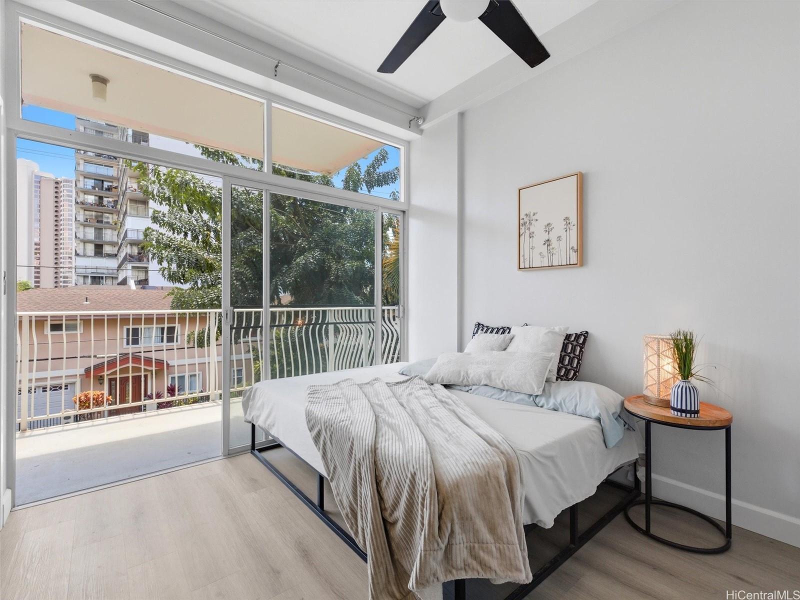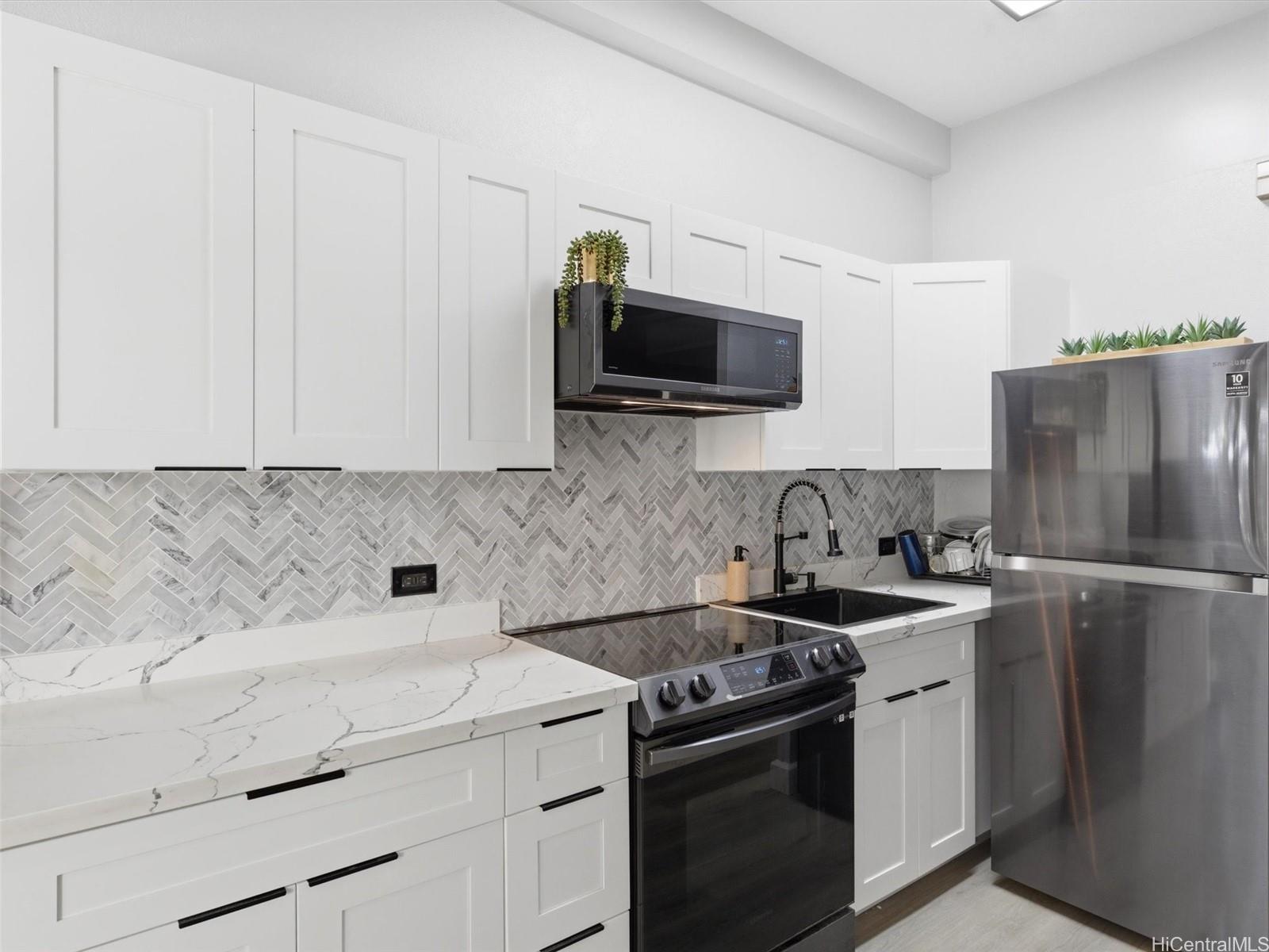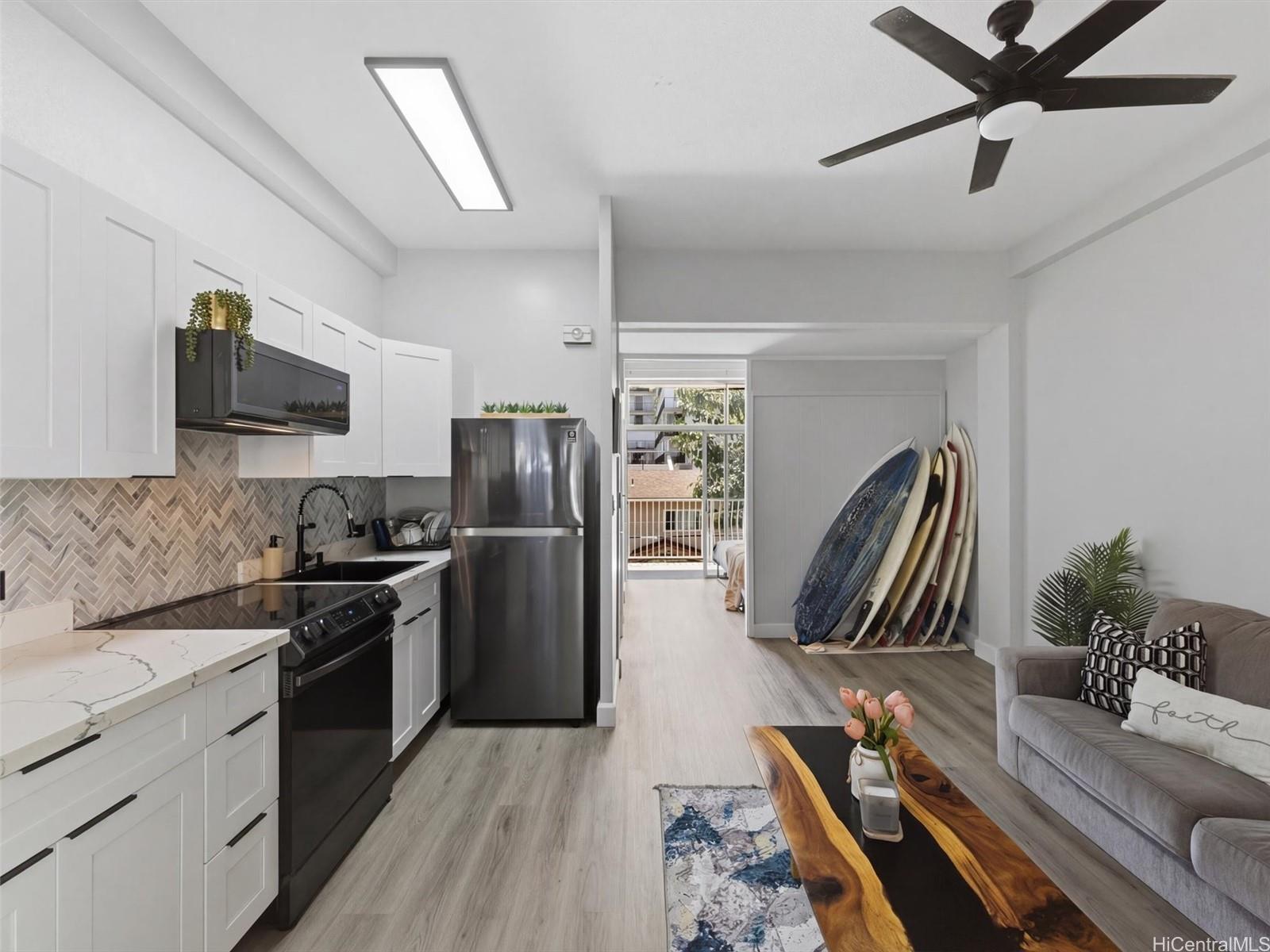 A complete renovation, prime location, and a full-size covered parking stall—this one checks every box. Experience the stunning upgrades of this beautifully renovated 1-bedroom gem in the heart of town. The kitchen sparkles with quartz counters, marble back splash, brand-new cabinets, and sleek black stainless steel appliances— including a large sink, refrigerator, stove/oven, and slim modern microwave. Open-concept with luxury vinyl plank flooring throughout. The bathroom has been fully refreshed with new fixtures, toilet, a renovated walk-in shower, and a stylish sink and faucet. Brand-new vinyl flooring, baseboards, lighting, and ceiling fans elevate the contemporary feel, while the freshly repainted interior creates a bright, inviting atmosphere. Every outlet, switch, and cover has been replaced for peace of mind. Enjoy the rare convenience of a covered, full-sized parking stall—hard to find in this area. Perfect for first-time buyers, medical professionals, students, or anyone seeking a move-in-ready home in Metro Honolulu. Don’t miss this opportunity to own a beautifully upgraded unit in an unbeatable location. Call for an appt now!