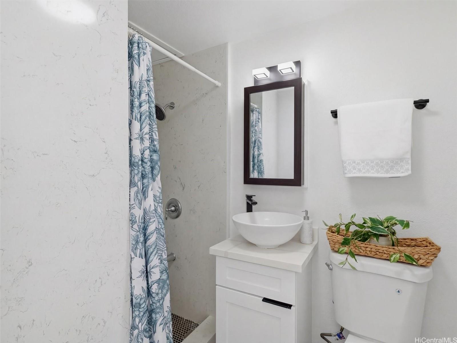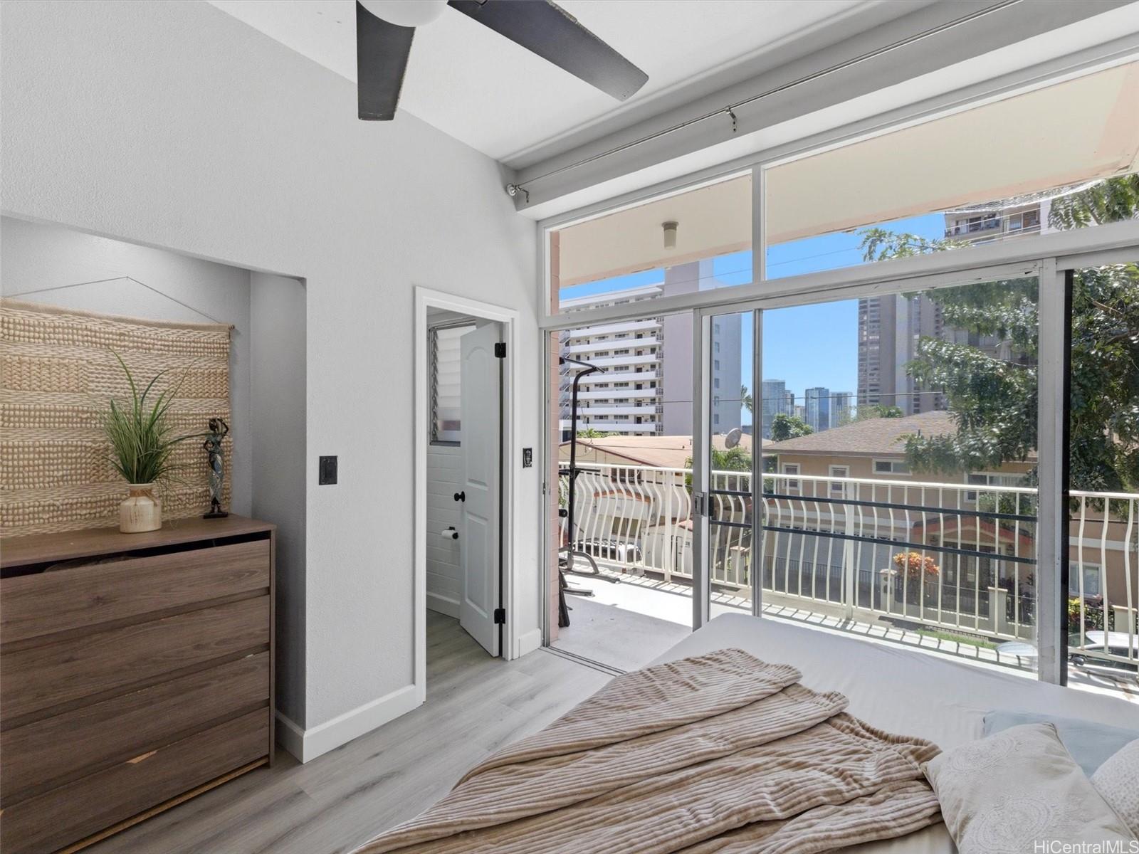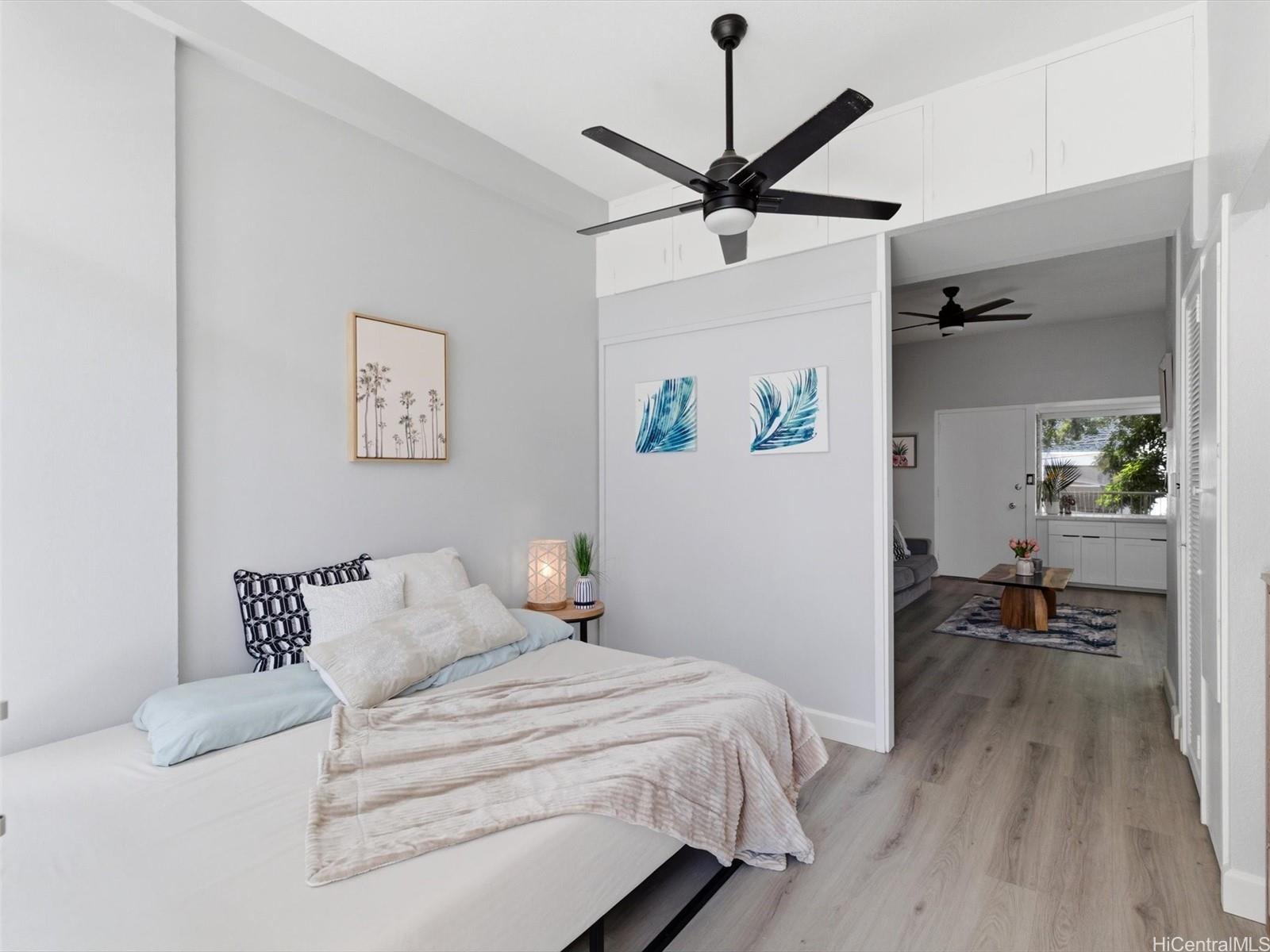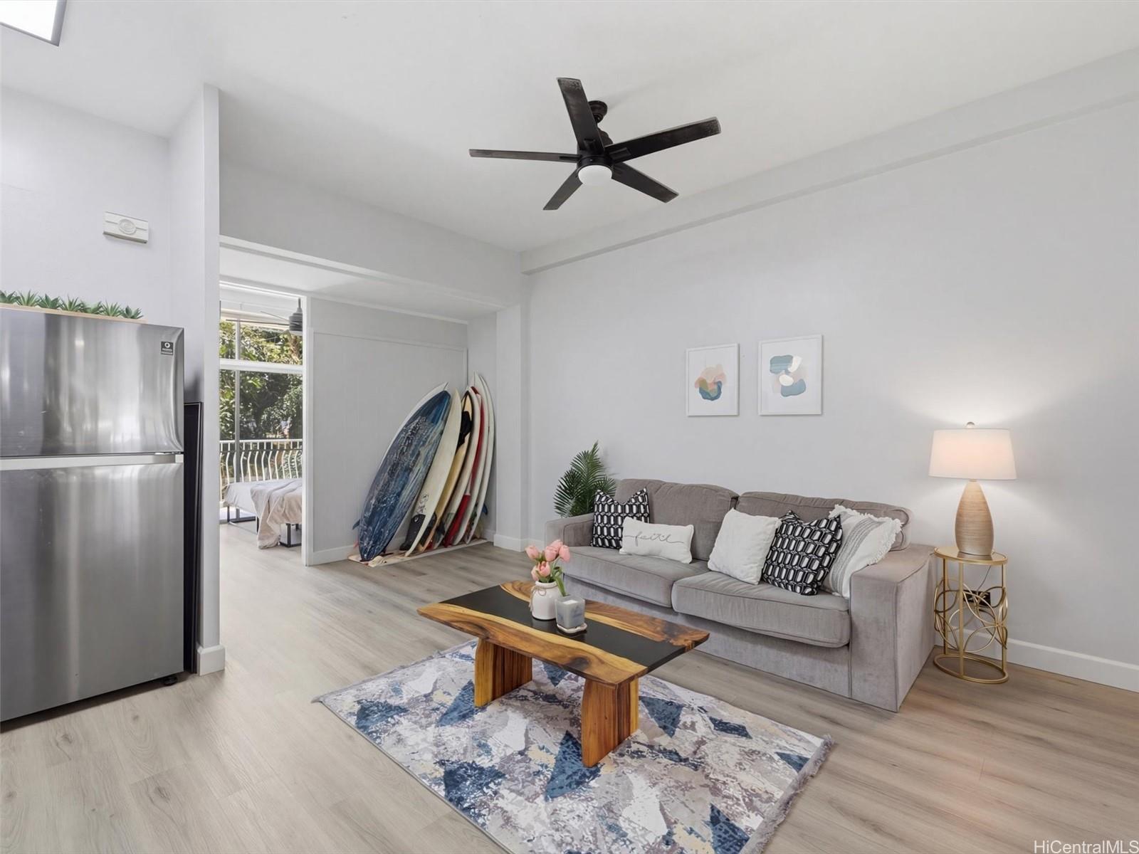 A complete renovation, prime location, and a full-size covered parking stall—this one checks every box. Experience the stunning upgrades of this beautifully renovated 1-bedroom gem in the heart of town. The kitchen sparkles with quartz counters, marble back splash, brand-new cabinets, and sleek black stainless steel appliances— including a large sink, refrigerator, stove/oven, and slim modern microwave. Open-concept with luxury vinyl plank flooring throughout. The bathroom has been fully refreshed with new fixtures, toilet, a renovated walk-in shower, and a stylish sink and faucet. Brand-new vinyl flooring, baseboards, lighting, and ceiling fans elevate the contemporary feel, while the freshly repainted interior creates a bright, inviting atmosphere. Every outlet, switch, and cover has been replaced for peace of mind. Enjoy the rare convenience of a covered, full-sized parking stall—hard to find in this area. Perfect for first-time buyers, medical professionals, students, or anyone seeking a move-in-ready home in Metro Honolulu. Don’t miss this opportunity to own a beautifully upgraded unit in an unbeatable location. Call for an appt now!