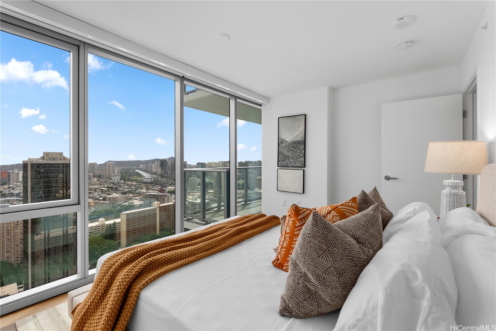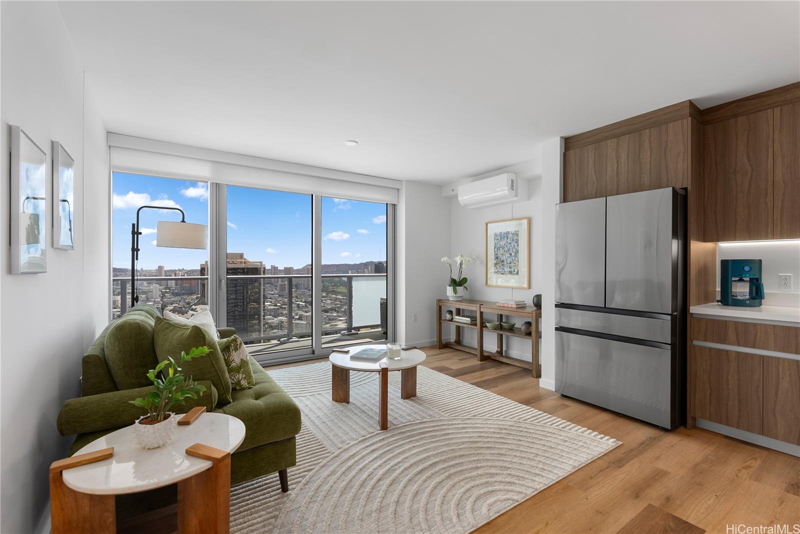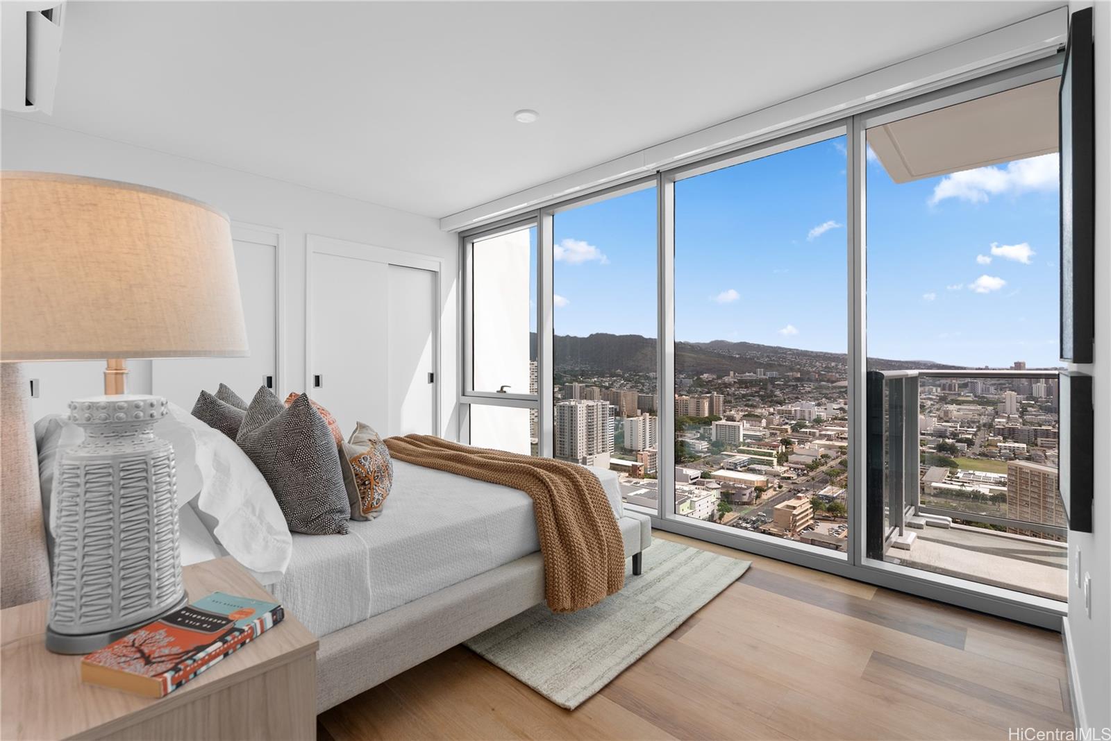 The Park on Ke’eaumoku is completed & resales present an EXCELLENT opportunity to buy NEW without the wait! Located in the Liona Tower, this preferred larger 1-bedroom, “07”unit is move-in ready, INCLUDING FURNITURE, AUTO WINDOW SHADES, HARDWOOD FLOORS! Ideal high-floor unit on the cooler east facing side, with unobstructed, sweeping mountain, Diamond Head, & Waikiki views. Enjoy colorful rainbows on misty mornings as the sun rises, & expansive city lights in the evenings. Wonderful, East facing breezes filter through the unit for those who prefer a fresh atmosphere of Hawaii’s clean air! The Park On Ke’aumoku is centrally located in urban Honolulu, within minutes to a wide variety of restaurants, Ala Moana Shopping Center, Ala Moana Beach park, nightlife & Honolulu’s lively urban scene. These resort style amenities make this price a bargain: INFINITY POOL, CABANAS, WHIRLPOOL SPA, BBQ PAVILIONS, CLUB ROOM, FITNESS, YOGA STUDIO, SAUNA, CO-WORK SPACES, MEDIA LOUNGE & PRIVATE MOVIE THEATER. As building costs continues to rise, Honolulu’s newest residential landmark condominium, offers the perfect first time home, investment or vacation retreat!