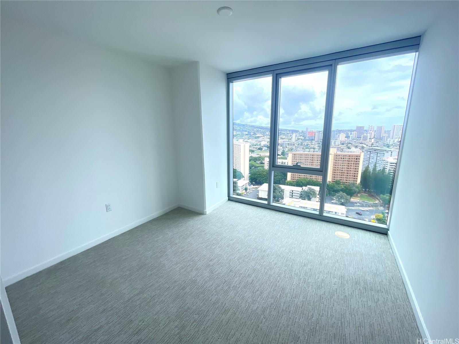 Perched high on the 25th floor, this refined corner residence in Rycroft Tower offers a peaceful retreat above the city. Floor-to-ceiling windows frame sweeping ocean and Diamond Head views, while a spacious wraparound lanai extends your living space into the open sky. Interior features include luxury vinyl plank flooring in both bedrooms, quartz countertops, premium stainless steel appliances, and an in-unit washer/dryer. A quiet split AC system ensures year-round comfort. The resort-style amenity deck features an infinity-edge pool and spa, multiple BBQ and lounge pavilions, a theater room, co-working and media spaces, and a fitness center with yoga studio and sauna. Secure covered parking, EV charging stations, bike storage, pet-friendly policies, and 24-hour security add ease to everyday living. Ideally located near Ward Village, Ala Moana Center, and Oahu’s best beaches, this home offers elevated island living with exceptional convenience. Watch daylight soften into warm ocean tones as sunset colors drift across the skyline and sea. Where modern design and panoramic horizons meet at the edge of the sky.