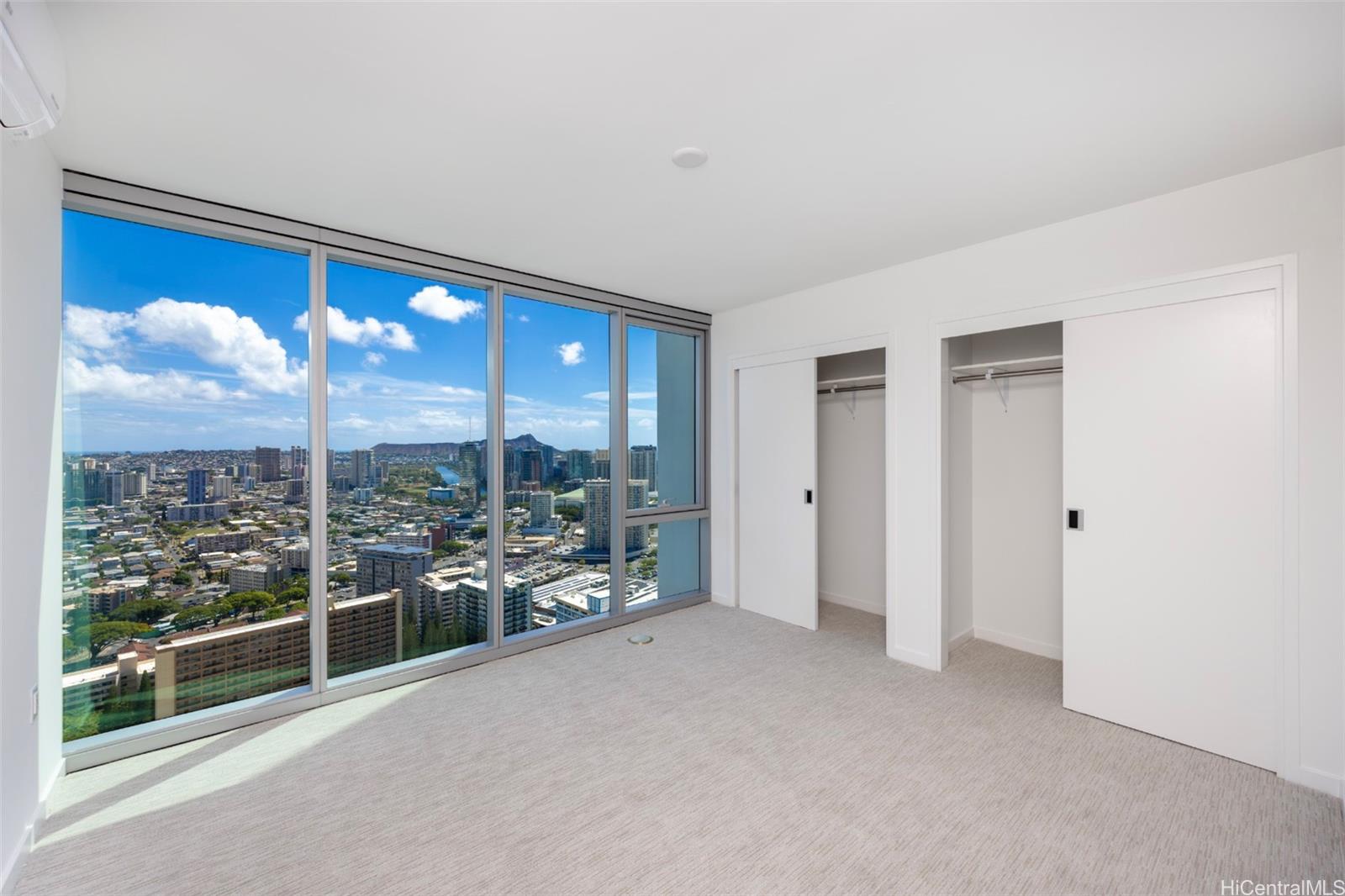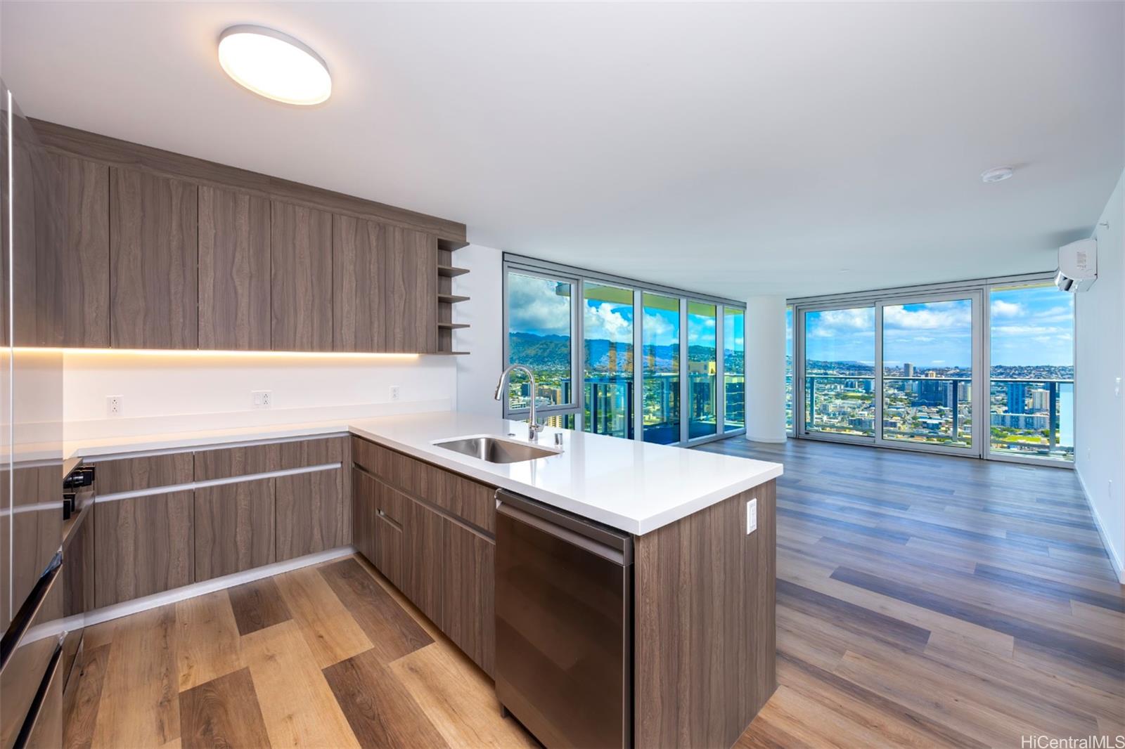 The Park on Keeaumoku is Honolulu’s newest high-rise destination, just completed in Q4 2025. This high-floor, mauka-corner 2-bedroom, 2-bath residence situated on the 39th floor of the Rycroft tower enjoys stunning Diamond Head, Pacific Ocean, tranquil Kookau Mountain and urban Honolulu views from the living room, wrap-around lanai, and both bedrooms. Features include a contemporary kitchen with quartz countertops, stainless appliances, and built-in bar seating, luxury vinyl plank flooring, modern fixtures, plus a primary bedroom with a walk-in closet and double-vanity ensuite bath. Enjoy on-site resort amenities including an infinity-edge pool and hot tub, ample pool seating and cabanas, multiple open and covered barbecue pavilions, an exercise gym, yoga studio, meeting room, movie theater, co-working space, and much more. Exceptional island living meets unforgettable views – welcome home to The Park on Keeaumoku #3901R. Listing includes enhanced photos.
