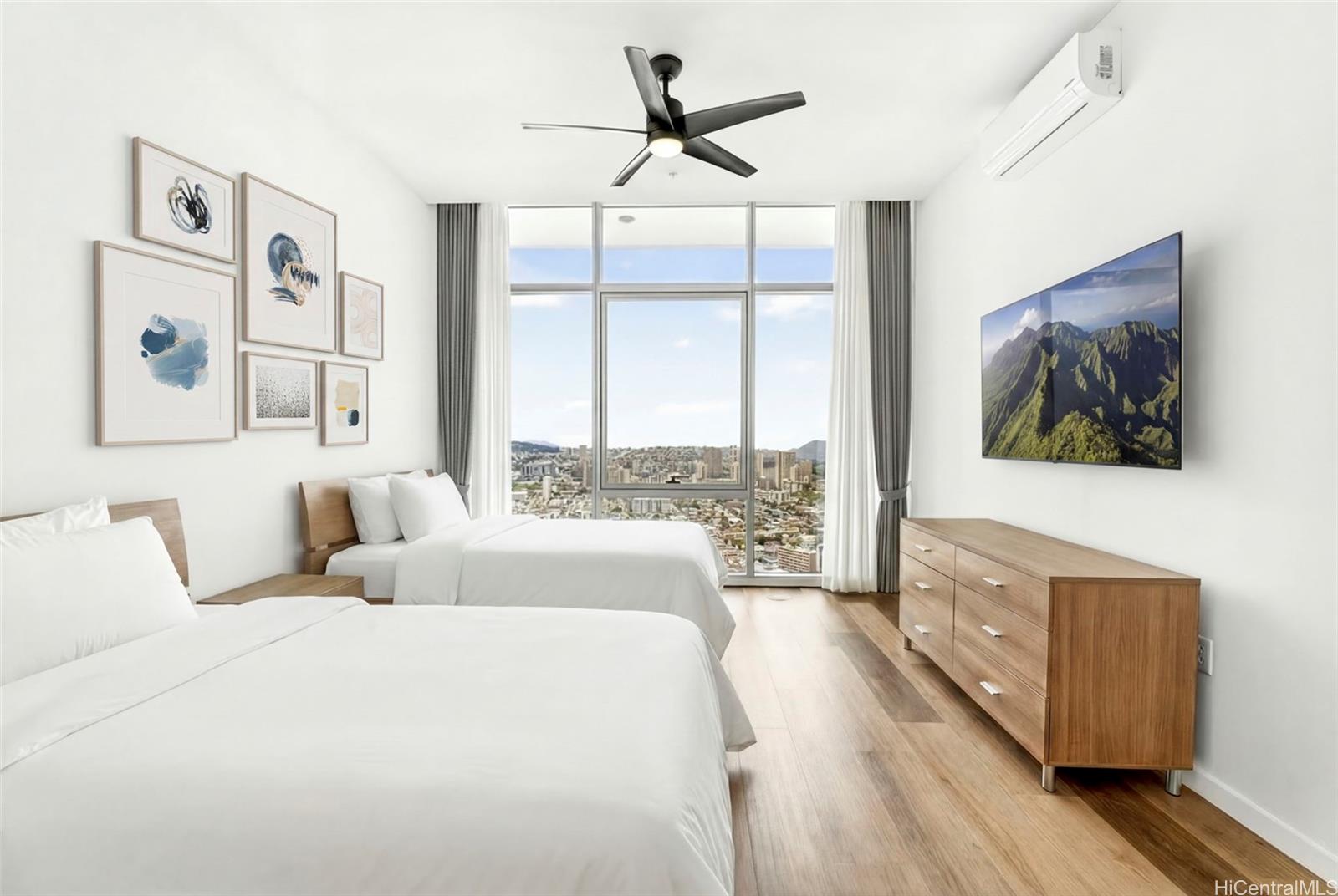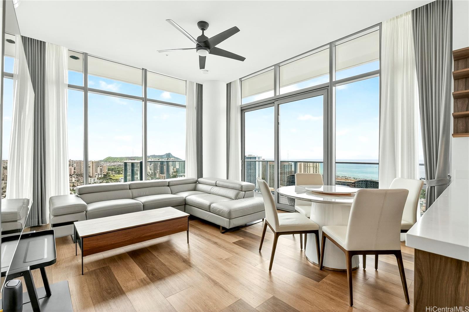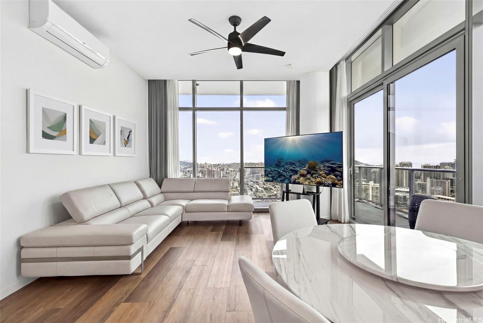Discover true island modern living in this luxurious penthouse corner residence on the 44th floor of The Park on Keeaumoku. Boasting one of the largest 2-bedroom floor plans in the building, this rare 2-bedroom, 2-bathroom, 2-parking home offers high ceilings, expansive windows, and breathtaking panoramic views of Diamond Head, the ocean, mountains, and dazzling city lights. The open-concept design is complemented by premium finishes and abundant natural light, creating a refined living experience that is both elegant and inviting. Enjoy resort-style amenities including a pool, sauna, fitness center, yoga room, lounges, and beautifully landscaped outdoor spaces, all set within one of Honolulu’s most vibrant and walkable neighborhoods.