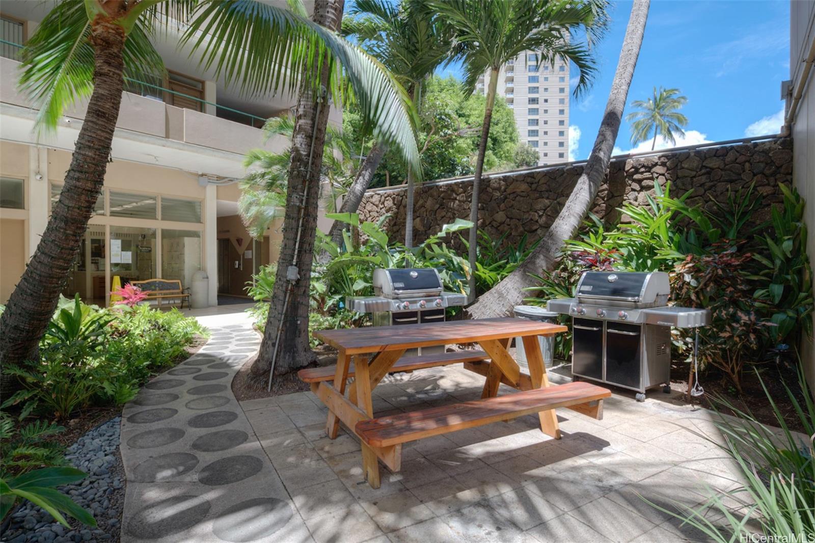 The best possible location imaginable. At the entrance to Waikiki – just past the Bridge over the Ala Wai Canal- near Ala Moana Beach Park and Magic Island. Steps from world famous Ala Moana Shopping Center, and its wonderful places to shop, snack, dine, and surrender to treats of all kinds from all over the World! Just across from Famous Ilikai Hotel and Hawaii Prince Hotel. Take a short evening stroll to look at the sailboats on the pathways of the Ala Wai Boat Harbor, then walk to the Hilton Hawaiian Village Beach and the Hilton Lagoon. A quick dip in the water is a grand treat – or slip in for a moonlight swim!!!Stroll back to the Tradewinds, and enjoy the beautifully landscaped grounds with flowering tropical plants. Toss your steaks or veggies onto the Grills on the grounds, and eat your lunch or dinner under a swaying coconut tree doing a gentle hula in the breeze. Or just swim in the pool and count yourself lucky to be here. Weekend and nighttime security guards, keyed entry gates and elevators keep intruders out. Short term rentals are not allowed. Some owners like to spilt their time between homes elsewhere and here. Who can blame them? Paradise realized right here.