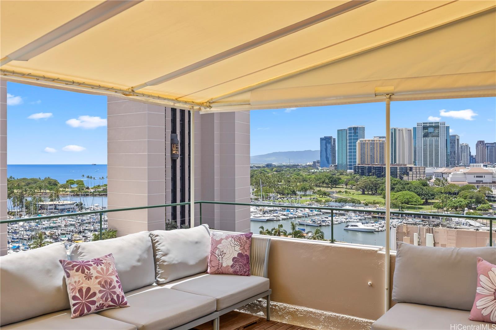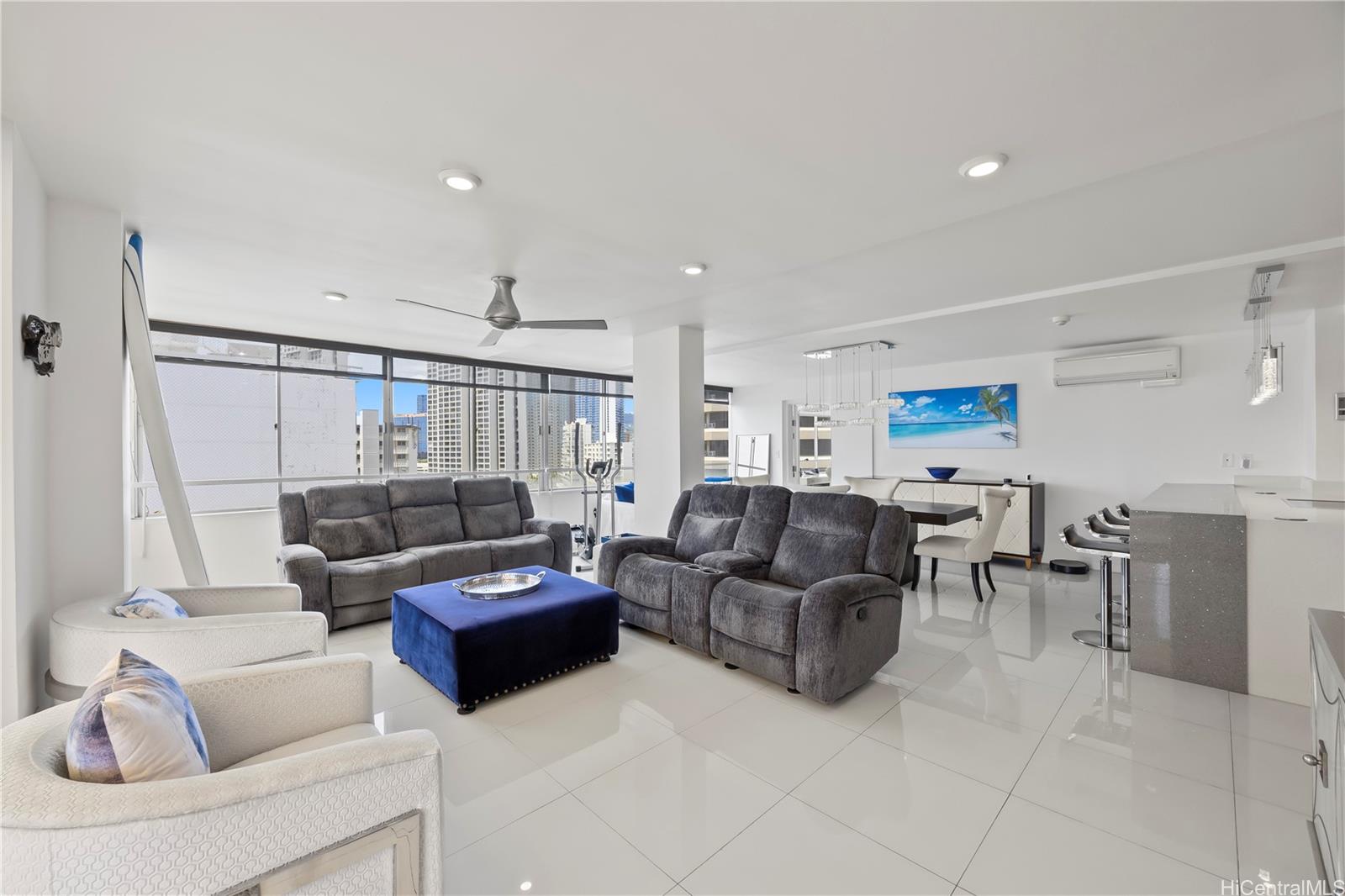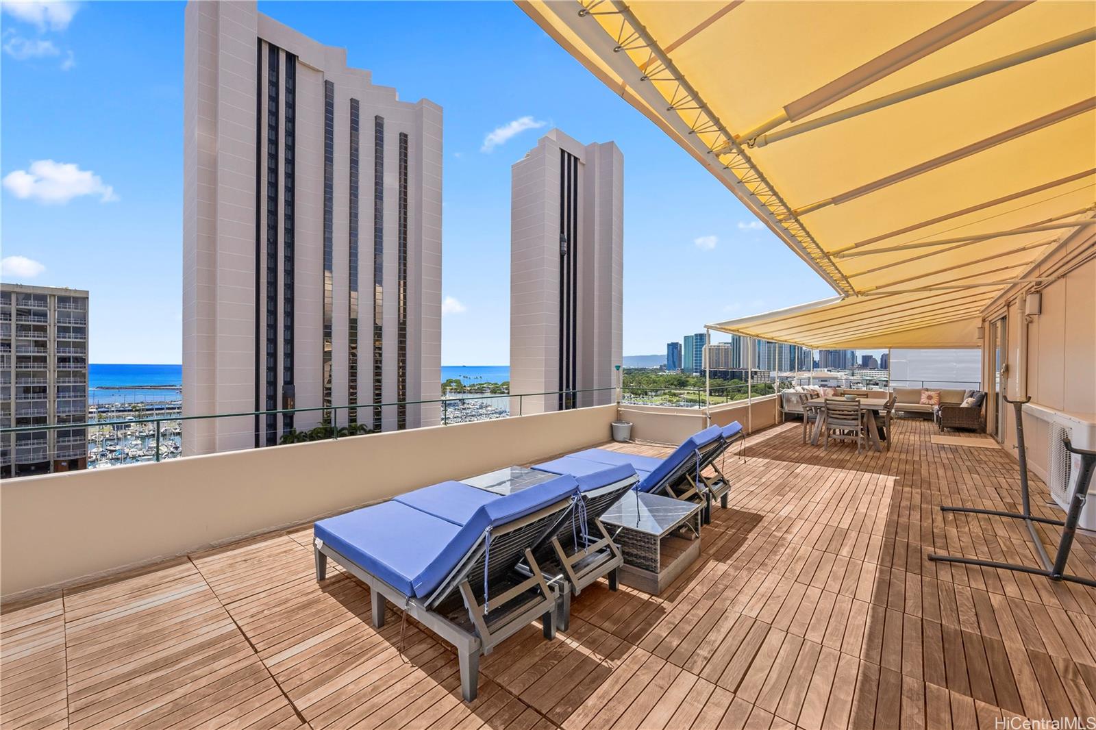 Enjoy island living in this rare combined penthouse residence—Units 1506A and 1507A—at Tradewinds Hotel Inc. This well-maintained, fully furnished 3-bedroom, 2-bath leasehold condo features an upgraded kitchen with modern finishes, a built-in coffee bar, and updated bathrooms for added comfort and style. The bright, open layout welcomes natural light and trade winds, creating a comfortable indoor-outdoor feel. Step outside to the expansive 948-square-foot rooftop deck, ideal for relaxing or entertaining while enjoying marina and city views. Conveniently located in Waikiki, this residence is near beaches, surf spots, Ala Moana Center, dining, shopping, and everyday essentials, offering a blend of comfort, convenience, and island living.