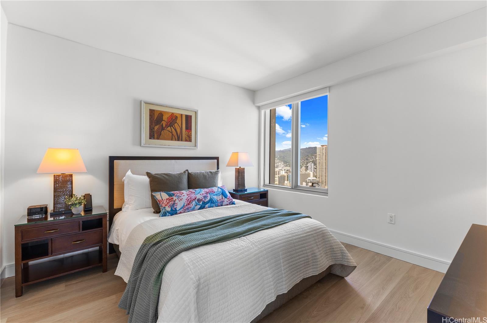 Just minutes from Waikiki Beach, this elegantly upgraded corner unit offers true resort-style living. Enjoy convenient access to a wide variety of nearby restaurants, as well as on-site dining and room-service options available through the hotel.Take in sweeping panoramic views of the city skyline framed by the mountains, Koko Crater and Koko Head in Hawaii Kai, Diamond Head, and the iconic Pink Palace with Waikiki Beach as its backdrop. Relax on two separate lanais: one off the primary bedroom facing the ocean and the other off the living-dining area with beautiful mountain views.The residence features a well-equipped kitchen, generously sized bathrooms, ample storage—including a walk-in closet in the primary bedroom—and thoughtful details throughout.Recent updates include brand-new engineered hardwood floors, adding a gentle sense of warmth and comfort throughout the home. It is a place that truly soothes the heart, reminding you how important the floor can be. New modern roller shades are designed to maximize the stunning 180-degree views unique to this corner unit. Experience luxury island living at its finest.