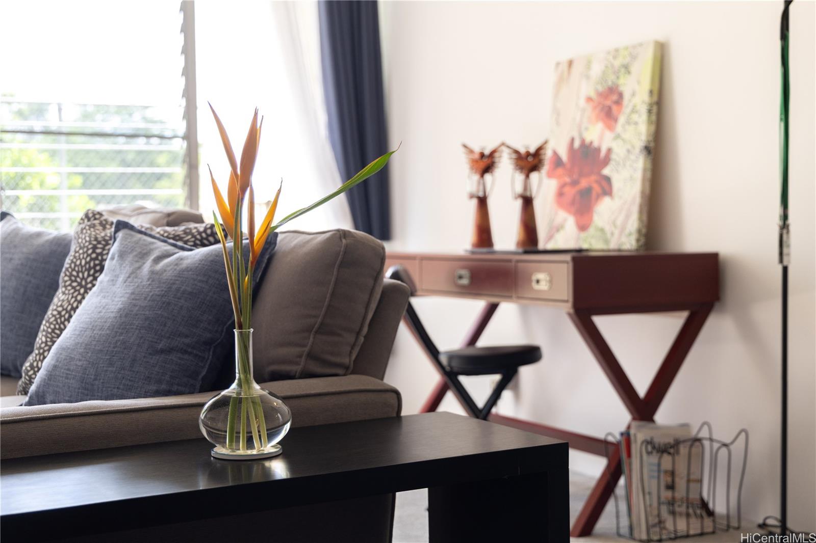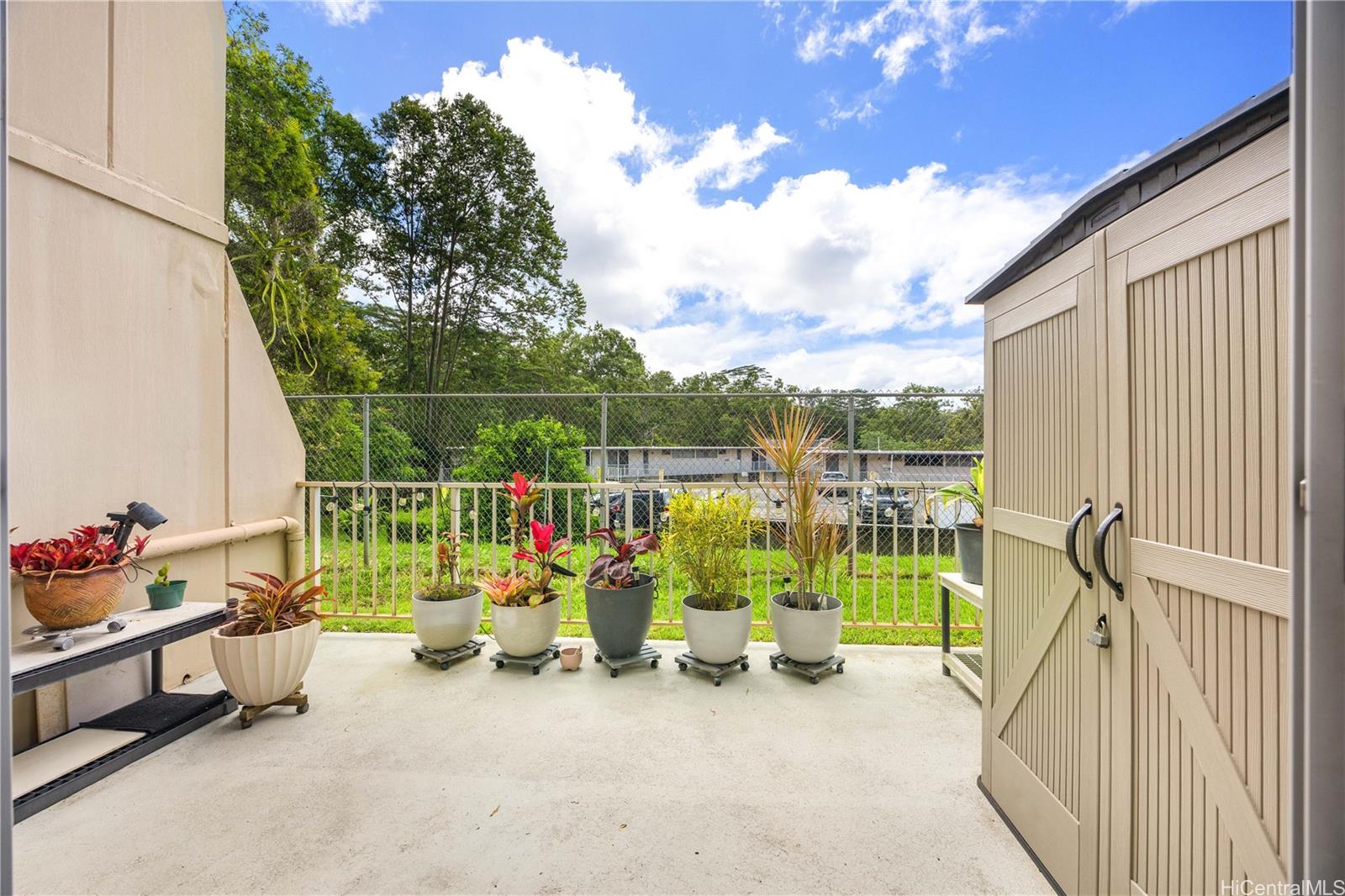 This beautifully upgraded, fully furnished, condo offers exceptional privacy, quiet, and quality. Positioned at the rear of the complex, away from traffic and common areas, Building B at Valleyview overlooks open green space and soaring Rainbow Eucalyptus canopy — a setting known to command a consistent market premium. Seldom available ground floor unit with peaceful views from two private, gated, lanais. Solid concrete construction and top-of-valley position cooled by trade winds create a naturally calm environment. Thoughtfully upgraded – smoothed concrete walls, fresh paint, updated plumbing and electrical, remodeled kitchen with Staron countertops, solid wood cabinetry, and built-in office. Structural and lasting improvements, not cosmetic gestures. Additional features include: an in-unit W/D, 2 BOD approved ACs, dedicated storage shed, 2 covered parking, and ample guest parking. It’s very PET friendly with a huge pool, BBQ areas, and is just up the hill from Melemanu park with a playground, basketball, and ball fields. Easy access to Costco, Walmart, restaurants, Mililani Town Center for shopping, Schofield/Wheeler, and North Shore, come visit our OH on 4-12-26 from 2-5pm.