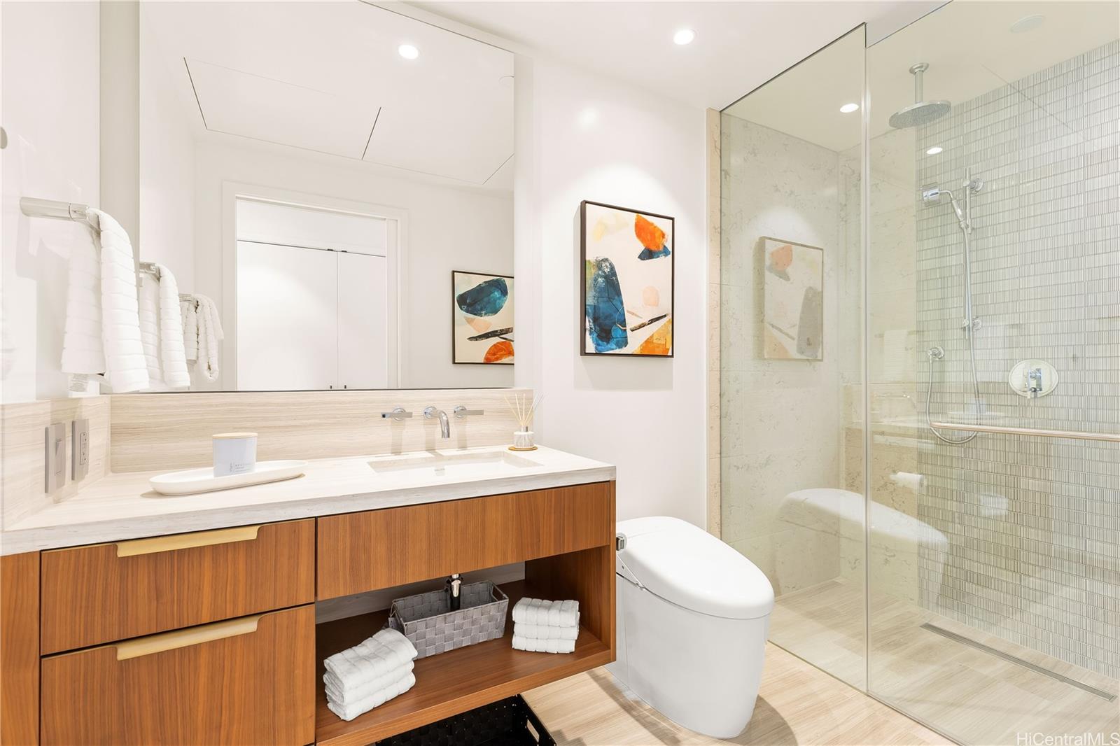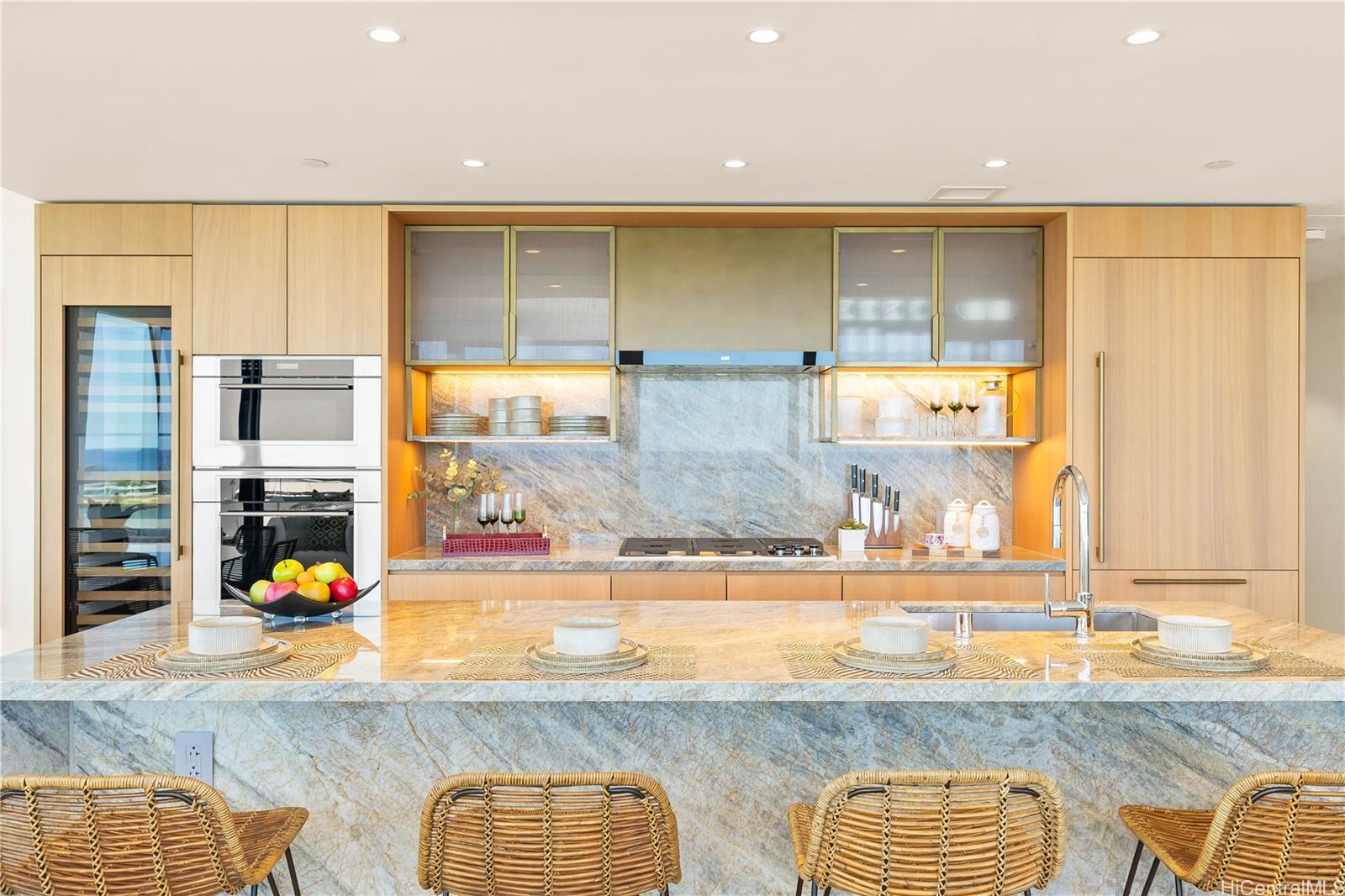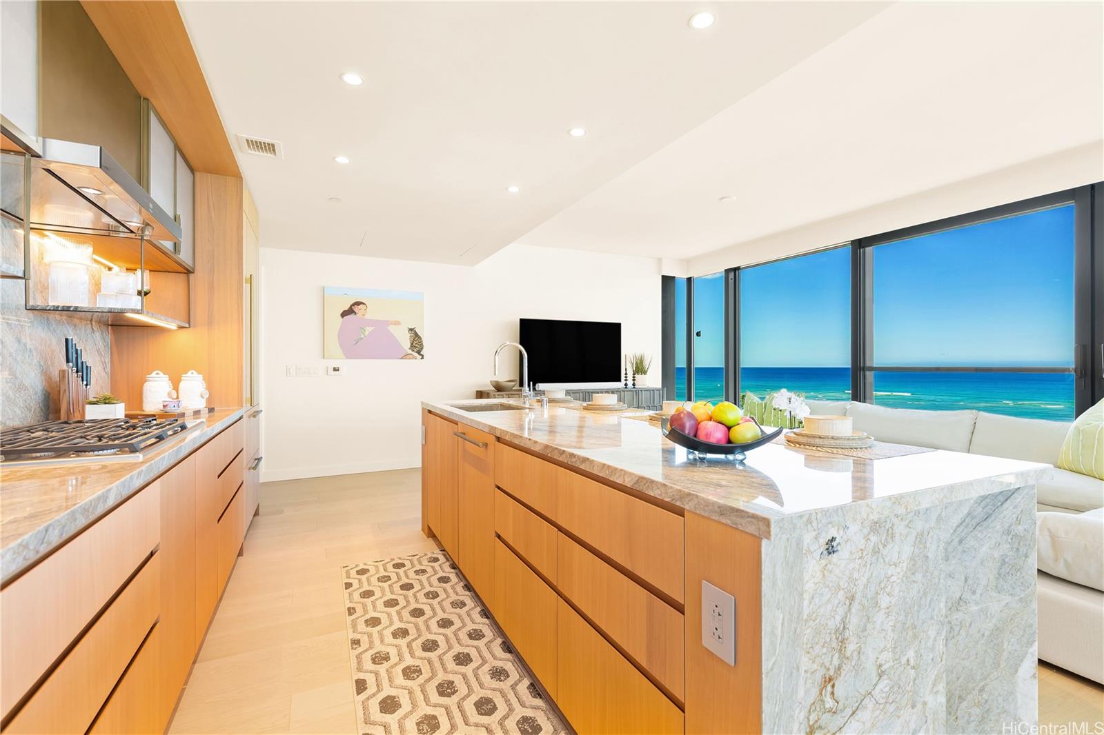 海と夕日を一望できる眺望! ワード・ビレッジの最新高級オーシャンフロント・レジデンス「ヴィクトリア・プレイス」にある、人気の高い3ベッドルーム・3バスルームの住居で、格別な島暮らしをご体験ください。 床から天井までの大きなガラス窓が、広々としたオープンレイアウトの中で、雄大な海の景色と黄金色の夕日を美しく切り取っています。 家具一式付きで、使用感もほとんどなく状態は極めて良好です。全室に電動ブラインド、ビデ付きトイレ、特注の主寝室用クローゼットシステムを完備。さらに、ホノルルの都心部では貴重な利便性となる、珍しい並列駐車スペースの間に設置された専用EV充電ステーションも備えています。 洗練されたインテリアは、彫刻のような美しさを持つクォーツサイトのアイランドを核とし、Wolf製の家電、Sub-Zero製の冷蔵庫、明るい色の木製フローリング、そしてテクスチャー加工が施されたガラスのキャビネットが配されています。 ヴィクトリア・プレイスでは、24時間体制のセキュリティに加え、プール、最新設備を備えたフィットネスセンター、スパ、スチームルームやサウナ、プライベートラウンジ、シアター、ゲストスイート、そして優雅なエンターテイメントスペースなど、厳選されたリゾートスタイルの設備を完備しています。 ワード・ビレッジの中心部に位置し、ショッピング、飲食店、ビーチ、そして生活に必要な各種サービスがすぐそばにあるため、住民は手間いらずの贅沢な暮らしを楽しむことができます。 .